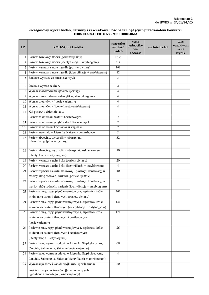 Załącznik nr 2 do SIWKO nr ZP/01/14/KO Szczegółowy wykaz badań , terminy i szacunkowa ilość badań będących przedmiotem konkursu FORMULARZ OFERTOWY - MIKROBIOLOGIA LP. RODZAJ BADANIA szacunko wa ilość badań 1 Posiew ilościowy moczu (posiew ujemny) 1232 2 Posiew ilościowy moczu (identyfikacja + antybiogram) 314 3 Posiew wymazu z nosa i gardła (posiew ujemny) 108 4 Posiew wymazu z nosa i gardła (identyfikacja + antybiogram) 12 5 Badanie wymazu ze zmian skórnych 3 6 Badanie wymaz ze skóry 2 8 Wymaz z owrzodzenia (posiew ujemny) 4 9 Wymaz z owrzodzenia (identyfikacja+antybiogram) 4 10 Wymaz z odleżyny ( posiew ujemny) 4 11 Wymaz z odleżyny (identyfikacja+antybiogram) 4 12 Kał posiew u dzieci do lat 2 1 13 Posiew w kierunku bakterii beztlenowych 2 14 Posiew w kierunku grzybów drożdźopodobnych 2 15 Posiew w kierunku Trichomonas vaginalis 2 16 Posiew materiału w kierunku Neisseria gonorrhoeae 2 17 Posiew plwociny, wydzieliny lub aspiratu oskrzelowego(posiew ujemny) 32 18 Posiew plwociny, wydzieliny lub aspiratu oskrzelowego 10 (identyfikacja + antybiogram) 19 Posiew wymazu z ucha i oka (posiew ujemny) 20 20 Posiew wymazu z ucha i oka (identyfikacja + antybiogram) 4 21 Posiew wymazu z cewki moczowej, pochwy i kanału szyjki 10 macicy, dróg rodnych, nasienia (posiew ujemny) 22 Posiew wymazu z cewki moczowej, pochwy i kanału szyjki 2 macicy, dróg rodnych, nasienia (identyfikacja + antybiogram) 23 Posiew z rany, ropy, płynów ustrojowych, aspiratów i żółci 200 w kierunku bakterii tlenowych (posiew ujemny) 24 Posiew z rany, ropy, płynów ustrojowych, aspiratów i żółci 140 w kierunku bakterii tlenowych (identyfikacja + antybiogram) 25 Posiew z rany, ropy, płynów ustrojowych, aspiratów i żółci 170 w kierunku bakterii tlenowych i beztlenowych (posiew ujemny) 26 Posiew z rany, ropy, płynów ustrojowych, aspiratów i żółci 26 w kierunku bakterii tlenowych i beztlenowych (identyfikacja + antybiogram) 27 Posiew kału, wymaz z odbytu w kierunku Staphylococcus, 68 Candida, Salmonella, Shigella (posiew ujemny) 28 Posiew kału, wymaz z odbytu w kierunku Staphylococcus, 4 Candida, Salmonella, Shigella (identyfikacja + antybiogram) 29 Wymaz z pochwy i kanału szyjki macicy w kierunku nosicielstwa paciorkowców - hemolizujących i gronkowca złocistego (posiew ujemny) 60 cena jednostko wa badania wartość badań czas oczekiwan ia na wynik 30 Wymaz z pochwy i kanału szyjki macicy w kierunku nosicielstwa paciorkowców 8 hemolizujących i gronkowca złocistego (identyfikacja + antybiogram) ŁACZNA WARTOŚC BADAŃ …………………………….dnia …………………… …………………………………………………… Podpis osoby uprawnionej do reprezentowania firmy