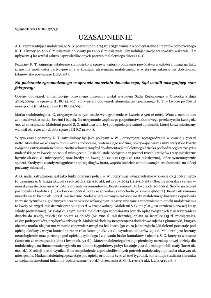 Sygnatura III RC 32/13 UZASADNIENIE A. G. reprezentująca małoletniego S. G. pozwem z dnia 24.01.2013r. wniosła o podwyższenie alimentów od pozwanego K. T. z kwoty po 700 zł miesięcznie do kwoty po 1200 zł miesięcznie. Uzasadniając swoje stanowisko wskazała, iż z upływem 4 lat wzrósł zakres usprawiedliwionych potrzeb małoletniego dziecka S. G.. Pozwany K. T. zajmując ostateczne stanowisko w sprawie wniósł o oddalenie powództwa w całości z uwagi na fakt, iż nie ma możliwości partycypowania w kosztach utrzymania małoletniego w większym zakresie niż dotychczas. (stanowisko pozwanego k.235 akt). Na podstawie zgromadzonego w sprawie materiału dowodowego, Sąd ustalił następujący stan faktyczny: Obecny obowiązek alimentacyjny pozwanego orzeczony został wyrokiem Sądu Rejonowego w Otwocku z dnia 27.05.2009r. w sprawie III RC 121/09, który ustalił obowiązek alimentacyjny pozwanego K. T. w kwocie po 700 zł miesięcznie (d. akta sprawy III RC 121/09). Matka małoletniego A. G. otrzymywała w tym czasie wynagrodzenie w kwocie 2 526 zł netto. Wraz z małoletnim zamieszkiwała z matką, braćmi i babcią. Na utrzymanie wspólnego gospodarstwa domowego przekazywała kwotę ok. 300 zł. miesięcznie. Małoletni powód S. G. miał dwa lata, był pod opieką prywatnej opiekunki, której koszt miesięczny wynosił ok. 1500 zl. (d. akta sprawy III RC 121/09). W tym czasie pozwany K. T. zatrudniony był jako policjant w W. , otrzymywał wynagrodzenie w kwocie 3 700 zł netto. Mieszkał we własnym domu wraz z rodzicami, bratem i jego rodziną, pokrywając wraz z nimi wszystkie koszty związane z utrzymaniem domu. Nadto zobowiązany był do alimentacji małoletniego dziecka pochodzącego ze związku małżeńskiego w kwocie po 700 zł miesięcznie. Posiadał stałe obciążenia w postaci trzech kredytów (raty miesięczne łącznie ok.800 zł. miesięcznie) oraz kredyt na kwotę 50 000 zł (1310 zł.-rata miesięczna), które systematycznie spłacał. Kredyty te zostały zaciągnięte na spłatę długów brata, współwłaściciela zabudowanej nieruchomości, na której pozwany mieszkał . A. G. nadal zatrudniona jest jako funkcjonariusz policji w W., otrzymuje wynagrodzenie w kwocie ok.3 100 zł netto (d. zeznania A. G. k.234 akt, pit za rok 2012 k.121-126 akt, pit za rok 2013 k.111-116 akt). Obecnie mieszka z synem w mieszkaniu służbowym w W., które musiała wyremontować. Koszty remontu to kwota ok. 10.000 zł. Środki na ten cel pochodziły z kredytu z (...) (w kwocie 6000 zł.) oraz ze sprzedaży samochodu (w kwocie 4000 zł.). Koszty utrzymania mieszkania to kwota ok. 600 zł. miesięcznie. Nadal w ograniczonym zakresie matka małoletniego korzysta z opiekunki w czasie dyżurów 12-godzinnych oraz w okresie wakacyjnym. Koszty związane z zapewnieniem opieki małoletniemu to kwoty ok. 275 zł. miesięcznie oraz ok. 1500 zł. w czasie wakacji. Małoletni S. G. ma 7 lat , jest uczniem pierwszej klasy szkoły podstawowej. W związku z tym matka małoletniego zobowiązana jest do opłat związanych z uczęszczaniem dziecka do szkoły, takich jak: opłata za obiady (ok. 200 zł. miesięcznie), opłata za świetlicę (15 zł. miesięcznie), zakup podręczników, przyborów szkolnych. Małoletni chciałby uczęszczać na dodatkowe zajęcia z gimnastyki, których obecnie matka nie jest mu w stanie zapewnić z uwagi na ich koszt. (50 zł. za jedne zajęcia ).Małoletni pozostaje pod opieką okulisty , wizyta kontrolna raz w roku kosztuje ok.120 zł., wymiana okularów-430 zł. Małoletni jest leczony neurologicznie oraz pozostaje pod opieką psychologa ( z powodu braku kontaktów z ojcem). S. G. korzysta z basenu (koszt160 zł. miesięcznie), kina ( kwota ok. 50 zł.) . Matce małoletniego brakuje pieniędzy na zakup nowej odzieży dla małoletniego, na finansowanie wyjazdu na kolonie (tygodniowy pobyt kosztuje 900 zł.), zakup mebli: szafy (koszt ok. 600 zł.). Z relacji matki wynika, iż na zaspokojenie usprawiedliwionych potrzeb małoletniego potrzeba ok.2500 zł. miesięcznie. Matka małoletniego pozostaje pod opieką ortodonty (250 zł. co 6 tygodni), kontynuuje studia na kierunku zarządzania zasobami ludzkimi (opłata czesne 340 zł.)-d. zeznania A. G. (k.170-171 akt, k.234-235 akt. ) Obecnie pozwany K. T. nadal zatrudniony jest w Komendzie Stołecznej Policji w W., według relacji pozwanego, z miesięcznym wynagrodzeniem ok.4500 zł netto (d. zeznania K. T. k.232 akt). Zamieszkuje we własnym domu wraz z małoletnim synem z poprzedniego związku małżeńskiego na którego nie otrzymuje alimentów od matki dziecka. Jego obowiązek alimentacyjny w kwocie 700 zł. na rzecz syna, który pozostaje pod opieka pozwanego został uchylony. (d. zeznania K. T. k. 232 akt). Posiada kredyt hipoteczny na spłatę długów swojego barta zaciągnięty na kwotę 150 000 zł na okres 30 lat. Ponadto posiada trzy inne dodatkowe kredyty oraz dwie karty kredytowe (d. zeznania K. T. k.232 akt, zestawienie transakcji kart kredytowych k.227,228 akt, umowy kredytowe k.59-80 akt). Pozwany nie utrzymuje kontaktów z małoletnim synem S. G., nie interesuje się nim, poza alimentami nie partycypuje w kosztach utrzymania małoletniego (d. zeznania K. T. k.233 akt). Sąd zważył co następuje: Podstawą zmiany wysokości istniejącego obowiązku alimentacyjnego jest zgodnie z art. 138 k.r.o. zmiana stosunków polegająca w przypadku żądania podwyższenia alimentów na wzroście usprawiedliwionych potrzeb osoby uprawnionej. Zgodnie z dyspozycją art. 133 k.r.o. rodzice obowiązani są do świadczeń alimentacyjnych względem dziecka, które nie jest jeszcze w stanie utrzymać się samodzielnie. Art. 135 § 1 k.r.o. stanowi, że zakres świadczeń alimentacyjnych zależy od usprawiedliwionych potrzeb uprawnionego oraz zarobkowych i majątkowych możliwości zobowiązanego. Orzekając o alimentach Sąd bierze za podstawę rozstrzygnięcia potrzeby uprawnionego oraz zarobkowe i majątkowe moż