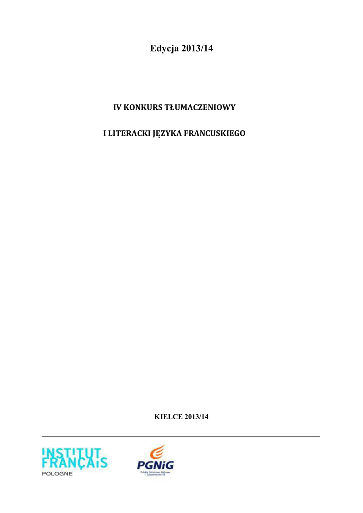 Edycja 2013/14 IV KONKURS TŁUMACZENIOWY I LITERACKI JĘZYKA FRANCUSKIEGO KIELCE 2013/14 Zespół Tłumaczeniowy „Traductor” zrzeszony przy I L.O. im. Stefana Żeromskiego w Kielcach ma przyjemność zaprosić Państwa do uczestnictwa w IV Wojewódzkim Konkursie Tłumaczeniowym i Literackim na najlepsze tłumaczenie tekstów literackich z języka francuskiego oraz najciekawszy esej w języku polskim na temat Francji. Kielce 2013/14 Kielce 30.09.2013 r. Szanowni Państwo ! Koledzy i Koleżanki Romaniści! To już IV Wojewódzki Konkurs Tłumaczeniowy i Literacki na najlepsze tłumaczenie tekstów literackich z języka francuskiego oraz najciekawszy esej w języku polskim na temat Francji ! Wzorem poprzednich trzech lat nasza ekipa serdecznie zaprasza do rozpropagowania naszego konkursu wśród swoich uczniów. Jak Państwo zauważyliście, nie dołączamy do naszego listu materiałów konkursowych – łatwo je pobrać ze strony internetowej naszej szkoły, jak zresztą cały komplet informacji. Proszę zwrócić uwagę na regulamin, albowiem nastąpiły techniczne zmiany co do sposobu nadsyłania prac konkursowychzalecamy drogę elektroniczną. Ma to na celu ułatwienie zespołowi „Traductor” późniejszej pracy. I jeszcze jedno: ponieważ w kwietniu przyszłego roku planujemy wycieczkę do Paryża, są święta i jest to trudny okres dla uczniów klas trzecich, uroczystą sesję wręczania nagród zaplanowaliśmy na czerwiec 2014! Może już będzie u nas piękne śródziemnomorskie słońce i wszystkim będzie łatwiej spotkać się w Kielcach. Jeszcze raz serdecznie zapraszamy i do zobaczenia w czerwcu! Miłego roku szkolnego 2013/14 ! A très bientôt! Przewodniczący Zespołu „Traductor” mgr Mieczysław Chomicz Regulamin Konkursu 1.Konkurs skierowany jest przede wszystkim do uczniów liceów, ale mogą wziąć w nim udział również uczniowie innych szkół średnich. 2.Konkurs składa się z dwóch niezależnych części: - pierwsza część polega na przetłumaczeniu dowolnie wybranej ilości zaproponowanych tekstów literackich: może to być więc tylko jeden tekst, kilka, lub wszystkie teksty. W każdej kategorii – poezja, list, powieść, wypracowanie po polsku – przyznawane będą odrębne nagrody; ta część skierowana jest wyłącznie do uczniów uczących się języka francuskiego. - druga część polega na zredagowaniu, w języku polskim!, pracy pisemnej pt.”Zredaguj wywiad/rozmowę wyimaginowanych postaci – Polaka i Francuza – na temat wzajemnych wyobrażeń o swoich krajach, Polaka o Francji, Francuza o Polsce (ich kulturze, ludziach, zaletach i wadach, polityce, etc.)” o objętości do 3/4 stron A4 ; ta część skierowana jest do wszystkich uczniów intelektualnie i emocjonalnie wrażliwych na Francję; a także i Polskę.. Sugestia: ale Prosimy nauczycieli-romanistów, aby rozpropagowali temat wypracowania wśród nauczycieli-polonistów. Każdy z uczestników może wziąć udział tylko w jednej lub równocześnie w dwóch częściach konkursu, a więc nadesłać przetłumaczone teksty literackie i wypracowanie po polsku. 3. Uczestnik zobowiązany jest do podpisania oświadczenia o oryginalnym charakterze nadesłanej pracy (zgodnie z Ustawą z dn. 04.02.94r. o prawie autorskim, DZ.U. 94/24/83) i przesłanie go pocztą na adres szkoły: I L.O im. Stefana Żeromskiego, ul. Ściegiennego 15, 25-033 Kielce, z dopiskiem na kopercie „Traductor”; tel: 413612816. 4. O zwycięstwie w konkursie zadecyduje Zespół „Traductor” oraz tłumacze literatury francuskiej. 5. W części pierwszej konkursu zostaną przyznane 3 nagrody główne, zaś w części drugiej 1 nagroda główna. W zależności od poziomu nadesłanych prac, a zwłaszcza naszych sponsorów, przewidujemy także wyróżnienia w poszczegó lnych kategoriach. 6. Prace należy nadsyłać pocztą elektroniczną na adres [email protected] w wordzie (doc., lub doc. x) lub pdf . Prace też mogą być nadsyłane tradycyjnie – w kopercie, pocztą- o ile nie ma dostępu do Internetu. Preferujemy jednak drogę elektroniczną!! !Prosimy zapisać na dole strony tłumaczenia nazwisko i imię ucznia, klasę, oraz adres szkoły! 7. Termin oddania prac upływa 25 kwietnia 2014 r. 8. Wręczenie nagród odbędzie się na uroczystej sesji tłumaczeniowej w I L.O im. Stefana Żeromskiego w Kielcach w dniu 05 czerwca 2014. Sesja zostanie tak zorganizowana, aby jej uczestnicy spoza Kielc zdążyli wrócić do domu tego samego dnia. 9. Wszelkie pytania i uwagi dotyczące konkursu należy kierować na podany powyżej adres Szkoły lub bezpośrednio do przewodniczącego konkursu, na Nr telefonu 606404028 lub adres maila [email protected] . 10. Wszystkie niezbędne informacje, formularz oświadczenia, a przede wszystkim teksty do przetłumaczenia możecie Państwo pobrać na stronie internetowej naszej szkoły. Bonne chance! OŚWIADCZENIE Oświadczam, że nadesłany przeze mnie tekst (przekład/opowiadanie) stanowi efekt mojej indywidualnej pracy, nie zawiera fragmentów lub całości innych prac (przekładów/opracowań), poza jawnie cytowaną literaturą i nie był wcześniej publikowany. Data ......................... Czytelny podpis........................................................................ Teksty poetyckie Chanson du vitrier Comme c’est beau ce qu’on peut voir comme ça à travers le sable à travers le verre à travers les carreaux. tenez, regardez par exemple comme c’est beau ce bûcheron là-bas au loin qui abat un arbre pour faire des planches pour le menuisier qui doit faire un grand lit pour la petite marchande de fleurs qui va se marier avec l’allumeur de réverbères qui allume tous les soirs les lumières pour que le cordonnier puisse voir clair en réparant les souliers du cireur qui brosse ceux du rémouleur qui affûte les ciseaux du coiffeur qui coupe le ch’veu au marchand d’oiseaux qui donne ses oiseaux à tout le monde pour que tout le monde soit de bonne hume