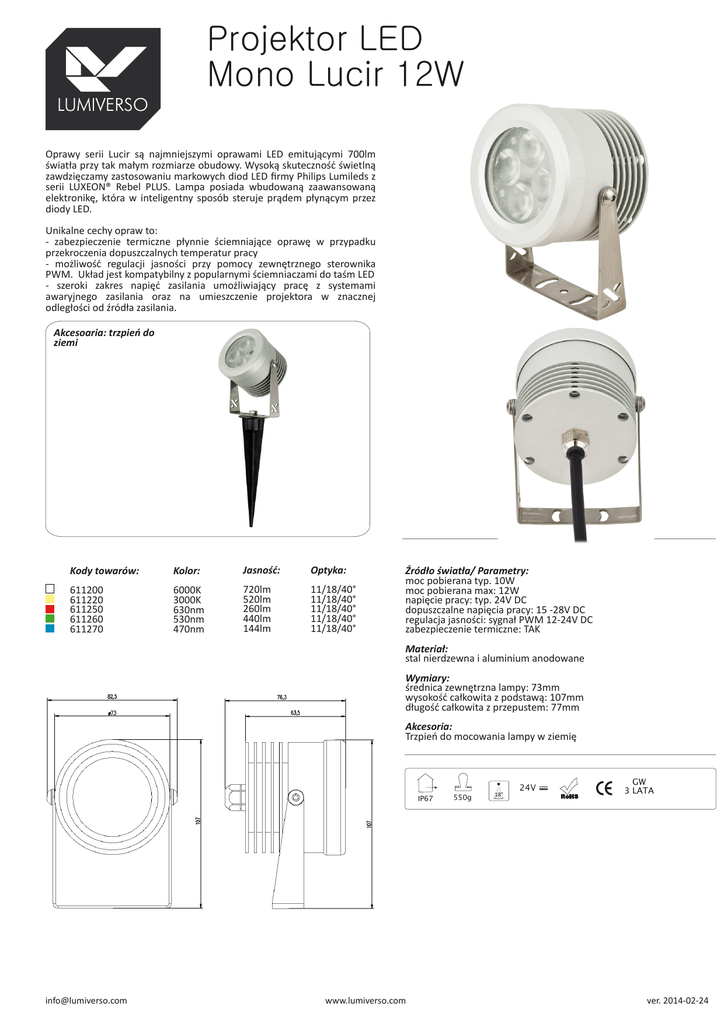 Projektor LED Mono Lucir 12W Oprawy serii Lucir są najmniejszymi oprawami LED emitującymi 700lm światła przy tak małym rozmiarze obudowy. Wysoką skuteczność świetlną zawdzięczamy zastosowaniu markowych diod LED firmy Philips Lumileds z serii LUXEON® Rebel PLUS. Lampa posiada wbudowaną zaawansowaną elektronikę, która w inteligentny sposób steruje prądem płynącym przez diody LED. Unikalne cechy opraw to: - zabezpieczenie termiczne płynnie ściemniające oprawę w przypadku przekroczenia dopuszczalnych temperatur pracy - możliwość regulacji jasności przy pomocy zewnętrznego sterownika PWM. Układ jest kompatybilny z popularnymi ściemniaczami do taśm LED - szeroki zakres napięć zasilania umożliwiający pracę z systemami awaryjnego zasilania oraz na umieszczenie projektora w znacznej odległości od źródła zasilania. Akcesoaria: trzpień do ziemi Kody towarów: 611200 611220 611250 611260 611270 Kolor: Jasność: Optyka: 6000K 3000K 630nm 530nm 470nm 720lm 520lm 260lm 440lm 144lm 11/18/40° 11/18/40° 11/18/40° 11/18/40° 11/18/40° Źródło światła/ Parametry: moc pobierana typ. 10W moc pobierana max: 12W napięcie pracy: typ. 24V DC dopuszczalne napięcia pracy: 15 -28V DC regulacja jasności: sygnał PWM 12-24V DC zabezpieczenie termiczne: TAK Materiał: stal nierdzewna i aluminium anodowane Wymiary: średnica zewnętrzna lampy: 73mm wysokość całkowita z podstawą: 107mm długość całkowita z przepustem: 77mm Akcesoria: Trzpień do mocowania lampy w ziemię IP67 [email protected] www.lumiverso.com 550g 18° 24V --- GW 3 LATA ver. 2014-02-24