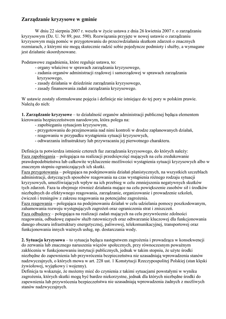 Zarządzanie kryzysowe w gminie W dniu 22 sierpnia 2007 r. weszła w życie ustawa z dnia 26 kwietnia 2007 r. o zarządzaniu kryzysowym (Dz. U. Nr 89, poz. 590). Rozwiązania przyjęte w nowej ustawie o zarządzaniu kryzysowym mają pomóc w przygotowaniu do przeciwdziałania skutkom zdarzeń o znacznych rozmiarach, z którymi nie mogą skutecznie radzić sobie pojedyncze podmioty i służby, a wymagane jest działanie skoordynowane. Podstawowe zagadnienia, które reguluje ustawa, to: - organy właściwe w sprawach zarządzania kryzysowego, - zadania organów administracji rządowej i samorządowej w sprawach zarządzania kryzysowego, - zasady działania w dziedzinie zarządzania kryzysowego, - zasady finansowania zadań zarządzania kryzysowego. W ustawie zostały sformułowane pojęcia i definicje nie istniejące do tej pory w polskim prawie. Należą do nich: 1. Zarządzanie kryzysowe – to działalność organów administracji publicznej będąca elementem kierowania bezpieczeństwem narodowym, która polega na: - zapobieganiu sytuacjom kryzysowym, - przygotowaniu do przejmowania nad nimi kontroli w drodze zaplanowanych działań, - reagowaniu w przypadku wystąpienia sytuacji kryzysowych, - odtwarzaniu infrastruktury lub przywracaniu jej pierwotnego charakteru. Definicja ta potwierdza istnienie czterech faz zarządzania kryzysowego, do których należy: Faza zapobiegania – polegająca na realizacji przedsięwzięć mających na celu zredukowanie prawdopodobieństwa lub całkowite wykluczenie możliwości wystąpienia sytuacji kryzysowych albo w znacznym stopniu ograniczających ich skutki. Faza przygotowania – polegająca na podejmowaniu działań planistycznych, na wszystkich szczeblach administracji, dotyczących sposobów reagowania na czas wystąpienia różnego rodzaju sytuacji kryzysowych, umożliwiających wpływ na ich przebieg w celu zmniejszenia negatywnych skutków tych zdarzeń. Faza ta obejmuje również działania mające na celu powiększenie zasobów sił i środków niezbędnych do efektywnego reagowania, zarządzanie, organizowanie i prowadzenie szkoleń, ćwiczeń i treningów z zakresu reagowania na potencjalne zagrożenia. Faza reagowania – polegająca na podejmowaniu działań w celu udzielania pomocy poszkodowanym, zahamowania rozwoju występujących zagrożeń oraz ograniczenia strat i zniszczeń. Faza odbudowy – polegająca na realizacji zadań mających na celu przywrócenie zdolności reagowania, odbudowę zapasów służb ratowniczych oraz odtwarzanie kluczowej dla funkcjonowania danego obszaru infrastruktury energetycznej, paliwowej, telekomunikacyjnej, transportowej oraz funkcjonowania innych ważnych usług, np. dostarczania wody. 2. Sytuacja kryzysowa – to sytuacja będąca następstwem zagrożenia i prowadząca w konsekwencji do zerwania lub znacznego naruszenia więzów społecznych, przy równoczesnym poważnym zakłóceniu w funkcjonowaniu instytucji publicznych, jednak w takim stopniu, że użyte środki niezbędne do zapewnienia lub przywrócenia bezpieczeństwa nie uzasadniają wprowadzenia stanów nadzwyczajnych, o których mowa w art. 228 ust. 1 Konstytucji Rzeczypospolitej Polskiej (stan klęski żywiołowej, wyjątkowy i wojenny). Definicja ta wskazuje, że możemy mieć do czynienia z takimi sytuacjami powstałymi w wyniku zagrożenia, których skutki mogą być bardzo niekorzystne, jednak dla których niezbędne środki do zapewnienia lub przywrócenia bezpieczeństwa nie uzasadniają wprowadzenia żadnych z możliwych stanów nadzwyczajnych. 3. Infrastruktura krytyczna – to systemy oraz wchodzące w ich skład, powiązane ze sobą funkcjonalnie obiekty, w tym obiekty budowlane, urządzenia, instalacje, usługi kluczowe dla bezpieczeństwa państwa i jego obywateli oraz służące zapewnieniu sprawnego funkcjonowania organów administracji publicznej, a także instytucji i przedsiębiorców. Infrastruktura krytyczna obejmuje systemy: - zaopatrzenia w energię i paliwa, - łączności i sieci teleinformatycznych, - finansowe, - zaopatrzenia w żywność i wodę, - ochrony zdrowia, - transportowe i komunikacyjne, - ratownicze, - zapewniające ciągłość działania administracji publicznej, - produkcji, składowania, przechowywania i stosowania substancji chemicznych i promieniotwórczych, w tym rurociągi substancji niebezpiecznych. 4. Ochrona infrastruktury krytycznej – to zespół przedsięwzięć organizacyjnych realizowanych w celu zapewnienia funkcjonowania lub szybkiego odtworzenia infrastruktury krytycznej na wypadek zagrożeń, w tym awarii, ataków oraz innych zdarzeń zakłócających jej prawidłowe funkcjonowanie. 5. Planowanie cywilne - całokształt przedsięwzięć organizacyjnych, polegających na opracowywaniu planów, w tym planów reagowania kryzysowego i programów mających na celu optymalne wykorzystanie dostępnych sił i środków w sytuacjach kryzysowych oraz w czasie stanów nadzwyczajnych i w czasie wojny, w zakresie zapobiegania sytuacjom kryzysowym, przygotowania do przejmowania nad nimi kontroli, reagowania w sytuacjach kryzysowych oraz odtwarzania infrastruktury i przywracania jej pierwotnego charakteru oraz planowanie w zakresie wspierania Sił Zbrojnych Rzeczypospolitej Polskiej w razie ich użycia oraz planowanie wykorzystania Sił Zbrojnych Rzeczypospolitej Polskiej do realizacji zadań z zakresu zarządzania kryzysowego. 6. Narodowy System Pogotowia Kryzysowego (NSPK) – to realizowane przez organy administracji rządowej oraz Siły Zbrojne Rzeczypospolitej Polskiej zadania i procedury mające na celu zapobieganie sytuacjom kryzysowym, przygotowanie do przejmowania nad nimi kontroli w drodze zaplanowanych działań oraz reagowanie w przypadku wystąpienia sytuacji kryzysowych. Zarządzanie kryzysowe na poziomie gminy Organem właściwym w sprawach zarządzania kryzysowego na terenie gminy jest wójt. Do zadań wójta w sprawach zarządzania kryzysowego należy kierowanie działaniami zwi
