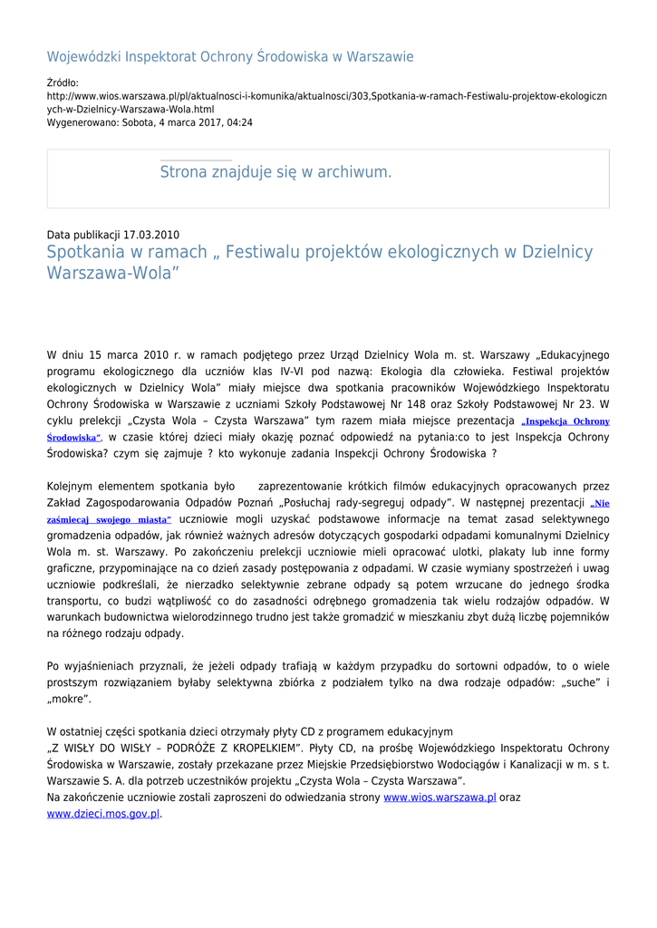 Wojewódzki Inspektorat Ochrony Środowiska w Warszawie Źródło: http://www.wios.warszawa.pl/pl/aktualnosci-i-komunika/aktualnosci/303,Spotkania-w-ramach-Festiwalu-projektow-ekologiczn ych-w-Dzielnicy-Warszawa-Wola.html Wygenerowano: Sobota, 4 marca 2017, 04:24 Strona znajduje się w archiwum. Data publikacji 17.03.2010 Spotkania w ramach „ Festiwalu projektów ekologicznych w Dzielnicy Warszawa-Wola” W dniu 15 marca 2010 r. w ramach podjętego przez Urząd Dzielnicy Wola m. st. Warszawy „Edukacyjnego programu ekologicznego dla uczniów klas IV-VI pod nazwą: Ekologia dla człowieka. Festiwal projektów ekologicznych w Dzielnicy Wola” miały miejsce dwa spotkania pracowników Wojewódzkiego Inspektoratu Ochrony Środowiska w Warszawie z uczniami Szkoły Podstawowej Nr 148 oraz Szkoły Podstawowej Nr 23. W cyklu prelekcji „Czysta Wola – Czysta Warszawa” tym razem miała miejsce prezentacja „Inspekcja Ochrony Środowiska”, w czasie której dzieci miały okazję poznać odpowiedź na pytania:co to jest Inspekcja Ochrony Środowiska? czym się zajmuje ? kto wykonuje zadania Inspekcji Ochrony Środowiska ? Kolejnym elementem spotkania było zaprezentowanie krótkich filmów edukacyjnych opracowanych przez Zakład Zagospodarowania Odpadów Poznań „Posłuchaj rady-segreguj odpady”. W następnej prezentacji „Nie uczniowie mogli uzyskać podstawowe informacje na temat zasad selektywnego gromadzenia odpadów, jak również ważnych adresów dotyczących gospodarki odpadami komunalnymi Dzielnicy zaśmiecaj swojego miasta” Wola m. st. Warszawy. Po zakończeniu prelekcji uczniowie mieli opracować ulotki, plakaty lub inne formy graficzne, przypominające na co dzień zasady postępowania z odpadami. W czasie wymiany spostrzeżeń i uwag uczniowie podkreślali, że nierzadko selektywnie zebrane odpady są potem wrzucane do jednego środka transportu, co budzi wątpliwość co do zasadności odrębnego gromadzenia tak wielu rodzajów odpadów. W warunkach budownictwa wielorodzinnego trudno jest także gromadzić w mieszkaniu zbyt dużą liczbę pojemników na różnego rodzaju odpady. Po wyjaśnieniach przyznali, że jeżeli odpady trafiają w każdym przypadku do sortowni odpadów, to o wiele prostszym rozwiązaniem byłaby selektywna zbiórka z podziałem tylko na dwa rodzaje odpadów: „suche” i „mokre”. W ostatniej części spotkania dzieci otrzymały płyty CD z programem edukacyjnym „Z WISŁY DO WISŁY – PODRÓŻE Z KROPELKIEM”. Płyty CD, na prośbę Wojewódzkiego Inspektoratu Ochrony Środowiska w Warszawie, zostały przekazane przez Miejskie Przedsiębiorstwo Wodociągów i Kanalizacji w m. s t. Warszawie S. A. dla potrzeb uczestników projektu „Czysta Wola – Czysta Warszawa”. Na zakończenie uczniowie zostali zaproszeni do odwiedzania strony www.wios.warszawa.pl oraz www.dzieci.mos.gov.pl. Załączniki do strony Inspekcja Ochrony Środowiska 13.58 MB Data dodania 17.03.2010 10:43 Nie zaśmiecaj swojego miasta 2.76 MB Data dodania 17.03.2010 10:44 Data publikacji 17.03.2010 Data modyfikacji 22.03.2010Rejestr zmian Liczba wizyt: 1144 Autor: Tomasz Klech Opublikowane przez Ewa Pacholska MO
