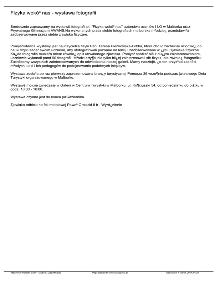 Fizyka wokó³ nas - wystawa fotografii Serdecznie zapraszamy na wystawê fotografii pt. "Fizyka wokó³ nas" autorstwa uczniów I LO w Malborku oraz Prywatnego Gimnazjum AWANS.Na wykonanych przez siebie fotografiach malborska m³odzie¿ przedstawi³a zaobserwowane przez siebie zjawiska fizyczne. Pomys³odawc± wystawy jest nauczycielka fizyki Pani Teresa Pieñkowska-Fobka, która chc±c zachêciæ m³odzie¿ do nauki fizyki zada³ swoim uczniom, aby sfotografowali poznane na lekcji i zaobserwowane w ¿yciu zjawiska fizyczne. Ka¿da fotografia musia³a mieæ równie¿ opis utrwalonego zjawiska. Pomys³ spotka³ siê z du¿ym zainteresowaniem, uczniowie wykonali pond 90 fotografii. M³odzi arty¶ci nie tylko bli¿ej zainteresowali siê fizyk±, ale równie¿ fotografik±. Zachêcamy wszystkich zainteresowanych do odwiedzania naszej galerii. Mamy nadziejê, ¿e ten przyk³ad zachêci m³odych ludzi i ich pedagogów do podejmowania podobnych inicjatyw. Wystawa zosta³a po raz pierwszy zaprezentowana bran¿y turystycznej Pomorza 26 wrze¶nia podczas ¦wiatowego Dnia Turystyki organizowanego w Malborku. Wystawê mo¿na zwiedzaæ w Galerii w Centrum Turystyki w Malborku, ul. Ko¶ciuszki 54, od poniedzia³ku do pi±tku w godz. 10:00 - 16:00. Wystawa czynna jest do koñca pa¼dziernika. Zjawisko odbicia na fali metalowej Pawe³ Grosicki II b - Wyró¿nienie http://www.malbork.pl/um/ - Malbork, Urz±d Miasta Page created by www.kraszewski.pl Generated: 4 March, 2017, 04:24