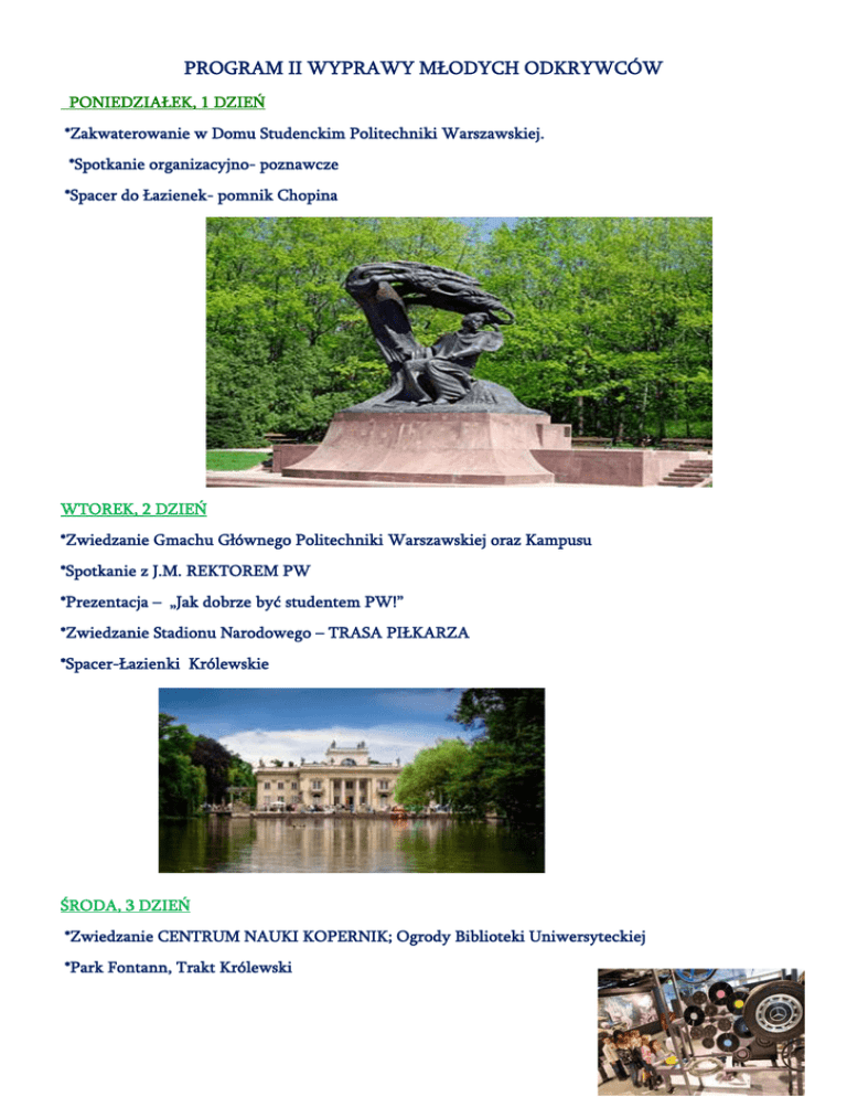 PROGRAM II WYPRAWY MŁODYCH ODKRYWCÓW PONIEDZIAŁEK, 1 DZIEŃ *Zakwaterowanie w Domu Studenckim Politechniki Warszawskiej. *Spotkanie organizacyjno- poznawcze *Spacer do Łazienek- pomnik Chopina WTOREK, 2 DZIEŃ *Zwiedzanie Gmachu Głównego Politechniki Warszawskiej oraz Kampusu *Spotkanie z J.M. REKTOREM PW *Prezentacja – „Jak dobrze być studentem PW!” *Zwiedzanie Stadionu Narodowego – TRASA PIŁKARZA *Spacer-Łazienki Królewskie ŚRODA, 3 DZIEŃ *Zwiedzanie CENTRUM NAUKI KOPERNIK; Ogrody Biblioteki Uniwersyteckiej *Park Fontann, Trakt Królewski *Spotkanie integracyjne CZWARTEK, 4 DZIEŃ *Pałac Kultury i Nauki- wjazd na XXX piętro, *Podziwianie panorama miasta. *Wilanów, zwiedzanie Pałacu i parku; *Lekcja: Z wizytą u Króla *Spotkanie integracyjne IĄTEK, 5 DZIEŃ *Warsztaty z Mechatroniki na Politechnice Warszawskiej * Wycieczka do ZOO SOBOTA, 6 DZIEŃ *GRA MIEJSKA, Stare Miasto *Zamek Królewski *Mała Olimpiada sportowa ( w razie niepogody) *Spektakl -Teatr Polonia – PL. Konstytucji (przy ładnej pogodzie) *Spotkanie pożegnalne, rozdanie upominków, wspólne zdjęcia. NIEDZIELA, 7 DZIEŃ 11.00 – wyjazd z Warszawy około 18.00 – przyjazd do Grybowa
