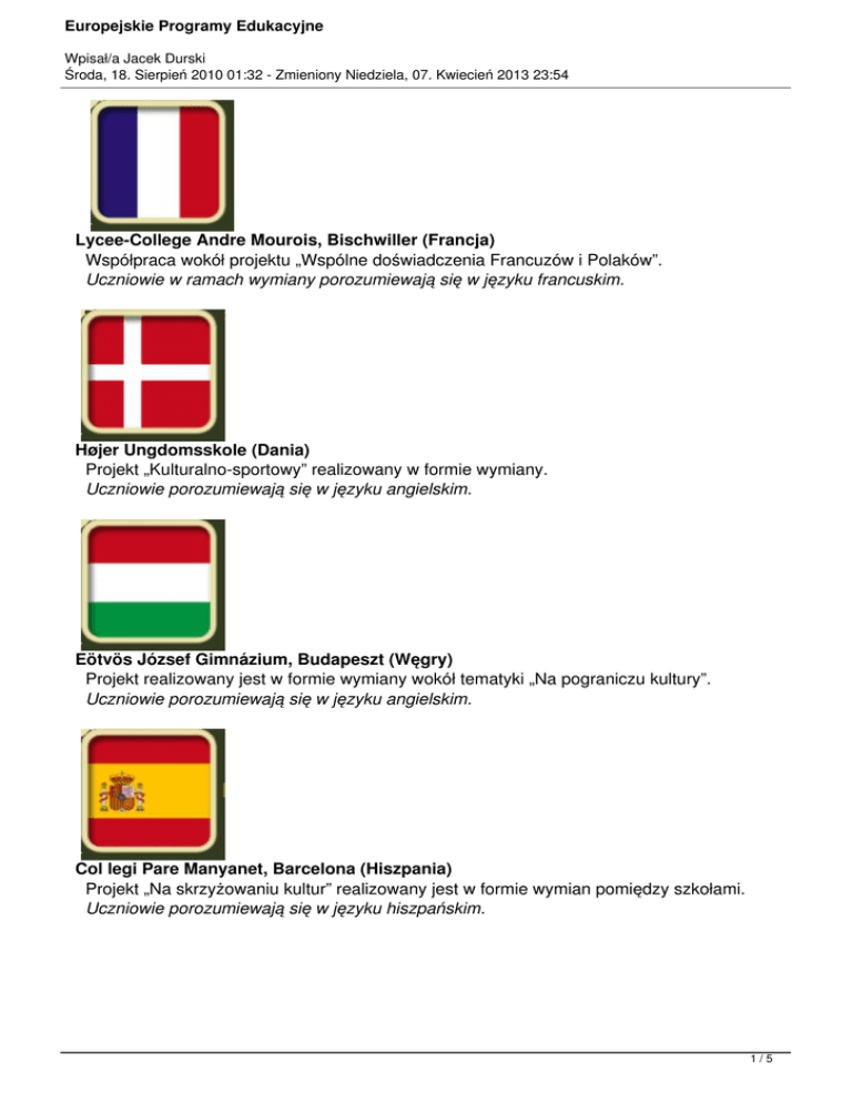 Europejskie Programy Edukacyjne Wpisał/a Jacek Durski Środa, 18. Sierpień 2010 01:32 - Zmieniony Niedziela, 07. Kwiecień 2013 23:54 Lycee-College Andre Mourois, Bischwiller (Francja) Współpraca wokół projektu „Wspólne doświadczenia Francuzów i Polaków”. Uczniowie w ramach wymiany porozumiewają się w języku francuskim. Højer Ungdomsskole (Dania) Projekt „Kulturalno-sportowy” realizowany w formie wymiany. Uczniowie porozumiewają się w języku angielskim. Eötvös József Gimnázium, Budapeszt (Węgry) Projekt realizowany jest w formie wymiany wokół tematyki „Na pograniczu kultury”. Uczniowie porozumiewają się w języku angielskim. Col legi Pare Manyanet, Barcelona (Hiszpania) Projekt „Na skrzyżowaniu kultur” realizowany jest w formie wymian pomiędzy szkołami. Uczniowie porozumiewają się w języku hiszpańskim. 1/5 Europejskie Programy Edukacyjne Wpisał/a Jacek Durski Środa, 18. Sierpień 2010 01:32 - Zmieniony Niedziela, 07. Kwiecień 2013 23:54 Adolf-Weber-Gymnasium, Monachium (Niemcy) Projekt edukacyjny realizowany formie wymiany. i angielskim. Uczniowie porozumiewają się ww języku niemieckim Wyjazd edukacyjny Wielkiej Brytanii uczestniczą w warsztatach przyrodniczo-językowych i zwiedzają m.in. Londyn i okolice. Uczniowie w ramachdo wymiany porozumiewają się w języku angielskim. Sokrates-Comenius (2011-2013) Młodzież w Europie Kraje uczestniczące w projekcie: Polska, Niemcy, Turcja, Włochy, Francja. Językami porozumiewania są angielski i niemiecki. IMUNA Alkmaar (Holandia) W projekcie biorą udział uczniowie z różnych państw Sesje IMUNA są wzorowane na d Uczniowie porozumiewają się w języku angielskim naeuropejskich. poziomie zaawansowanym. MUNOL Lubeka/Luebeck (Niemcy) uczestniczą w prestiżowych seminariach będących symulacjami obrad ONZ cz Uczniowie porozumiewają się w języku corocznych angielskim i/lub niemieckim. MUNOH Hamburg (Niemcy) Uczniowie uczestniczą w prestiżowych seminariach będących symulacjami obrad ONZ cz porozumiewają się w języku corocznych angielskim i/lub niemieckim. 2/5 Europejskie Programy Edukacyjne Wpisał/a Jacek Durski Środa, 18. Sierpień 2010 01:32 - Zmieniony Niedziela, 07. Kwiecień 2013 23:54 RIMUN Rzym (Włochy) w prestiżowych uczestniczą Uczniowie porozumiewają się w języku corocznych angielskim. seminariach będących symulacjami obrad ONZ cz MUNOB Bukareszt (Rumunia) uczestniczą w prestiżowych Uczniowie porozumiewają się w języku corocznych angielskim. seminariach będących symulacjami obrad ONZ cz E-Twinning Istambuł (Turcja) eTwinning to bliźniacza współpraca szkół za pomocą technologii informacyjno-komunikacyjnych (ICT) Matematyka bez Nasza szkoła odgranic lat jest Strasbourg regionalnym(Francja) organizatorem międzynarodowego konkursu matematycznego. Archiwum Sokrates-Comenius Spotkania seminaryjne w krajach: Belgia, Hiszpania, Niemcy, Polska, Turcja, Włochy, Francja. Językami porozumiewania był angielski Comenius 2012 » Comenius 2000-2003 » i niemiecki. E-Twinning eTwinning to bliźniacza współpraca szkół za pomocą technologii (ICT 2005/2006: Project with afrom school from Athens „backgroungs Different countries-common aims” » 20072008: Project with awith school Sweden „Tolerance means peace” 2008-2010: Project ayoung school from Denmark „European prospects for people of different » »informacyjno-komunikacyjnych 3/5 Europejskie Programy Edukacyjne Wpisał/a Jacek Durski Środa, 18. Sierpień 2010 01:32 - Zmieniony Niedziela, 07. Kwiecień 2013 23:54 Życie w krajach Europy wschodniej w angielskim. czasach Wojnyoraz historii europejskiej prowadzony Projekt edukacyjny językaZimnej angielskiego Uczniowie porozumiewają się wnauczanie języku Więcej/More 2012 » integrujący Novara Projekt(Włochy) „Kulturalno-sportowy” w formie wymiany. Uczniowie porozumiewają się realizowany w języku angielskim. Liceo FARNESINA Rzym (Włochy) uczestniczą w corocznych debatach dotyczących rezolucji ONZ przygotowywanych i realiz Uczniowie porozumiewają się w języku angielskim na poziomie zaawansowanym. Helmholtz-Gymnasium Zweibrucken (Niemcy) Współpracawrealizowana w latach 1990-2003 wokół „Różna historia wspólna przyszłość”. Uczniowie ramach wymiany porozumiewają się w projektu języku niemieckim. IZOP brali udział w seminariach Uczniowie porozumiewali się w (Niemcy) językudotyczących niemieckim.ekologii. More » Akwizgran/Aachen-Hahn Siemens JOIN Multimedia (Niemcy) Join Multimedia był konkursem patronatem firmyi SIEMENS organizowanym od 2001 roku. W kon Uczniowie porozumiewali się w pod językach angielskim niemieckim. 4/5 Europejskie Programy Edukacyjne Wpisał/a Jacek Durski Środa, 18. Sierpień 2010 01:32 - Zmieniony Niedziela, 07. Kwiecień 2013 23:54 Eirene (Włochy) Europejski projekt „Przeciw przemocy - edukacja dla pokoju” w formie seminarium, które odbyło się w Projekt realizowany był w języku angielskim. The Globe Theatre W 1994r. szkoła włączyła do obchodów Projekt realizowany był w się języku angielskim.europejskiego „Roku Szekspira” w ramach którego szkoln 5/5