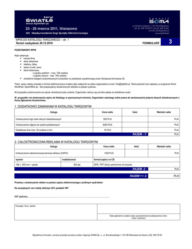 WPIS DO KATALOGU TARGOWEGO – str. 1 Termin nadsyłania 30.12.2010 FORMULARZ 3 PODSTAWOWY WPIS Wpis obejmuje: nazwę firmy dane adresowe telefony, faksy adres e-mail, www, tekst reklamowy: - w języku polskim – max. 750 znaków - w języku obcym - max. 750 znaków określenie kategorii prezentowanych produktów na podstawie wypełnionego przez Wystawcę formularza 3A Treść wpisu należy przesłać w formie elektronicznej e-mailem jako załącznik na adres organizatora e-mail: [email protected]. Tekst powinien być napisany w programie Word, WordPad, OpenOffice itp. Nie przepisujemy dostarczonych tekstów w postaci wydruku. W przypadku przekroczenia we wpisie określonej liczby znaków, Organizator naliczy wg cennika opłatę za dodatkowe znaki. W przypadku nie dostarczenia wpisu do Katalogu w wyznaczonym terminie, Organizator zastrzega sobie prawo do zamieszczenia jedynie danych teleadresowych z Karty Zgłoszenia Uczestnictwa. 1. DODATKOWO ZAMAWIAM W KATALOGU TARGOWYM Usługa Cena netto Ilość Wartość netto Umieszczenie logo obok danych teleadresowych 500 PLN PLN Umieszczenie zdjęcia we wpisie podstawowym 5000 PLN PLN 15 PLN PLN Dodatkowe linie max. 50 znaków w linii RAZEM - 1: PLN 2. CAŁOSTRONICOWA REKLAMA W KATALOGU TARGOWYM Usługa Cena netto Umieszczenie całostronicowej barwnej reklamy (CMYK) wymiar Wartość netto 1200 PLN rozdzielczość 146 x 205 mm + spady Ilość 300 dpi PLN format zapisu na CD EPS, TIFF (fonty zamienione na krzywe) RAZEM -2 : PLN RAZEM 1 + 2: PLN Prosimy o dostarczenie reklam w postaci zapisu elektronicznego z próbnym wydrukiem. Do powyższych cen należy doliczyć 22% podatek VAT NIP płatnika:…………………………………………………………………………………………. Pieczątka firmy / płatnik Data zgłoszenia i podpis osoby upoważnionej do podpisywania umów (imię i nazwisko) Wypełniony formularz prosimy przesłać pocztą na adres: Agencja SOMA Sp. J., ul. Bronikowskiego 1, 02-796 Warszawa lub faxem: [22] 649 76 83 WPIS DO KATALOGU TARGOWEGO – str. 2 Termin nadsyłania 30.12.2010 FORMULARZ 3A LISTA PREZENTOWANYCH PRODUKTÓW TARGOWYCH (KATEGORIE) 17. OŚWIETLENIE ARCHITEKTONICZNE 17.1. oświetlenie wnętrz 17.2. oświetlenie fasad i iluminacja obiektów 17.3. systemy kontroli i sterowania 18. OŚWIETLENIE DRÓG I ULIC, MAŁEJ ARCHITEKTURY 18.1. oświetlenie uliczne 18.2. słupy i latarnie 18.3. oświetlenie parkingów 18.4. oświetlenie dużych przestrzeni miejskich i obiektów sportowych 18.5. oświetlenie tuneli 18.6. oświetlenie parków i ogrodów 18.7. neony świetlne i wyświetlacze 18.8. oświetlenie sygnalizacyjne 18.9. systemy sterowania oświetleniem i oszczędności energii 18.10. sprzęt i akcesoria 19. OŚWIETLENIE DLA BIUR I ADMINISTRACJI 19.1. systemy świetlne 19.2. oświetlenie miejsc pracy 19.3. oświetlenie ogólne i miejscowe 19.4. oświetlenie pośrednie 19.5. oświetlenie szkół i szpitali 19.6. oświetlenie hoteli, restauracji i gastronomii 19.7. oświetlenie muzeów, kin, teatrów, dyskotek 19.8. systemy sterowania oświetleniem 19.9. sprzęt i akcesoria 20. OŚWIETLENIE MIESZKANIOWE I DEKORACYJNE 20.1. oświetlenie mieszkań 20.2. oświetlenie willi i domów wolnostojących 20.3. oświetlenie łazienek, kuchni i miejsc wypoczynku 20.4. systemy sterowania oświetleniem 21. OŚWIETLENIE TECHNICZNE DLA PRZEMYSŁU I BIZNESU 21.1. oświetlenie terenów przemysłowych 21.2. oświetlenie ogólne i miejsc pracy 21.3. systemy oświetleniowe 21.4. oświetlenie w warunkach ekstremalnych 21.5. świetlne systemy sygnalizacyjne 21.6. oświetlenie zabezpieczające 21.7. oświetlenie maszyn 22. OŚWIETLENIE AWARYJNE I EWAKUACYJNE, SYSTEMY ZASILAJĄCE I STERUJĄCE 23. OŚWIETLENIE SPECJALISTYCZNE 23.1. lasery i światłowody 23.2. świetlne efekty specjalne 23.3. oświetlenie zasilane z baterii słonecznych 23.4. lampy błyskowe, latarki, baterie 23.5. oświetlenie świąteczne 24. OŚWIETLENIE DLA POTRZEB SCENY, STUDIA, KLUBU I DYSKOTEKI ORAZ REKLAMY 25. ŹRÓDŁA ŚWIATŁA 25.1. żarowe 25.2. halogenowe 25.3. fluorescencyjne 25.4. wyładowcze: rtęciowe, sodowe, metalohalogenkowe 25.5. źródła specjalnego zastosowania 26. LEDy I ICH ZASTOSOWANIA 27. URZĄDZENIA OŚWIETLENIOWE DLA ZDROWIA I URODY 28. COMPONET’S SHOW - SPECJALNY SEKTOR KOMPONENTÓW I AKCESORII 28.1. abażury, klosze, odbłyśniki 28.2. uchwyty, sprężyny, podkładki, etc. 28.3. szkło, ceramika, witraże 28.4. części plastikowe, metalowe i drewniane 28.5. oprawki, złączki 28.6. gniazda, transformatory 28.7. przewody 28.8. stateczniki, układy zapłonowe 28.9. wyłączniki, przełączniki, ściemniacze 28.10. materiały do produkcji źródeł światła 28.11. farby i lakiery 28.12. materiały i maszyny do produkcji sprzętu oświetleniowego 29. INNE (podać jakie) _________________________________________________ zaznaczyć krzyżykiem Pieczątka firmy / płatnik Data zgłoszenia i podpis osoby upoważnionej do podpisywania umów (imię i nazwisko) Wypełniony formularz prosimy przesłać pocztą na adres: Agencja SOMA Sp. J., ul. Bronikowskiego 1, 02-796 Warszawa lub faxem: [22] 649 76 83 WPIS DO KATALOGU TARGOWEGO – str. 3 Termin nadsyłania 30.12.2010 FORMULARZ 3A LISTA PREZENTOWANYCH PRODUKTÓW TARGOWYCH (KATEGORIE) 1. INSTALACJE ELEKTRYCZNE, SPRZĘT INSTALACYJNY 1.1 gniazda, wtyczki 1.2 łączniki, wyłączniki 1.3 kanały kablowe, listwy, korytka 1.4 aparatura modułowa 1.5 zabezpieczenia 1.6 liczniki energii elektrycznej 1.7 puszki i odgałęźniki elektroinstalacyjne 2. URZĄDZENIA OCHRONY PRZEPIĘCIOWEJ I ODGROMOWEJ 3. URZĄDZENIA ROZDZIAŁU ENERGII ELEKTRYCZNEJ 3.1 rozdzielnice 3.2 rozłączniki bezpiecznikowe 3.3 szynoprzewody 3.4 transformatory 4. SIECI NISKIEGO I ŚREDNIEGO NAPIĘCIA 4.1 kable i przewody 4.2 oznaczniki kablowe 4.3 przepusty 4.4 złącza 4.5 izolacje 5. AUTOMATYKA 5.1 systemy typu "inteligentny budynek" 5.2 zegary, przekaźniki czasowe 5.3 sygnalizatory, lampki sygnalizacyjne 5.4 styczniki, przeka