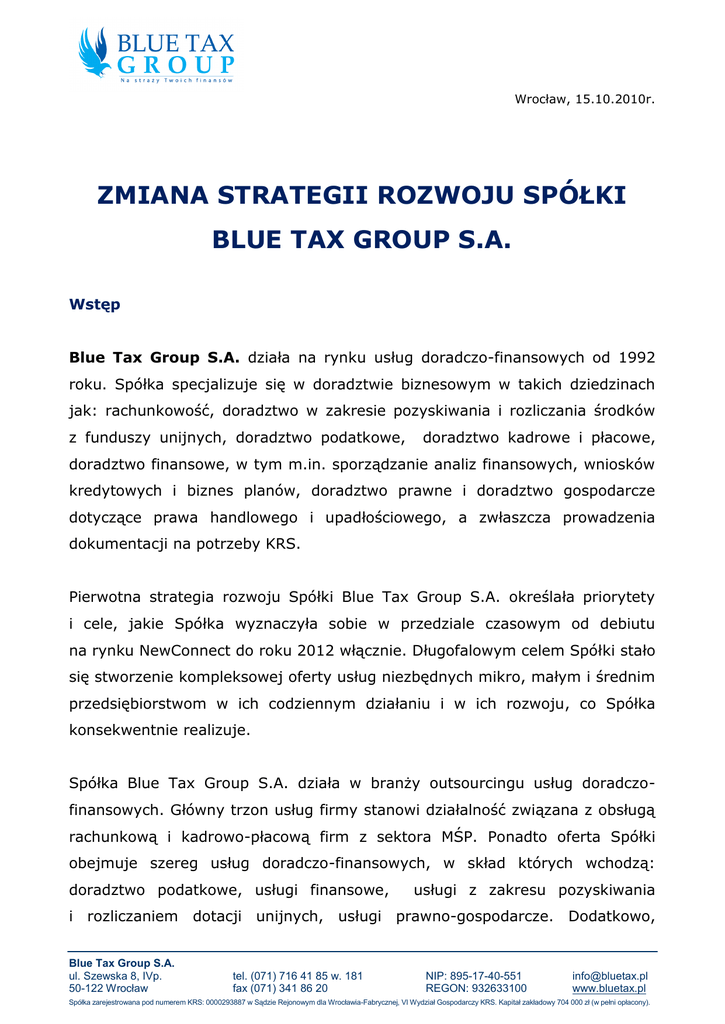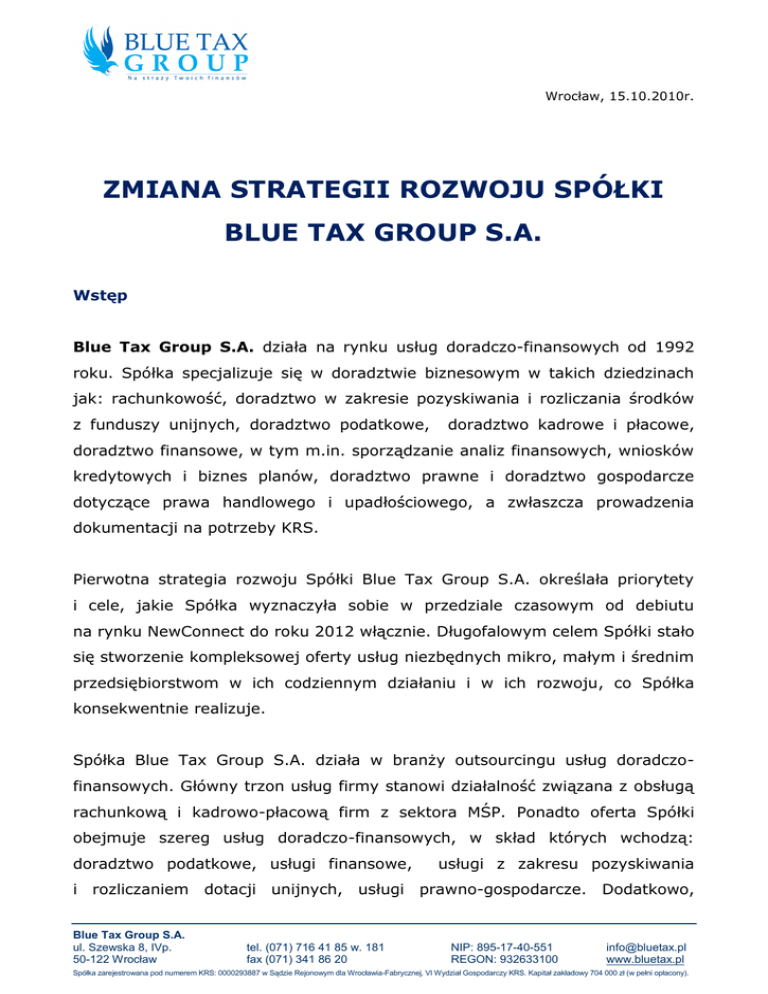 Wrocław, 15.10.2010r. ZMIANA STRATEGII ROZWOJU SPÓŁKI BLUE TAX GROUP S.A. Wstęp Blue Tax Group S.A. działa na rynku usług doradczo-finansowych od 1992 roku. Spółka specjalizuje się w doradztwie biznesowym w takich dziedzinach jak: rachunkowość, doradztwo w zakresie pozyskiwania i rozliczania środków z funduszy unijnych, doradztwo podatkowe, doradztwo kadrowe i płacowe, doradztwo finansowe, w tym m.in. sporządzanie analiz finansowych, wniosków kredytowych i biznes planów, doradztwo prawne i doradztwo gospodarcze dotyczące prawa handlowego i upadłościowego, a zwłaszcza prowadzenia dokumentacji na potrzeby KRS. Pierwotna strategia rozwoju Spółki Blue Tax Group S.A. określała priorytety i cele, jakie Spółka wyznaczyła sobie w przedziale czasowym od debiutu na rynku NewConnect do roku 2012 włącznie. Długofalowym celem Spółki stało się stworzenie kompleksowej oferty usług niezbędnych mikro, małym i średnim przedsiębiorstwom w ich codziennym działaniu i w ich rozwoju, co Spółka konsekwentnie realizuje. Spółka Blue Tax Group S.A. działa w branży outsourcingu usług doradczofinansowych. Główny trzon usług firmy stanowi działalność związana z obsługą rachunkową i kadrowo-płacową firm z sektora MŚP. Ponadto oferta Spółki obejmuje szereg usług doradczo-finansowych, w skład których wchodzą: doradztwo podatkowe, usługi finansowe, usługi z zakresu pozyskiwania i rozliczaniem dotacji unijnych, usługi prawno-gospodarcze. Dodatkowo, Blue Tax Group S.A. ul. Szewska 8, IVp. 50-122 Wrocław tel. (071) 716 41 85 w. 181 fax (071) 341 86 20 NIP: 895-17-40-551 REGON: 932633100 [email protected] www.bluetax.pl Spółka zarejestrowana pod numerem KRS: 0000293887 w Sądzie Rejonowym dla Wrocławia-Fabrycznej, VI Wydział Gospodarczy KRS. Kapitał zakładowy 704 000 zł (w pełni opłacony). poprzez nawiązanie współpracy ze znaczącymi podmiotami gospodarczymi, świadczącymi usługi uzupełniające, firma ma do zaoferowania swoim klientom z sektora MSP szereg dodatkowych usług, tj.: usługi audytorskie, badania sprawozdań finansowych, kompleksowe usługi związane z pozyskiwaniem zewnętrznych inwestorów i rynkiem kapitałowym. Misją firmy jest oferowanie wszystkich niezbędnych przedsiębiorcom usług w jednym miejscu. Pakiet usług w zależności od potrzeb Klienta jest bardzo elastyczny. W zależności od specyfiki działalności Klienta i jego potrzeb, po rozpoznaniu możliwości działania, Klient otrzymuje informacje dotyczące działań wspierających rozwój jego działalności. Spółka stworzyła pakiet usług obejmujący zakres usług z zakresu: doradztwa prawnego i gospodarczego: o rejestracja firm, pomoc w wyborze formy opodatkowania, uzyskanie koncesji, licencji, zezwoleń na prowadzenie działalności gospodarczej; o bieżąca obsługa prawna (prawo działalności gospodarczej, handlowe, cywilne, podatkowe, prawo pracy); o zastępstwo procesowe przed sądami, urzędami administracyjnymi, organami podatkowymi, organami celnymi; o windykacja wierzytelności. rachunkowości: o prowadzenie ksiąg handlowych; o doradztwo i nadzór księgowy; o sporządzanie raportów, analiz i sprawozdań finansowych, o sporządzanie deklaracji podatkowych; o prowadzenie dokumentacji i rozliczeń z ZUS; o prowadzenie spraw pracowniczych (sporządzanie umów o pracę, umów zleceń, umów o dzieło, sporządzanie listy płac, instrukcji i regulaminów). doradztwa podatkowego: o prowadzenie rozliczeń podatkowych; 2 o stały nadzór podatkowy; o audyty podatkowe; o reprezentacja Klientów w postępowaniach podatkowych przed organami podatkowymi; o reprezentacja przed organami kontrolnymi; o opiniowanie i optymalizacja podatkowa. doradztwa finansowego: o założenie rachunku firmowego; o doradztwo i pomoc w uzyskaniu kredytu; o leasing; o faktoring na zobowiązania i należności; o ubezpieczenia komunikacyjne, inwestycyjne, majątkowe etc. dotacji unijnych: o analiza planowanej inwestycji pod kątem możliwości pozyskania dotacji; o sporządzanie wniosków o dotacje; o biznes plany i studia wykonalności; o rozliczanie dotacji. Innowacyjność tego pomysłu polega na dostarczeniu Klientom biznesowym dedykowanego pakietu usług doradczo-finansowych, dostosowanych do ich indywidualnych preferencji oraz sprawowaniu pieczy w wywiązywaniu się z obowiązków nakładanych na przedsiębiorców. Spółka opracowała i realizuje plan rozwoju Sieci Franczyzowej Blue Tax Group S.A. Dzięki konsekwentnej rozbudowie sieci Spółka pozyskuje klientów (w tym głównie mikro, małych i średnich przedsiębiorców), którzy długofalowo korzystają z kompleksowych usług niezbędnych przedsiębiorcom. 3 Dotychczasowa strategia firmy Z uwagi na duże rozdrobnienie firm doradczo-rachunkowych na rynku outsourcingu usług konsultingowych, Spółka postanowiła jako jeden z pierwszych podmiotów w Polsce stworzyć silną Sieć Partnerską biur kompleksowo obsługujących sektor MŚP począwszy od obsługi rachunkowej poprzez doradztwo prawno-podatkowe po pozyskiwanie finansowania na rozwój firm. Cel strategiczny: Rozwój firmy i pozyskanie klientów na kompleksowe usługi doradczo-finansowe przeznaczone dla firm poprzez budowę własnej sieci franczyzowej na terenie całej Polski. Rozszerzenie usług i dopasowanie katalogu usług doradczo-finansowych do potrzeb klientów, do których w szczególności należy zaliczyć mikro, małe i średnie przedsiębiorstwa. Cele cząstkowe: budowa Centrum Kompetencyjnego Blue Tax Group S.A., które ma składać się Doradztwa z następujących Podatkowego, działów: Dział Usług Dział Rachunkowości, Prawnych, Dział Dział Produktów Finansowych, Dział Funduszy Unijnych, Dział Szkoleń i Doradztwa Personalnego; stworzenie bogatego katalogu usług komplementarnych dla klientów biznesowych, m.in. rozszerzenie go o usługi konsultingowe związane z pozyskiwaniem środków finansowych dla klientów o charakterze udziałowym (m