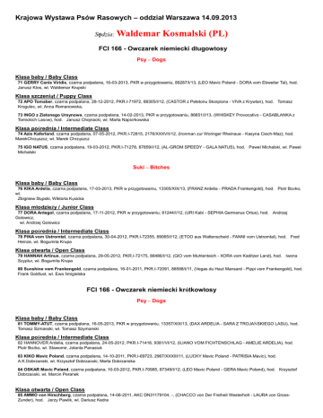 Krajowa Wystawa Psów Rasowych – oddział Warszawa 14.09.2013 Sędzia: Waldemar Kosmalski (PL) FCI 166 - Owczarek niemiecki długowłosy Psy – Dogs Klasa baby / Baby Class 71 GERRY Canis Viridis, czarna podpalana, 16-03-2013, PKR w przygotowaniu, 89287/I/13, (LEO Mavic Poland - DORA vom Ebweiler Tal), hod. Janusz Kłos, wł. Waldemar Krupski Klasa szczeniąt / Puppy Class 72 APO Tomaber, czarna podpalana, 28-12-2012, PKR.I-71972, 88305/I/12, (CASTOR z Peletonu Skorpiona - VIVA z Krywlan), hod. Tomasz Krogulec, wł. Anna Romanowska, 73 INGO z Zielonego Ursynowa, czarna podpalana, 14-02-2013, PKR w przygotowaniu, 88651/I/13, (WHISKEY Provocativo - CASABLANKA z Tomickich Lasów), hod. Janusz Chojnacki, wł. Marta Napiórkowska Klasa pośrednia / Intermediate Class 74 Azis Kaferland, czarna podpalana, 07-05-2012, PKR.I-72815, 2176/XXXVII/12, (Ironman zur Woringer Rheinaue - Kasyna Ciech-Maz), hod. MarekChrząszcz, wł. Marek Chrząszcz 75 IGO NATUS, czarna podpalana, 19-03-2012, PKR.I-71278, 87859/I/12, (AL-GROM SPEEDY - GALA NATUS), hod. Paweł Michalski, wł. Paweł Michalski Suki – Bitches Klasa baby / Baby Class 76 KIKA Ardelia, czarna podpalana, 17-03-2013, PKR w przygotowaniu, 13305/XIX/13, (FRANZ Ardelia - PRADA Frankengold), hod. Piotr Bożko, wł. Zbigniew Stępski, Wiktoria Kęsicka Klasa młodzieży / Junior Class 77 DORA Antegol, czarna podpalana, 17-11-2012, PKR w przygotowaniu, 81244/I/12, (URI Kabi - SEPHIA Germanus Ortus), hod. Andrzej Gołowicz, wł. Andrzej Gołowicz Klasa pośrednia / Intermediate Class 78 PINA vom Ustromtal, czarna podpalana, 30-04-2012, PKR.I-72355, 89065/I/12, (ETOO aus Wattenscheid - FANNI vom Ustromtal), hod. Fred Heinze, wł. Bogumiła Krupa Klasa otwarta / Open Class 79 HANNAH Artinus, czarna podpalana, 29-05-2012, PKR.I-72175, 88486/I/12, (GIO vom Muhlenteich - XORA vom Kaditzer Land), hod. Iwona Szyptur, wł. Bogumiła Krupa 80 Sunshine vom Frankengold, czarna podpalana, 16-01-2011, PKR.I-72091, 88598/I/11, (Vegas du Haut Mansard - Pippi vom Frankengold), hod. Frank Goldlust, wł. Ewa Śmigielska FCI 166 - Owczarek niemiecki krótkowłosy Psy – Dogs Klasa baby / Baby Class 81 TOMMY-ATUT, czarna podpalana, 16-05-2013, PKR w przygotowaniu, 13357/XIX/13, (DAX ARDELIA - SARA Z TROJAŃSKIEGO LASU), hod. Tomasz Szmański, wł. Tomasz Szymanski Klasa pośrednia / Intermediate Class 82 HANNOVER Ardelia, czarna podpalana, 24-05-2012, PKR.I-71416, 9381/VI/12, (ILIANO VOM FICHTENSCHLAG - AMELIE ARDELIA), hod. Piotr Bożko, wł. Sławomir, Jolanta Panasiuk 83 KIKO Mavic Poland, czarna podpalana, 14-10-2011, PKR.I-69723, 2967/XXXIII/11, (LUCKY Mavic Poland - PATRISIA Mavic), hod. A.K.Dobrzanski, wł. Krzysztof Dobrzański, Marta Dobrzanska 84 OSKAR Mavic Poland, czarna podpalana, 10-03-2012, PKR.I-70985, 87349/I/12, (LEO Mavic Poland - GERA Mavic Poland), hod. Krzysztof Dobrzański, wł. Marcin Peranek Klasa otwarta / Open Class 85 AMMO von Hirschberg, czarna podpalana, 14-06-2011, AKC DN31179104, -, (CHACCO von Der Freiheit Westerholt - LAURA von GrossZunder), hod. Jerzy Pawlik, wł. Dariusz Kedra 86 BAX z Krywlan, czarna podpalana, 21-11-2010, PKR.I-69237, 9147/VI/10, (VEGAS du Haut Mansard - LUKA z Krywlan), hod. R.J.Gesinowscy, wł. Ryszard, Jarosław Gesinowscy 87 Brawos Bis WILLIAM, czarna podpalana, 12-06-2011, PKR.I-69116, 4174/XXXVIII/11, (SAM vom Fichtenschlag - Zwinger - Brawos BESSY), hod. Marta Falkiewicz, wł. Karol Kiełbowski 88 Wizard von Regina Pacis, czarna podpalana, 27-07-2011, PKR.I-71691, 47741/VIII/11, (Lennox von Regina Pacis - Jandra von Regina Pacis), hod.Uwe Sprenger, wł. Ireneusz Paradziński Klasa użytkowa / Working Class 89 Alan z Trojańskiego Lasu, (IPO-I), czarna podpalana, 29-03-2008, PKR.I-62014, 11352/XIX/08, (FLASH v.d Zomerdijkslanden - LENA z Trojanskiego Lasu), hod. Zbigniew Stępski, wł. Zbigniew Stępski Suki – Bitches Klasa szczeniąt / Puppy Class 90 Al-Grom KOKO, czarna podpalana, 08-03-2013, PKR w przygotowaniu, 89096/I/13, (PAKROS VOM Pendler - Al-Grom ZULA), hod. Mirek Zawiślak, wł. Paweł Michalski Klasa młodzieży / Junior Class 91 Hania Ardelia, czarna podpalana, 24-05-2012, PKR.I-72171, 9446/VI/12, (Iliano vom Fichtenschlag - Amelie Ardelia), hod. Piotr Bożko, wł. Piotr Bożko 92 HEVEN Tirro Team (FCI), czarna podpalana, 23-04-2012, PKR.I-71988, 88358/I/12, (Al-grom SPEEDY - HAXA z Różyc), hod. Izabela, Robert Traczyk, wł. Anna Majewska 93 Niki KABI, czarna podpalana, 28-03-2012, PKR.I-70914, 87530/I/12, (Leo Mavic Poland - Cirra z Lintichu), hod. Sławomir Stelmach, wł. Sławomir Stelmach 94 NOA ALTA ESCUELA, wilczasta, 24-03-2012, PKR.I-71942, 88219/I/12, (SCOOT FAVORY CROSS - SILVET TRAHO), hod. K.T. Tomczyk, wł. Piotr Strzelecki, Monika Dzwonek-Strzelecka 95 QUANTA Mavic Poland, czarna podpalana, 26-05-2012, PKR.I-72624, 88975/I/12, (NINO von Tronje - IKA vom Farbenspiel), hod. Adrian Dobrzański, wł. Marcin Peranek Klasa pośrednia / Intermediate Class 96 AZJA Sga Team (FCI), wilczasta, 07-06-2012, PKR.I-71768, 13084/XIX/12, (BLACK-JACK v.d Teufelskehle - Banda Team Let`s Go), hod. Grzegorz Stryjewski, wł. Grzegorz Stryjewski 97 EMI Accord Bis, wilczasta, 12-10-2011, PKR.I-72474, 88769/I/11, (MACO Czar Podkowy - ELVIRA Accord), hod. Barbara Wawrowska, wł. Jarosław Barcikowski 98 LEA z Trojańskiego Lasu, czarna podpalana, 12-03-2012, PKR.I-70583, 12935/XIX/12, (Ghandi vom Holtkamper Hof - Emi z Trojańskiego Lasu), hod. Zbigniew Stępski, wł. Zbigniew Stępski Klasa otwarta / Open Class 99 Carmen vom Frankengold, czarna podpalana, 20-01-2012, PKR.I-71962, 9433/VI/12, (Nelson vom Frankengold - Xsilke aus der Brunnenstrasse), hod. Frank Goldlust, wł. Piotr Bożko 100 PEPSI di Casa Pileci, czarna podpalana, 30-08-2011, SZ NR 2275810, -, (YOYO zur Worringer Rheinaue - FRAYA vom Farbenspiel), hod. Nicolino Pileci, wł. Bruno Itter, Katarzyna Leszczyńska 101 SEPHIA Germanius Ortus, (Mł.Zw.KL), czarna podpalana, 18-01-2011, PKR.I-68166, 85209/I/11, (PERCY VOM STREEK - LANA FARBEN