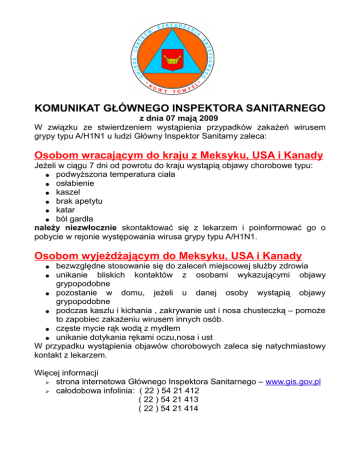 KOMUNIKAT GŁÓWNEGO INSPEKTORA SANITARNEGO z dnia 07 mają 2009 W związku ze stwierdzeniem wystąpienia przypadków zakażeń wirusem grypy typu A/H1N1 u ludzi Główny Inspektor Sanitarny zaleca: Osobom wracającym do kraju z Meksyku, USA i Kanady Jeżeli w ciągu 7 dni od powrotu do kraju wystąpią objawy chorobowe typu: ● podwyższona temperatura ciała ● osłabienie ● kaszel ● brak apetytu ● katar ● ból gardła należy niezwłocznie skontaktować się z lekarzem i poinformować go o pobycie w rejonie występowania wirusa grypy typu A/H1N1. Osobom wyjeżdżającym do Meksyku, USA i Kanady bezwzględne stosowanie się do zaleceń miejscowej służby zdrowia ● unikanie bliskich kontaktów z osobami wykazującymi objawy grypopodobne ● pozostanie w domu, jeżeli u danej osoby wystąpią objawy grypopodobne ● podczas kaszlu i kichania , zakrywanie ust i nosa chusteczką – pomoże to zapobiec zakażeniu wirusem innych osób. ● częste mycie rąk wodą z mydłem ● unikanie dotykania rękami oczu,nosa i ust W przypadku wystąpienia objawów chorobowych zaleca się natychmiastowy kontakt z lekarzem. ● Więcej informacji ➢ strona internetowa Głównego Inspektora Sanitarnego – www.gis.gov.pl ➢ całodobowa infolinia: ( 22 ) 54 21 412 ( 22 ) 54 21 413 ( 22 ) 54 21 414