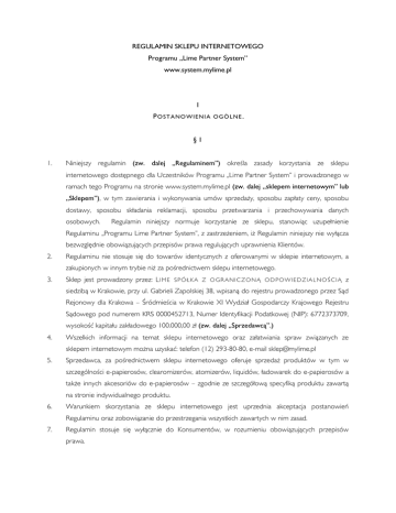 REGULAMIN SKLEPU INTERNETOWEGO Programu „Lime Partner System” www.system.mylime.pl I POSTANOWIENIA OGÓLNE . §1 1. Niniejszy regulamin (zw. dalej „Regulaminem”) określa zasady korzystania ze sklepu internetowego dostępnego dla Uczestników Programu „Lime Partner System” i prowadzonego w ramach tego Programu na stronie www.system.mylime.pl (zw. dalej „sklepem internetowym” lub „Sklepem”), w tym zawierania i wykonywania umów sprzedaży, sposobu zapłaty ceny, sposobu dostawy, sposobu składania reklamacji, sposobu przetwarzania i przechowywania danych osobowych. Regulamin niniejszy normuje korzystanie ze sklepu, stanowiąc uzupełnienie Regulaminu „Programu Lime Partner System”, z zastrzeżeniem, iż Regulamin niniejszy nie wyłącza bezwzględnie obowiązujących przepisów prawa regulujących uprawnienia Klientów. 2. Regulaminu nie stosuje się do towarów identycznych z oferowanymi w sklepie internetowym, a zakupionych w innym trybie niż za pośrednictwem sklepu internetowego. 3. Sklep jest prowadzony przez: L I M E S P Ó Ł K A Z O G R A N I C Z O N Ą O D P O W I E D Z I A L N O Ś C I Ą z siedzibą w Krakowie, przy ul. Gabrieli Zapolskiej 38, wpisaną do rejestru prowadzonego przez Sąd Rejonowy dla Krakowa – Śródmieścia w Krakowie XI Wydział Gospodarczy Krajowego Rejestru Sądowego pod numerem KRS 0000452713, Numer Identyfikacji Podatkowej (NIP): 6772373709, wysokość kapitału zakładowego 100.000,00 zł (zw. dalej „Sprzedawcą”.) 4. Wszelkich informacji na temat sklepu internetowego oraz załatwiania spraw związanych ze sklepem internetowym można uzyskać: telefon (12) 293-80-80, e-mail [email protected] 5. Sprzedawca, za pośrednictwem sklepu internetowego oferuje sprzedaż produktów w tym w szczególności e-papierosów, clearomizerów, atomizerów, liquidów, ładowarek do e-papierosów a także innych akcesoriów do e-papierosów – zgodnie ze szczegółową specyfiką produktu zawartą na stronie indywidualnego produktu. 6. Warunkiem skorzystania ze sklepu internetowego jest uprzednia akceptacja postanowień Regulaminu oraz zobowiązanie do przestrzegania wszystkich zawartych w nim zasad. 7. Regulamin stosuje się wyłącznie do Konsumentów, w rozumieniu obowiązujących przepisów prawa. II W A R U N K I S K Ł A D A N I A I R E A L I ZA C J I ZA M Ó W I E Ń §2 1. Ze Sklepu, w zakresie zawierania umów sprzedaży, ze względu na specyfikę oferowanych produktów (e-papierosy, służące do wprowadzania nikotyny do organizmu) może korzystać każda, będąca członkiem Programu „Lime Partner System” pełnoletnia osoba fizyczna mająca pełną zdolność do czynności prawnych. 2. Sprzedawca przyjmuje zamówienia za pośrednictwem strony internetowej, na której działa sklep internetowy, tj. www.system.mylime.pl 3. Sprzedawca zastrzega sobie prawo do zmiany towarów oraz cen towarów znajdujących się w ofercie sklepu internetowego oraz do przeprowadzania i odwoływania wszelkiego rodzaju akcji promocyjnych oraz wyprzedaży. 4. Szczegółowe właściwości oferowanych do sprzedaży towarów szczegółowo wskazane są w znajdującym się na stronie produktu opisie. 5. Wszystkie ceny podawane są w złotych polskich i zawierają podatek VAT oraz nie zawierają kosztów przesyłki. 6. Cena podana przy każdym towarze na stronie produktu służącej do składania zamówień jest wiążąca dla obu stron od chwili złożenia zamówienia przez Klienta. Cena podana przy każdym towarze uwzględnia rabat przysługujący Uczestnikom Programu „Lime Partner System”, a od tej ceny nie przysługuje dalszy rabat - z wyjątkiem organizowanych przez Sprzedawcę akcji promocyjnych, o których Uczestnicy Programu zostaną poinformowani zgodnie z Regulaminem Programu 7. Zmiana ceny po przyjęciu zamówienia przez Sprzedawcę nie ma wpływu na treść łączącej strony umowy, jednak w razie zmiany asortymentu lub ceny poszczególnych produktów w czasie pomiędzy złożeniem zamówienia a przystąpieniem do realizacji zamówienia przez Sprzedawcę, Klient ma prawo zrezygnować z zakupu danego artykułu, aż do momentu przystąpienia przez Sprzedawcę do realizacji zamówienia niezależnie od innych uprawnień wynikających z niniejszego regulaminu i obowiązujących przepisów prawa. 8. Koszt wysyłki uzależniony jest od wybranego przez Klienta sposobu dostawy oraz sposobu płatności. Ceny wysyłki podawane są każdorazowo w chwili składania zamówienia. Aktualnie obowiązujące informacje o kosztach wysyłki dostępne są na stronie www.system.mylime.pl W przypadku rozbieżności między kosztem wysyłki podanym na wskazanej stronie internetowej, a kosztem podanym w trakcie składania zamówienia – obowiązuje cena niższa. §3 1. Dokonanie zakupów w sklepie internetowym jest możliwe wyłącznie po internetowym zarejestrowaniu się w Programie „Lime Partner System” i dokonaniu pełnej aktywacji konta i podaniu w procesie rejestracji wszelkich wymaganych w formularzu danych – w tym aktualnych i poprawnych danych adresowych. 2. Do czasu pełnej aktywacji przecz Uczestnika Programu konta użytkownika, w Sklepie dostępne będą do zakupu wyłącznie wybrane produkty. Sprzedawca zastrzega sobie prawo do zmiany produktów oferowanych osobom, które nie dokonały pełnej aktywacji konta. 3. Dokonanie zakupów w sklepie nie jest możliwe bez rejestracji w Programie „Lime Partner System” 4. Sprzedawca zastrzega, że podanie przez Klienta błędnego adresu do doręczeń może skutkować brakiem możliwości doręczenia zamówionego towaru. 5. Publikacja informacji o towarach i ich cenach dokonana na stronie sklepu internetowego stanowi zaproszenie do składania oferty kupna w rozumieniu art. 66 i nast. ustawy z dnia 23 kwietnia 1964 r. Kodeks Cywilny (Dz.U.1964.16.93 ze zm.) 6. Klient składając zamówienie za pośrednictwem sklepu internetowego składa ofertę kupna towaru. 7. Po złożeniu zamówienia przez Klienta, Sprze