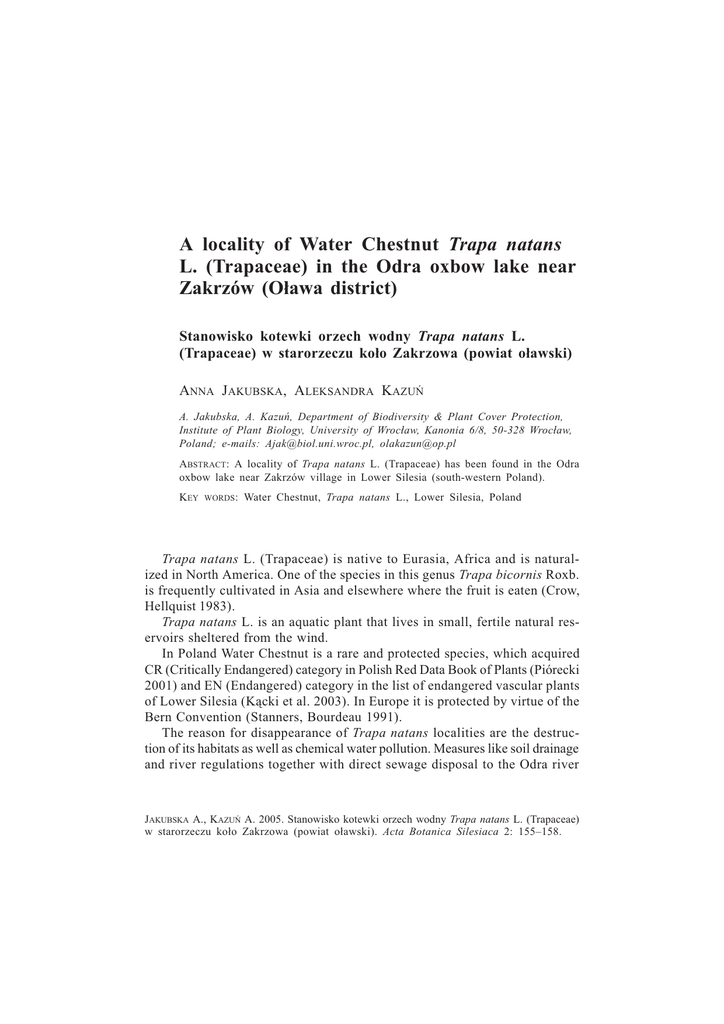 A locality of Water Chestnut Trapa natans L. (Trapaceae) in the Odra
