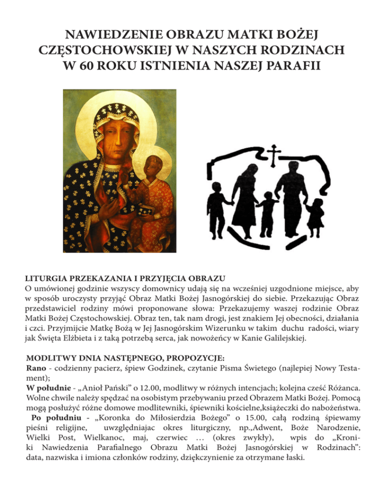NAWIEDZENIE OBRAZU MATKI BOŻEJ CZĘSTOCHOWSKIEJ W NASZYCH RODZINACH W 60 ROKU ISTNIENIA NASZEJ PARAFII LITURGIA PRZEKAZANIA I PRZYJĘCIA OBRAZU O umówionej godzinie wszyscy domownicy udają się na wcześniej uzgodnione miejsce, aby w sposób uroczysty przyjąć Obraz Matki Bożej Jasnogórskiej do siebie. Przekazując Obraz przedstawiciel rodziny mówi proponowane słowa: Przekazujemy waszej rodzinie Obraz Matki Bożej Częstochowskiej. Obraz ten, tak nam drogi, jest znakiem Jej obecności, działania i czci. Przyjmijcie Matkę Bożą w Jej Jasnogórskim Wizerunku w takim duchu radości, wiary jak Święta Elżbieta i z taką potrzebą serca, jak nowożeńcy w Kanie Galilejskiej. MODLITWY DNIA NASTĘPNEGO, PROPOZYCJE: Rano - codzienny pacierz, śpiew Godzinek, czytanie Pisma Świetego (najlepiej Nowy Testament); W południe - „Anioł Pański” o 12.00, modlitwy w różnych intencjach; kolejna cześć Różanca. Wolne chwile należy spędzać na osobistym przebywaniu przed Obrazem Matki Bożej. Pomocą mogą posłużyć różne domowe modlitewniki, śpiewniki kościelne,książeczki do nabożeństwa. Po południu - „Koronka do Miłosierdzia Bożego” o 15.00, całą rodziną śpiewamy pieśni religijne, uwzględniajac okres liturgiczny, np.,Adwent, Boże Narodzenie, Wielki Post, Wielkanoc, maj, czerwiec … (okres zwykły), wpis do „Kroniki Nawiedzenia Parafialnego Obrazu Matki Bożej Jasnogórskiej w Rodzinach”: data, nazwiska i imiona członków rodziny, dziękczynienie za otrzymane łaski.