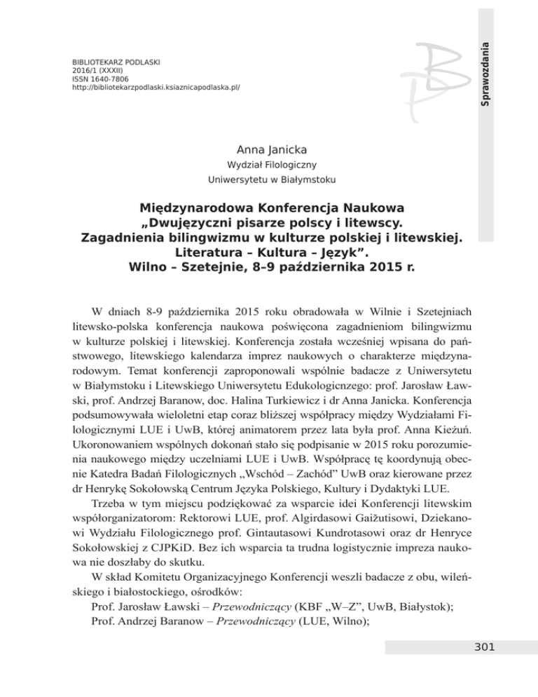 Sprawozdania BIBLIOTEKARZ PODLASKI 2016/1 (XXXII) ISSN 1640-7806 http://bibliotekarzpodlaski.ksiaznicapodlaska.pl/ Anna Janicka Wydział Filologiczny Uniwersytetu w Białymstoku Międzynarodowa Konferencja Naukowa „Dwujęzyczni pisarze polscy i litewscy. Zagadnienia bilingwizmu w kulturze polskiej i litewskiej. Literatura – Kultura – Język”. Wilno – Szetejnie, 8–9 października 2015 r. W dniach 8-9 października 2015 roku obradowała w Wilnie i Szetejniach litewsko-polska konferencja naukowa poświęcona zagadnieniom bilingwizmu w kulturze polskiej i litewskiej. Konferencja została wcześniej wpisana do państwowego, litewskiego kalendarza imprez naukowych o charakterze międzynarodowym. Temat konferencji zaproponowali wspólnie badacze z Uniwersytetu w Białymstoku i Litewskiego Uniwersytetu Edukologicnzego: prof. Jarosław Ławski, prof. Andrzej Baranow, doc. Halina Turkiewicz i dr Anna Janicka. Konferencja podsumowywała wieloletni etap coraz bliższej współpracy między Wydziałami Filologicznymi LUE i UwB, której animatorem przez lata była prof. Anna Kieżuń. Ukoronowaniem wspólnych dokonań stało się podpisanie w 2015 roku porozumienia naukowego między uczelniami LUE i UwB. Współpracę tę koordynują obecnie Katedra Badań Filologicznych „Wschód – Zachód” UwB oraz kierowane przez dr Henrykę Sokołowską Centrum Języka Polskiego, Kultury i Dydaktyki LUE. Trzeba w tym miejscu podziękować za wsparcie idei Konferencji litewskim współorganizatorom: Rektorowi LUE, prof. Algirdasowi Gaižutisowi, Dziekanowi Wydziału Filologicznego prof. Gintautasowi Kundrotasowi oraz dr Henryce Sokołowskiej z CJPKiD. Bez ich wsparcia ta trudna logistycznie impreza naukowa nie doszłaby do skutku. W skład Komitetu Organizacyjnego Konferencji weszli badacze z obu, wileńskiego i białostockiego, ośrodków: Prof. Jarosław Ławski – Przewodniczący (KBF „W–Z”, UwB, Białystok); Prof. Andrzej Baranow – Przewodniczący (LUE, Wilno); 301 Sprawozdania 302 Anna Janicka, Międzynarodowa Konferencja Naukowa „Dwujęzyczni pisarze polscy i litewscy...” Mgr Monika Jurkowska – Wydział Filologiczny UwB – Sekretarz Konferencji; Mgr Piotr Drozdowski – Wydział Filologiczny UwB – Sekretarz Konferencji; Dr Henryka Sokołowska – Kierownik Centrum Języka Polskiego, Kultury i Dydaktyki (LUE, Wilno); Dr hab. Anna Wydrycka – Zakład Literatury Pozytywizmu i Młodej Polski UwB; Doc. dr Barbara Dwilewicz – Litewski Uniwersytet Edukologiczny, Wilno; Doc. dr Romuald Naruniec – Litewski Uniwersytet Edukologiczny, Wilno; Doc. dr Halina Turkiewicz – Litewski Uniwersytet Edukologiczny, Wilno; Dr Anna Janicka – Wydział Filologiczny Uniwersytetu w Białymstoku; Dr Łukasz Zabielski – Książnica Podlaska im. Łukasza Górnickiego w Bia łymstoku. Przygotowaniom do wileńskiego spotkania patronował Honorowy Komitet Naukowy Konferencji w składzie: Prof. dr Gintautas Kundrotas – Przewodniczący (LUE, Wilno); Prof. dr Žydronė Kolevinskienė (LUE, Wilno); Doc. dr Irena Masojć (LUE, Wilno); Prof. dr Sigutė Radzevičienė (LUE, Wilno); Doc. dr Dainius Vaitiekūnas (LUE, Wilno); Prof. Mieczysław Jackiewicz (UWM, Olsztyn); Prof. Aleksander Fiut (UJ, Kraków); Prof. Halina Krukowska (UwB, Białystok); Prof. Michał Kuziak (UW, Warszawa); Prof. Agnieszka Czajkowska (AJD, Częstochowa). Obrady odbywały się pierwszego dnia w salach Litewskiego Uniwersytetu Edukologicnzego (ul. Studentų 39), następnego zaś dnia w Centrum Kultury im. Czesława Miłosza w Szetejniach. W Konferencji wzięło udział 35 badaczy, w tym 19 z Polski oraz po jednej osobie z Białorusi i Ukrainy. Obrady plenarne 8 października (czwartek) otworzyli swymi wystąpieniami: 1. Prof. dr hab. Tadeusz Bujnicki (UW, Warszawa) – Litwini polemizują po polsku (przyczynek do publicystyki w międzywojennym Wilnie); 2. Doc. dr Dainius Vaitiekūnas (LUE, Wilno) – Česlovo Milošo ir Tomo Venclovos dialogas; 3. Dr Grzegorz Czerwiński (UwB, Białystok) – Adas Jakubauskas – tatarski poeta Litwy; 4. Prof. dr hab. Leszek Libera (UZ, Zielona Góra) – Niemiecka ballada i piosenka polska. Wokół „Adeli” Antoniego Edwarda Odyńca. Bibliotekarz Podlaski Następnie w godzinach popołudniowych obradowano w III sekcjach: Sekcja I: Pisarze dwujęzyczni: klasycy, XIX-wieczność; Sekcja II: Twórczość pisarzy dwujęzycznych: wymiary nowoczesności; Sekcja III: Kulturowe źródła i konteksty bilingwizmu. Wśród referentów wymienić można: dra hab. Pawła Bukowca (UJ, Kraków), który mówił o Dwujęzycznej literaturze litewsko-polskiej w wieku XIX (najważniejszych pytaniach historycznoliterackich), dr Małgorzatę Litwinowicz-Droździel (UW, Warszawa), która rozprawiała o Języku jako projekcie pamięci. Doc. dr Irena Fedorowicz (Uniwersytet Wileński) zastanawiała się nad Nieznanymi kontekstami korespondencji J. A. Herbaczewskiego i J. Wichert-Kajruksztisowej. Z kolei dr hab. Elżbieta Flis-Czerniak (UMCS, Lublin) analizowała temat „Tajemna księga Litwy”. Józef Albin Herbaczewski i Tadeusz Miciński. Prof. dr hab. Andrzej Baranow (LUE, Wilno) omówił Twórczość litewskich i polskich pisarzy dwujęzycznych w kontekście komparatystyki dyskursywnej, zaś dr Monika PokorskaIwaniuk (UAM, Poznań) „Znad Biruty” Maironisa – polskie dzieło litewskiego twórcy. Z kolei doc. dr Halina Turkiewicz (LUE, Wilno) poświęciła swe wystąpie- Sprawozdania Anna Janicka, Międzynarodowa Konferencja Naukowa „Dwujęzyczni pisarze polscy i litewscy...” Od lewej: prof. Swietłana Musijenko (Grodzieński Uniwersytet Państwowy im. Janki Kupały, Białoruś) i prof. Tadeusz Bujnicki (Wydział „Artes Liberales”, Uniwersytet Warszawski) Bibliotekarz Podlaski 303 Sprawozdania Anna Janicka, Międzynarodowa Konferencja Naukowa „Dwujęzyczni pisarze polscy i litewscy...” nie zagadnieniu: Władysław Abramowicz: owoce dwujęzyczności, a prof. dr hab. Violetta Wróblewska (UMK, Toruń