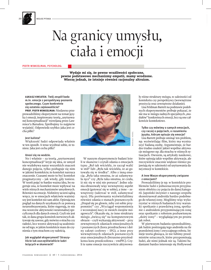 WIELKIE PYTANIA Na granicy umysłu, ciała i emocji PIOTR WINKIELMAN, PSYCHOLOG: Wydaje mi się, że pewne wrażliwości społeczne, pewne podstawowe mechanizmy empatii, mamy wrodzone. Wierzę jednak, że istnieje również racjonalny altruizm. ły różne struktury mózgu, w zależności od kontekstu czy perspektywy (wewnętrzne przeżycia oraz zewnętrzne działanie). Lisa Feldman Barrett na podstawie podobnych eksperymentów próbuje pokazać, że nie ma w mózgu żadnych specjalnych „modułów” konkretnych emocji, lecz są one całkowicie kontekstowe. ŁUKASZ KWIATEK: Twój zespół bada m.in. emocje z perspektywy poznania społecznego. Czym konkretnie się ostatnio zajmowaliście? PROF. PIOTR WINKIELMAN: Niedawno przeprowadziliśmy eksperyment na temat języka i emocji, inspirowany teorią „usytuowanej konceptualizacji” rozwijaną przez Lawrence’a Barsalou. Spróbujmy to najpierw wyjaśnić. Odpowiedz szybko: jaka jest cecha piłki? M AT E U S Z H O H O L 20 Jest kulista? Większość ludzi odpowiada właśnie w ten sposób. A teraz wyobraź sobie, że toniesz. Jaka jest cecha piłki? Unosi się na wodzie. No i właśnie – za teorią „usytuowanej konceptualizacji” kryje się idea, że umysł nie wydobywa naraz wszystkich znaczeń danego pojęcia, tylko posługuje się nim w jakimś kontekście; to kontekst narzuca znaczenie. Czasami może to być kontekst pragmatyczny – jak wtedy, gdy toniesz. W teorii pojęć to bardzo ważna idea, bo sugeruje ona, że kontekst może wpływać na wiele różnych mechanizmów umysłowych. Również na emocje. Niektórzy uczeni sądzą wręcz, że w emocjach właściwie ważniejszy jest kontekst niż sam afekt. Opierają ten pogląd na danych uzyskanych za pomocą neuroobrazowania, które sugerują, że nie ma wzorców aktywności neuronalnej specyficznych dla danych emocji. Czyli nie jest tak, że dana grupa komórek nerwowych aktywuje się zawsze, gdy mówisz o strachu czy radości, lecz wzorce aktywacji są uzależnione od tego, w jakim kontekście masz do czynienia z tym strachem czy radością. Jak wyglądał eksperyment? Straszyliście lub uszczęśliwialiście ludzi leżących w skanerach? tygodnik powszechny W naszym eksperymencie badani leżeli w skanerze i czytali zdania o emocjach typu: „Był tak wściekły, że zaczął walić w stół” lub: „Była tak wściekła, że aż gotowała się w środku”. Albo z inną emocją: „Była taka smutna, że aż załamywała ręce” czy „Była taka smutna, że czuła, iż nic się w niej nie porusza”. Jedne zdania obrazowały więc wewnętrzny aspekt emocji (gotować się w sobie), a inne – zewnętrzny (uderzać w stół, załamywać ręce). Dla porównania wyświetlaliśmy również zdania o stanach poznawczych: „Drapał się po głowie, żeby coś sobie przypomnieć” czy „Wyciągał wspomnienia z wczorajszej nocy ze swoich zwojów mózgowych”. Okazało się, że inne struktury mózgu „świecą się” na komputerowym obrazie – czyli wykazują aktywność – przy zewnętrznych zdaniach emocjonalnych i poznawczych (kora przedruchowa i dolny zakręt czołowy – IFG), a inne przy wewnętrznych zdaniach poznawczych oraz emocjonalnych (brzuszno-przyśrodkowa kora przedczołowa – vmPFC). Czyli te same emocje rzeczywiście aktywowa- 40 | 5 października 2014 Tylko czy mówimy o samych emocjach, czy raczej o pojęciach, o rozumieniu języka, którym opisuje się emocje? Lisa Barrett próbuje ominąć ten problem, np. wyświetlając film, który ma wystraszyć badaną osobę. Argumentuje, że bardzo trudno znaleźć jakieś wspólne aktywacje mózgowe np. dla strachu w różnych sytuacjach. Owszem, są artykuły naukowe, które opisują takie wspólne aktywacje, ale rzeczywiście znacznie większe różnice pojawiają się w zależności od usytuowania danej emocji w kontekście. A inne Wasze eksperymenty związane z emocjami? Prowadziliśmy je np. w kontekście problemów ludzi z jednoznacznym przypisaniem obiektu czy pojęcia do danej kategorii. Japoński inżynier z naszego zespołu skonstruował androida bardzo podobnego do własnej żony. Mogliśmy więc wykorzystać w różnych badaniach trzy warunki: spotkanie z prawdziwą żoną, spotkanie z androidem przypominającym żonę oraz spotkanie z robotem pozbawionym „skóry żony” – wyglądającym po prostu jak robot. W pierwszym badaniu sprawdzaliśmy, jak ludzie postrzegają tego androida na tle prawdziwej żony i zwyczajnego robota. Istnieje teoria głosząca, że nie lubimy przedmiotów sztucznych, które przypominają ludzi, ale nimi jednak nie są. Takimi badaniami bardzo interesuje się Hollywood – oni produkują przecież coraz lepsze animacje, a tu się okazuje, że im lepsza, tym mniej się widzom podoba. Jest w tym jakiś paradoks. Najpierw po prostu pokazywaliśmy uczestnikom eksperymentu nagrania filmu z żoną, z androidem oraz ze zwykłym robotem. I pytaliśmy badanych, na ile każde z nich polubili. Okazało się, że android jest generalnie lubiany. Wtedy poprosiliśmy uczestników, którzy oglądali nagrania, o odpowiedź na pytanie, czy mają w danym przypadku do czynienia z człowiekiem, czy z robotem. Następnie znów zapytaliśmy, jak bardzo polubili bohate- rów nagrań. Co się okazało? Android nie był już tak lubiany. Tylko dlatego, że zmusił badanych do wysiłku umysłowego? Tak to wyjaśnialiśmy. Umysł zawsze próbuje kategoryzować elementy otaczającej nas rzeczywistości. Jednak gdy coś, jak android, znajduje się w „dolinie nieoznaczoności”, trudniej zakończyć aktywność poznawczą, co przekłada się na stres, brak pozytywnego afektu itd. Nazwaliśmy to teorią „fluencji” (ang. fluency – biegłość, sprawność), poświęciliśmy temu zjawisku również inne eksperymen- ty. Nieszczęsny android jest ofiarą naszej kategoryzacji. Ale skąd pewność, że badani nie kłamali, że coś im się podoba lub nie? Z tym faktycznie może być problem. I n