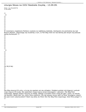 ..:: Parafia p.w. M.B. Różańcowej - Salezjanie Gumieńce ::.. Liturgia Słowa na XXIV Niedziele Zwykłą - 13.09.09. Autor: ks. Krzysztof Sz 11.09.2009. W rozwinięciu znajdziecie Państwo czytania na najbliższą niedzielę. Zachęcamy do pochylenia się nad Bożym Słowem. Zapoznając się wcześniej z tym, co Pan Bóg mówi do nas łatwiej jest skupić się podczas samej Eucharystii. (Iz 50,5-9a) Pan Bóg otworzył Mi ucho, a Ja się nie oparłem ani się cofnąłem. Podałem grzbiet mój bijącym i policzki moje rwącym Mi brodę. Nie zasłoniłem mojej twarzy przed zniewagami i opluciem. Pan Bóg Mnie wspomaga, dlatego jestem nieczuły na obelgi, dlatego uczyniłem twarz moją jak głaz i wiem, że wstydu nie doznam. Blisko jest Ten, który Mnie uniewinni. Kto się odważy toczyć spór ze Mną? Wystąpmy razem! Kto jest moim oskarżycielem? Niech się zbliży do Mnie! Oto Pan Bóg Mnie wspomaga. Któż Mnie potępi? http://salezjaniegumience.pl Kreator PDF Utworzono 4 March, 2017, 04:25 ..:: Parafia p.w. M.B. Różańcowej - Salezjanie Gumieńce ::.. (Ps 116A,1-6.8-9) REFREN: W krainie życia będę widział Boga Miłuję Pana, albowiem usłyszał głos mego błagania, bo skłonił ku mnie swe ucho w dniu, w którym wołałem. http://salezjaniegumience.pl Kreator PDF Utworzono 4 March, 2017, 04:25 ..:: Parafia p.w. M.B. Różańcowej - Salezjanie Gumieńce ::.. Oplotły mnie więzy śmierci, dosięgły mnie pęta otchłani, ogarnął mnie strach i udręka. Ale wezwałem imienia Pana: „O Panie, ratuj me życie!” Pan jest łaskawy i sprawiedliwy, http://salezjaniegumience.pl Kreator PDF Utworzono 4 March, 2017, 04:25 ..:: Parafia p.w. M.B. Różańcowej - Salezjanie Gumieńce ::.. Bóg nasz jest miłosierny. Pan strzeże ludzi prostego serca: byłem w niewoli, a On mnie wybawił. Uchronił bowiem moją duszę od śmierci, oczy moje od łez, nogi od upadku. Będę chodził w obecności Pana w krainie żyjących. http://salezjaniegumience.pl Kreator PDF Utworzono 4 March, 2017, 04:25 ..:: Parafia p.w. M.B. Różańcowej - Salezjanie Gumieńce ::.. (Jk 2,14-18) Jaki z tego pożytek, bracia moi, skoro ktoś będzie utrzymywał, że wierzy, a nie będzie spełniał uczynków? Czy /sama/ wiara zdoła go zbawić? Jeśli na przykład brat lub siostra nie mają odzienia lub brak im codziennego chleba, ktoś z was powie im: Idźcie w pokoju, ogrzejcie się i najedzcie do syta! - a nie dacie im tego, czego koniecznie potrzebują dla ciała - to na co się to przyda? Tak też i wiara, jeśli nie byłaby połączona z uczynkami, martwa jest sama w sobie. Ale może ktoś powiedzieć: Ty masz wiarę, a ja spełniam uczynki. Pokaż mi wiarę swoją bez uczynków, to ja ci pokażę wiarę ze swoich uczynków. (Ga 6,14) http://salezjaniegumience.pl Kreator PDF Utworzono 4 March, 2017, 04:25 ..:: Parafia p.w. M.B. Różańcowej - Salezjanie Gumieńce ::.. Nie daj Boże, bym się miał chlubić z czego innego, jak tylko z Krzyża Chrystusa, dzięki któremu świat stał się ukrzyżowany dla mnie, a ja dla świata. (Mk 8,27-35) Potem Jezus udał się ze swoimi uczniami do wiosek pod Cezareą Filipową. W drodze pytał uczniów: Za kogo uważają Mnie ludzie? Oni Mu odpowiedzieli: Za Jana Chrzciciela, inni za Eliasza, jeszcze inni za jednego z proroków. On ich zapytał: A wy za kogo mnie uważacie? Odpowiedział Mu Piotr: Ty jesteś Mesjasz. Wtedy surowo im przykazał, żeby nikomu o Nim nie mówili. I zaczął ich pouczać, że Syn Człowieczy musi wiele cierpieć, że będzie odrzucony przez starszych, arcykapłanów i uczonych w Piśmie; że będzie zabity, ale po trzech dniach zmartwychwstanie. A mówił zupełnie otwarcie te słowa. Wtedy Piotr wziął Go na bok i zaczął Go upominać. Lecz On obrócił się i patrząc na swych uczniów, zgromił Piotra słowami: Zejdź Mi z oczu, szatanie, bo nie myślisz o tym, co Boże, ale o tym, co ludzkie. Potem przywołał do siebie tłum razem ze swoimi uczniami i rzekł im: Jeśli kto chce pójść za Mną, niech się zaprze samego siebie, niech weźmie krzyż swój i niech Mnie naśladuje! Bo kto chce zachować swoje życie, straci je; a kto straci swe życie z powodu Mnie i Ewangelii, zachowa je. http://salezjaniegumience.pl Kreator PDF Utworzono 4 March, 2017, 04:25