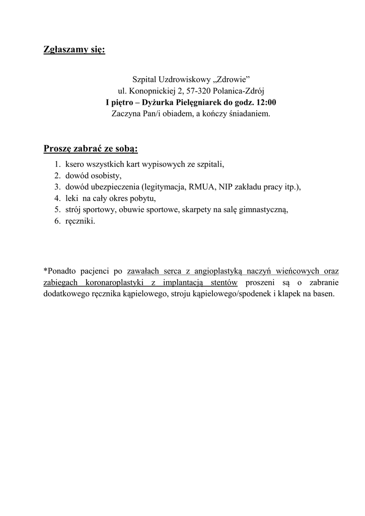 Zgłaszamy się: Szpital Uzdrowiskowy „Zdrowie” ul. Konopnickiej 2, 57-320 Polanica-Zdrój I piętro – Dyżurka Pielęgniarek do godz. 12:00 Zaczyna Pan/i obiadem, a kończy śniadaniem. Proszę zabrać ze sobą: 1. 2. 3. 4. 5. 6. ksero wszystkich kart wypisowych ze szpitali, dowód osobisty, dowód ubezpieczenia (legitymacja, RMUA, NIP zakładu pracy itp.), leki na cały okres pobytu, strój sportowy, obuwie sportowe, skarpety na salę gimnastyczną, ręczniki. *Ponadto pacjenci po zawałach serca z angioplastyką naczyń wieńcowych oraz zabiegach koronaroplastyki z implantacją stentów proszeni są o zabranie dodatkowego ręcznika kąpielowego, stroju kąpielowego/spodenek i klapek na basen.