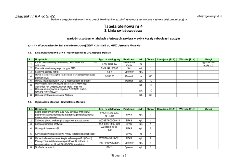 Załącznik nr 6.4 do SIWZ obejmuje tomy: 4, 5 Budowa zespołu elektrowni wiatrowych Kukinia II wraz z infrastrukturą techniczną - zakres telekomunikacyjny Tabela ofertowa nr 4 3. Linia światłowodowa Wartość urządzeń w tabelach ofertowych zawiera w sobie koszty robocizny i sprzętu tom 4 - Wprowadzenie linii światłowodowej ZEW Kukinia II do GPZ Ustronie Morskie 1.1. Lp. 1 2 3 4 5 6 7 8 1.2. Lp. Linia światłowodowa OTK-1 - wprowadzenie do GPZ Ustronie Morskie Urządzenie Kabel światłowodowy zewnętrzny, jednomodowy włóknowy Znacznik elektromagnetyczny typu EMS Typ / nr katalogowy 12- Skrzynka zapasu kabla Rurka instalacyjna giętka karbowana nierozprzestrzeniajaca płomieni ∅25 Uchwyt instalacyjny rury ∅ 25 z mocowaniem do ściany Przywieszka identyfikacyjna zawierająca informacje: właściciel; rok ułożenia, numer kabla i jego typ Opaska ostrzegawcza z napisem "UWAGA! KABEL ŚWIATŁOWODOWY" Opaska kablowa (zaciskowa) 160 mm Jedn. Obmiar m - EMS 1421-XR/iD Producent Tele-Fonika Kable 3M szt. 1 SZ-4 Optomer kpl. 1 RGHF 25 Marmat m 65 Marmat szt. 70 szt. 10 szt. 10 szt. 60 Z-XOTKtsd 12J Typ / nr katalogowy Producent Jedn. Obmiar SZB-022-13AA-242211-011 ZPAS kpl. 1 2 WZ-SB76-00-00-011 ZPAS kpl. 1 3 Listwa uziemienia szafy Cu ZPAS kpl. 1 4 Uchwyty kablowe 44x88 WZ-3393-11-00-000 WZ-SB52-00-05000 ZPAS kpl. 2 5 Koryto kablowe grzebieniowe 40x60 (szerokość x głębokość) ZPAS m 4 6 Ceownik do usztywnienia koryta kablowego 42U (40mm) Przełącznica światłowodowa panelowa 12 polowa - z wyposażeniem na 12 pól E2000/APC, kompletna Szuflada zapasu 1U WZSB00-31-14-011 ZPAS kpl. 2 PS-19/12/K/12/E2A Optomer kpl. 1 SZ-19 Optomer kpl. 1 7 8 Wartość [PLN] Uwagi ujęto łącznie w pkt. 1.3 Cena jedn. [PLN] Wartość [PLN] Uwagi Wyposażenie stacyjne - GPZ Ustronie Morskie Urządzenie Szafa teleinformatyczna SZB 42U 600x600 mm; drzwi przednie szklane; drzwi tylne blaszabe z perforacją; boki z blachy; cokół 100 mm Zaślepka płyty z włókniną i przepustem szczotkowym 1 Cena jedn. [PLN] Strona 1 z 2 Załącznik nr 6.4 do SIWZ obejmuje tomy: 4, 5 Budowa zespołu elektrowni wiatrowych Kukinia II wraz z infrastrukturą techniczną - zakres telekomunikacyjny Lp. Typ / nr katalogowy Producent Jedn. Obmiar 9 Urządzenie Osłonka spawu światłowodu FSP-45 Optomer szt. 12 10 Przewód uziemienia LgYżo25 LgYżo25 m 10 11 Przewód uziemienia LgYżo6 LgYżo6 m 6 Cena jedn. [PLN] Wartość [PLN] Uwagi Wartość [PLN] Uwagi suma tomu 4 tom 5 - Budowa linii światłowodowych ZEW Kukinia II 1.3. Lp. Linie światłowodowe Urządzenie 1 Uszczelka końców rur z kablem 40 2 Kabel światłowodowy zewnętrzny, jednomodowy 12 włóknowy 3 4 5 Kopułowa osłona złączowa o długości 420 mm, 4 porty okrągłe i 1 port owalny (w zestawie osłony uszczelnienie portu owalnego, 1 kaseta na 24 spawy) Znacznik elektromagnetyczny typu EMS 7 Stelaż zapasu kabla Rurka instalacyjna giętka karbowana nierozprzestrzeniajaca płomieni ∅25 Pigtail jednomodowy ST/PC-2,5m 8 Adapter ST/PC SM 9 12 Osłonka spawu światłowodu Przywieszka identyfikacyjna zawierająca informacje: właściciel; rok ułożenia, numer kabla i jego typ Opaska ostrzegawcza z napisem "UWAGA! KABEL ŚWIATŁOWODOWY" Opaska kablowa (zaciskowa) 160 mm 13 Opaska kablowa (zaciskowa) 250 mm 6 10 11 Typ / nr katalogowy Producent Jedn. Obmiar UszK40 Plastal Jako szt. 22 Tele-Fonika Kable m 5327 Tyco kpl. 1 EMS 1421-XR/iD 3M szt. 2 SZ-2 Optomer kpl. 5 RGHF 25 Marmat m 75 FOSC 400A4-S24-1-BN-N STP/02,5/SM/T/1J Optomer szt. 60 AST/PC SM Optomer szt. 60 FSP-45 Optomer szt. 72 szt. 14 szt. 14 szt. 24 szt. 30 Cena jedn. [PLN] łącznie z wprowadzeniem do GPZ UWAGA! Rury osłonowe RHDPE 40/3,7 ujęto w projekcie linii kablowych SN suma tomu 5 Ogółem tabela nr 4 Strona 2 z 2