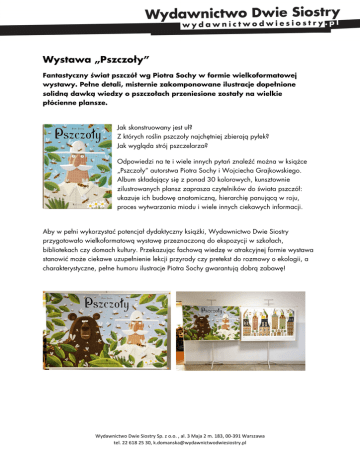 Wystawa „Pszczoły” Fantastyczny świat pszczół wg Piotra Sochy w formie wielkoformatowej wystawy. Pełne detali, misternie zakomponowane ilustracje dopełnione solidną dawką wiedzy o pszczołach przeniesione zostały na wielkie płócienne plansze. Jak skonstruowany jest ul? Z których roślin pszczoły najchętniej zbierają pyłek? Jak wygląda strój pszczelarza? Odpowiedzi na te i wiele innych pytań znaleźć można w książce „Pszczoły” autorstwa Piotra Sochy i Wojciecha Grajkowskiego. Album składający się z ponad 30 kolorowych, kunsztownie zilustrowanych plansz zaprasza czytelników do świata pszczół: ukazuje ich budowę anatomiczną, hierarchię panującą w roju, proces wytwarzania miodu i wiele innych ciekawych informacji. Aby w pełni wykorzystać potencjał dydaktyczny książki, Wydawnictwo Dwie Siostry przygotowało wielkoformatową wystawę przeznaczoną do ekspozycji w szkołach, bibliotekach czy domach kultury. Przekazując fachową wiedzę w atrakcyjnej formie wystawa stanowić może ciekawe uzupełnienie lekcji przyrody czy pretekst do rozmowy o ekologii, a charakterystyczne, pełne humoru ilustracje Piotra Sochy gwarantują dobrą zabawę! Wydawnictwo Dwie Siostry Sp. z o.o. , al. 3 Maja 2 m. 183, 00-391 Warszawa tel. 22 618 25 30, [email protected] Dane techniczne: Wystawa składa się z 9 plansz z laminowanego płótna, zakończonych z dwóch stron plastikowymi drążkami usztywniającymi. Górny drążek dodatkowo wyposażony jest w sznurek do zawieszenia. Po zwinięciu i zabezpieczeniu folią ochronną plansze mieszczą się w kartonie o wymiarach 160×50×50 cm. Waga paczki około 12 kg. Wydawnictwo Dwie Siostry Sp. z o.o. , al. 3 Maja 2 m. 183, 00-391 Warszawa tel. 22 618 25 30, [email protected]