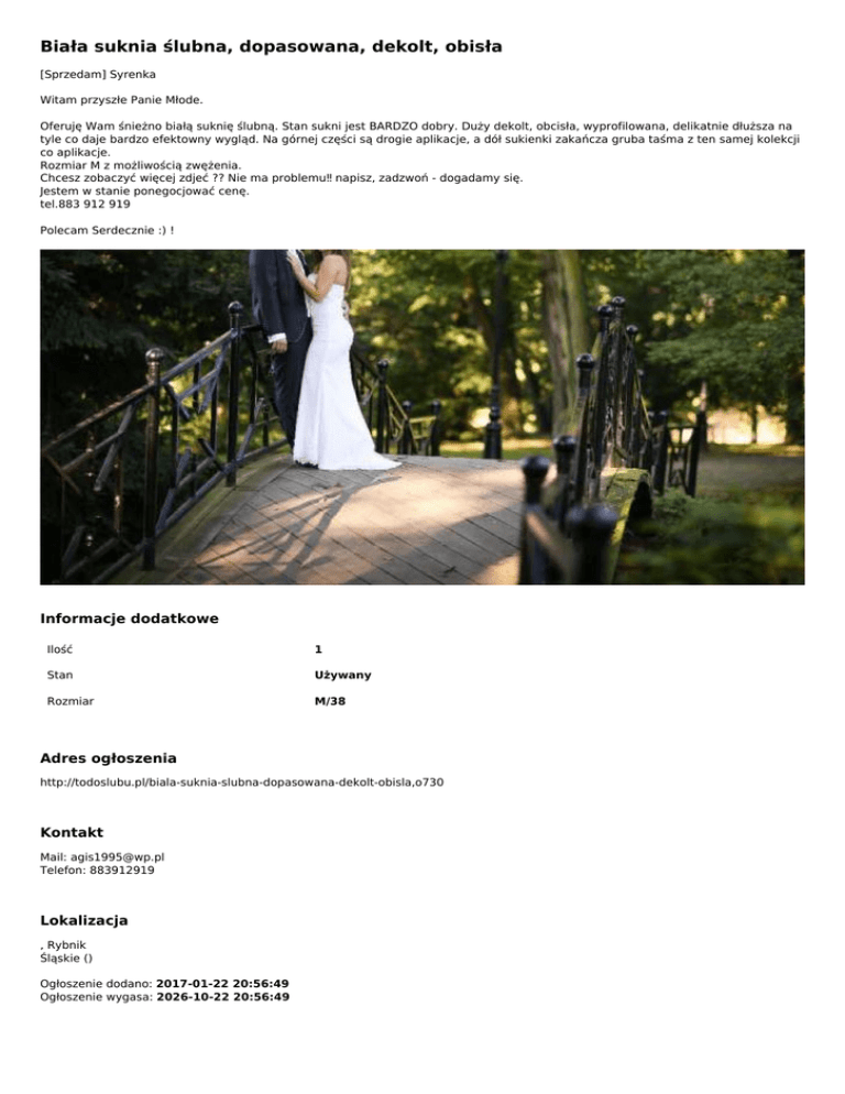 Biała suknia ślubna, dopasowana, dekolt, obisła [Sprzedam] Syrenka Witam przyszłe Panie Młode. Oferuję Wam śnieżno białą suknię ślubną. Stan sukni jest BARDZO dobry. Duży dekolt, obcisła, wyprofilowana, delikatnie dłuższa na tyle co daje bardzo efektowny wygląd. Na górnej części są drogie aplikacje, a dół sukienki zakańcza gruba taśma z ten samej kolekcji co aplikacje. Rozmiar M z możliwością zwężenia. Chcesz zobaczyć więcej zdjeć ?? Nie ma problemu‼️ napisz, zadzwoń - dogadamy się. Jestem w stanie ponegocjować cenę. tel.883 912 919 Polecam Serdecznie :) ! Informacje dodatkowe Ilość 1 Stan Używany Rozmiar M/38 Adres ogłoszenia http://todoslubu.pl/biala-suknia-slubna-dopasowana-dekolt-obisla,o730 Kontakt Mail: [email protected] Telefon: 883912919 Lokalizacja , Rybnik Śląskie () Ogłoszenie dodano: 2017-01-22 20:56:49 Ogłoszenie wygasa: 2026-10-22 20:56:49 Powered by TCPDF (www.tcpdf.org)