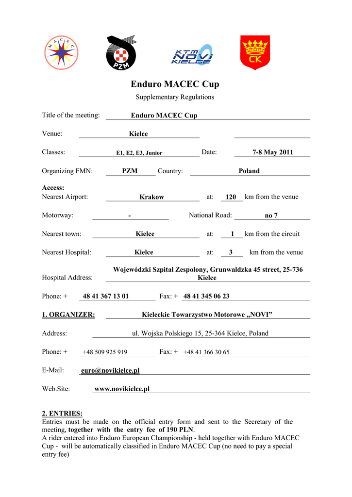 Enduro MACEC Cup Supplementary Regulations Title of the meeting: Enduro MACEC Cup Venue: Kielce Classes: E1, E2, E3, Junior Organizing FMN: Krakow Motorway: 7-8 May 2011 Country: PZM Access: Nearest Airport: Date: - Poland at: 120 National Road: no 7 km from the circuit Nearest town: Kielce at: 1 Nearest Hospital: Kielce at: 3 Fax: + 48 41 345 06 23 48 41 367 13 01 Kieleckie Towarzystwo Motorowe „NOVI” 1. ORGANIZER: Address: ul. Wojska Polskiego 15, 25-364 Kielce, Poland Phone: + +48 509 925 919 E-Mail: [email protected] Web.Site: km from the venue Wojewódzki Szpital Zespolony, Grunwaldzka 45 street, 25-736 Kielce Hospital Address: Phone: + km from the venue Fax: + +48 41 366 30 65 www.novikielce.pl 2. ENTRIES: Entries must be made on the official entry form and sent to the Secretary of the meeting, together with the entry fee of 190 PLN. A rider entered into Enduro European Championship - held together with Enduro MACEC Cup - will be automatically classified in Enduro MACEC Cup (no need to pay a special entry fee) Address: Phone: + ul. Wojska Polskiego 15, 25-364 Kielce, Poland Fax: + +48 509 925 919 E-Mail: +48 41 366 30 65 [email protected] 3. SECRETARIAT OF THE MEETING: Address: Phone: + Football Stadium, Kielce, Sciegiennego 8 street Fax: + +48 509 925 919 E-Mail: +48 41 366 30 65 [email protected] 4. WELCOME CENTER: Place: Open on: Football Stadium, Kielce, Sciegiennego 8 street Thursday: from: 10.00 to: 21.00 Friday: from: 8.00 to: 22.00 5. OFFICIALS: Marek Kopczyński FIM Lic. Nr. 5496 Clerk of the course: Ryszard Bracik FIM Lic. Nr. 5494 Secretary of the Meeting: Andrzej Grzyb Chief Technikal Steward: Kajetan Bartosik FIM Lic. Nr. tba Grzegorz Ostrowski FIM Lic. Nr. tba Jury President: Chief Timekeeper: 6. ADMINISTRATIVE AND TECHNICAL INSPECTIONS Administrative inspection from 10.00 to 16.00 on Paddock (Football Stadium, Kielce, Sciegiennego 8 street). Technical inspections: from 11.00 to 17.00 7. COURSE: DAY 1: The course for the first day shall consist of 3 laps of a 62 km course which will include 2 time- checks/lap. There will be a total of 2 special tests/lap, all of these will be closed course tests and will be additional timed tests. Please note that from start there will be a access to the regular course with 2 Time Checks. DAY 2 The course for the second day shall consist of 3 laps of a 62 km course which will include 2 time- checks/lap. There will be a total of 2 special tests/lap, all of these will be closed course tests and will be additional timed tests. Please note that from start there will be a access to the regular course with 2 Time Checks. The location and length of each test shall be displayed at Office from 5th May 2011 at 9.00. 8. PRICE-GIVING CEREMONY: Venue of the prize-giving ceremony: Football Stadium Kielce Sciegiennego 8 street Riders who qualify for prizes are invited to attend the prize-giving ceremony. 9. MISCELLANEOUS: The event will be held in accordance with 2011 MACEC Organization Terms Paddock will be situated on the parking of Football Stadium and will be supplied with electricity, toilettes and showers. Paddock will not be supplied with water connection and waste water collectors. Please note that there will not be possible to drill a holes in the ground. Please find below the list of recommended hotels in Kielce: Hotel Bristol ul. Sienkiewicza 21, tel. (041) 368-24-60, 368 24 66 fax (041) 366-30-65 www.bristol.kielce.pl – 1 km from Paddock Hotel Łysogóry ul. Sienkiewicza 78, tel. + 48 41 365 50 00, fax. + 48 41 365 50 01 www.lysogory.com.pl – 2 km from Paddock Hotel Stadion 25-033 Kielce, ul. Ściegiennego 8, tel./fax +48 041/368-77-15 [email protected] www.mosir.kielce.pl/index.php - on Paddock Place and date: Kielce, 04.04.2011 The Clerk of the Course: Ryszard Bracik, 04.04.2011 Approved by FMNR: PZM, 11.04.2011 Approved by MACEC Secretariat: 11.04.2011