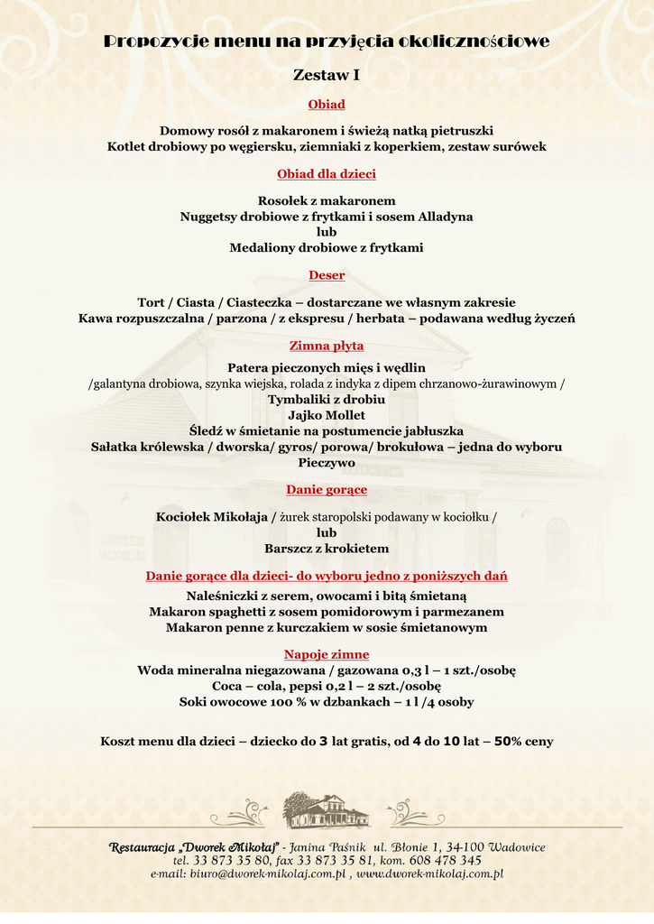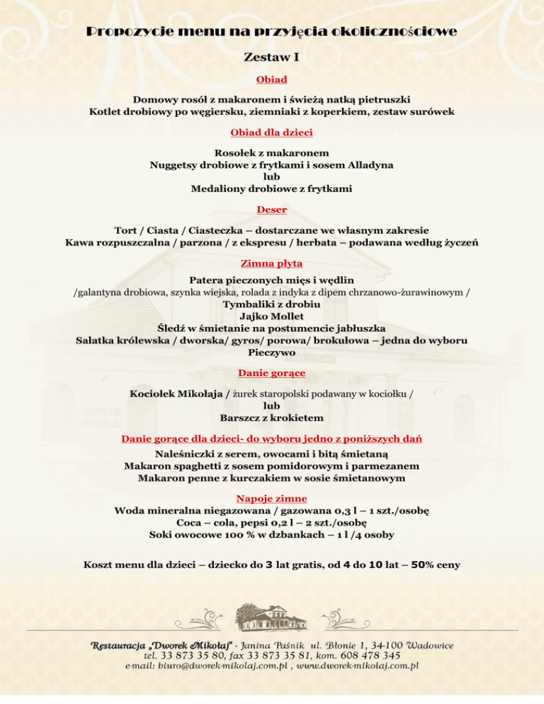 Propozycje menu na przyjęcia okolicznościowe Zestaw I Obiad Domowy rosół z makaronem i świeżą natką pietruszki Kotlet drobiowy po węgiersku, ziemniaki z koperkiem, zestaw surówek Obiad dla dzieci Rosołek z makaronem Nuggetsy drobiowe z frytkami i sosem Alladyna lub Medaliony drobiowe z frytkami Deser Tort / Ciasta / Ciasteczka – dostarczane we własnym zakresie Kawa rozpuszczalna / parzona / z ekspresu / herbata – podawana według życzeń Zimna płyta Patera pieczonych mięs i wędlin /galantyna drobiowa, szynka wiejska, rolada z indyka z dipem chrzanowo-żurawinowym / Tymbaliki z drobiu Jajko Mollet Śledź w śmietanie na postumencie jabłuszka Sałatka królewska / dworska/ gyros/ porowa/ brokułowa – jedna do wyboru Pieczywo Danie gorące Kociołek Mikołaja / żurek staropolski podawany w kociołku / lub Barszcz z krokietem Danie gorące dla dzieci- do wyboru jedno z poniższych dań Naleśniczki z serem, owocami i bitą śmietaną Makaron spaghetti z sosem pomidorowym i parmezanem Makaron penne z kurczakiem w sosie śmietanowym Napoje zimne Woda mineralna niegazowana / gazowana 0,3 l – 1 szt./osobę Coca – cola, pepsi 0,2 l – 2 szt./osobę Soki owocowe 100 % w dzbankach – 1 l /4 osoby Koszt menu dla dzieci – dziecko do 3 lat gratis, od 4 do 10 lat – 50% ceny Zestaw II Obiad Domowy rosół z makaronem i świeżą natką pietruszki Kotlet de volaille, ziemniaki z koperkiem, zestaw surówek Obiad dla dzieci Rosołek z makaronem Nuggetsy drobiowe z frytkami i sosem Alladyna lub Madaliony drobiowe z frytkami Deser Tort / Ciasta / Ciasteczka – dostarczane we własnym zakresie Kawa rozpuszczalna / parzona / z ekspresu / herbata – podawana według życzeń Zimna płyta Patera pieczonych mięs i wędlin /galantyna drobiowa, szynka wiejska, kabanos, rolada zielonym naleśnikiem, koreczki serowe, pomidorki faszerowane / Tymbaliki z drobiu / Terrina warzywna Jajko Mollet Fantazja naleśnikowa z szyneczką i serem żółtym Patera śledzików/rolmopsy śledziowe, śledź po japońsku, roladki śledziowe/ Sałatka królewska / dworska/ gyros/ porowa/ brokułowa – jedna do wyboru Pieczywo Danie gorące Bogracz wołowy lub Barszcz czerwony z pasztecikami z ciasta francuskiego i ciasta drożdżowego z farszem mięsnym /paszteciki serwowane na paterach/ Danie gorące dla dzieci- do wyboru jedno z poniższych dań Naleśniczki z serem , owocami i bitą śmietaną Makaron spaghetti z sosem pomidorowym i parmezanem Makaron penne z kurczakiem w sosie śmietanowym Napoje zimne Woda mineralna niegazowana / gazowana 0,33 l – 1 szt./osobę Coca – cola, pepsi 0,2 l – 2 szt./osobę Soki owocowe 100 % w dzbankach – 1 l /4 osoby Koszt menu dla dzieci – dziecko do 3 lat gratis, od 4 do 10 lat – 50% ceny Zestaw III Obiad Domowy rosół z makaronem i świeżą natką pietruszki Kotlet dworski nadziewany pieczarkami, serem i szynką, ziemniaki z koperkiem, zestaw surówek lub Polędwiczki wieprzowe w sosie z zielonym pieprzem, ziemniaki, zestaw surówek Lampka wina /białe, czerwone, różowe/ do obiadu – podawane według życzeń Obiad dla dzieci Rosołek z makaronem Nuggetsy drobiowe z frytkami i sosem Alladyna lub Madaliony drobiowe z frytkami Deser Tort / Ciasta / Ciasteczka – dostarczane we własnym zakresie Kawa rozpuszczalna / parzona / z ekspresu / herbata – podawana według życzeń Zimna płyta Patera pieczonych mięs i wędlin /galantyna drobiowa, szynka wiejska, kabanos, rolada z indyka z dipem chrzanowo-żurawinowym/ Tymbaliki z drobiu / Terrina warzywna / Galaretka wieprzowa Jajko Mollet / Duet szparagowy w szyneczce Roladka z tortilli z wędzonym łososiem Patera śledzików/rolmopsy śledziowe, śledź po japońsku, roladki śledziowe/ Sałatka królewska / dworska/ gyros/ porowa/ brokułowa – jedna do wyboru Pieczywo Danie gorące Schab w sosie myśliwskim, kluski śląskie, surówka z czerwonej kapusty lub Rolada drobiowa z musem szpinakowym w sosie maślano-paprykowo-cytrynowym, kopytka, surówka z kapusty pekińskiej Danie gorące dla dzieci- do wyboru jedno z poniższych dań Naleśniczki z serem , owocami i bitą śmietaną Makaron spaghetti z sosem pomidorowym i parmezanem Makaron penne z kurczakiem w sosie śmietanowym Napoje zimne Woda mineralna niegazowana / gazowana 0,33 l – 1 szt./osobę Coca – cola, pepsi 0,2 l – 2 szt./osobę Soki owocowe 100 % w dzbankach – 1 l /4 osoby Koszt menu dla dzieci – dziecko do 3 lat gratis, od 4 do 10 lat – 50% ceny Zestaw IV Obiad Aromatyczny krem borowikowy z groszkiem ptysiowym Mięsa serwowane na paterach: Kotlet de volaille z masłem ziołowo-czosnkowym / Roladka wołowa śląska Kotlet schabowy z pieczarkami panierowanymi / Przekładaniec dworski Filet z kaczki z pieczonym jabłkiem i żurawiną Dodatki: ziemniaki z koperkiem, zestaw surówek Lampka wina do obiadu /białe, czerwone, różowe/– podawane według życzeń Obiad dla dzieci Rosołek z makaronem Nuggetsy drobiowe z frytkami i sosem Alladyna lub Madaliony drobiowe z frytkami Deser Tort / Ciasta / Ciasteczka – dostarczane we własnym zakresie Kawa rozpuszczalna / parzona / z ekspresu / herbata – podawana według życzeń Zimna płyta Patera pieczonych mięs: /galantyna drobiowa, rolada z indyka w szynce parmeńskiej, rolada drobiowa z zielonym naleśnikiem/ Tymbaliki z drobiu / Terrina warzywna / Galaretka wieprzowa Ryba po grecku / Śledź w śmietanie na postumencie jabłuszka Trio smakowe: /kruche babeczki z sałatką z łososia, fantazja naleśnikowa, kruche babeczki z sałatką porową z szynką / Duet szparagowy w plastrze wędzonego łososia Sałatka królewska / dworska/ gyros/ porowa/ brokułowa – jedna do wyboru Pieczywo Danie gorące – do wyboru jedno z poniższych dań Polędwiczki wieprzowe w sosie z zielonym pieprzem, kopytka, surówka z czerwonej kapusty lub Pieczony filet z łososia z łezką sosu koperkowego, plastry ziemn., surówka z kapusty pekińskiej Danie gorące dla dzieci- do wyboru jedno z 