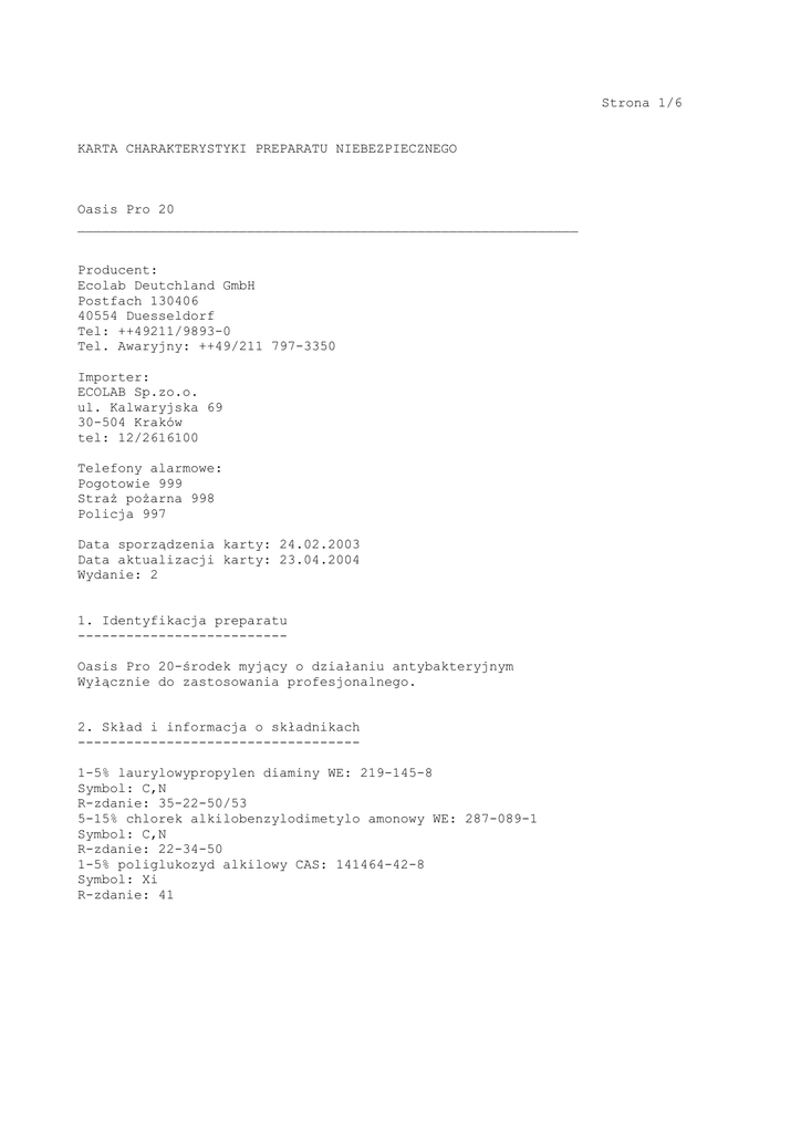 Strona 1/6 KARTA CHARAKTERYSTYKI PREPARATU NIEBEZPIECZNEGO Oasis Pro 20 ______________________________________________________________ Producent: Ecolab Deutchland GmbH Postfach 130406 40554 Duesseldorf Tel: ++49211/9893-0 Tel. Awaryjny: ++49/211 797-3350 Importer: ECOLAB Sp.zo.o. ul. Kalwaryjska 69 30-504 Kraków tel: 12/2616100 Telefony alarmowe: Pogotowie 999 Straż pożarna 998 Policja 997 Data sporządzenia karty: 24.02.2003 Data aktualizacji karty: 23.04.2004 Wydanie: 2 1. Identyfikacja preparatu -------------------------Oasis Pro 20-środek myjący o działaniu antybakteryjnym Wyłącznie do zastosowania profesjonalnego. 2. Skład i informacja o składnikach ----------------------------------1-5% laurylowypropylen diaminy WE: 219-145-8 Symbol: C,N R-zdanie: 35-22-50/53 5-15% chlorek alkilobenzylodimetylo amonowy WE: 287-089-1 Symbol: C,N R-zdanie: 22-34-50 1-5% poliglukozyd alkilowy CAS: 141464-42-8 Symbol: Xi R-zdanie: 41 Strona 2/6 KARTA CHARAKTERYSTYKI PREPARATU NIEBEZPIECZNEGO Oasis Pro 20 ______________________________________________________________ 3. Identyfikacja zagrożeń ------------------------Preparat żrący; powoduje oparzenia 4. Pierwsza pomoc ----------------W przypadku zatrucia przez wdychanie: Unikać wdychania produktu. Świeże powietrze, w razie potrzeby konsultacja lekarska W przypadku zabrudzenia skóry: Przemyć skórę pod bieżącą wodą z mydłem. Pielęgnować skórę. Zdjąć zanieczyszczone produktem ubrania. W przypadku zabrudzenia oczu: Przemyć natychmiast pod bieżącą wodą (min. 10 minut), nałożyć opatrunek ze sterylnej gazy, skontaktować się z lekarzem okulistą. W przypadku spożycia: Pić wodę (1-2 szklanek), płukać usta, zasięgnąć natychmiast porady lekarskiej. 5. Postępowanie w przypadku pożaru ---------------------------------Stosowne środki gaśnicze: Wszystkie zwykle stosowane środki gaśnicze Środki gaśnicze niewłaściwe ze względów bezpieczeństwa: nie są znane Szczególne zagrożenia poprzez sam produkt, jego produkty spalania lub powstające gazy: nie są znane przy stosowaniu zgodnym z przeznaczeniem Szczególne wyposażenie ochronne przy zwalczaniu ognia: Nosić wyposażenie ochronne. Strona 3/6 KARTA CHARAKTERYSTYKI PREPARATU NIEBEZPIECZNEGO Oasis Pro 20 ______________________________________________________________ 6. Postępowanie w przypadku niezamierzonego uwolnienia do środowiska -------------------------------------------------------------------Środki ostrożności w stosunku do osób: Unikać zanieczyszczenia oczu i skóry. Nosić wyposażenie ochronne. Zasady ochrony środowiska naturalnego: Nie dopuścić aby produkt przedostał się do kanalizacji. Sposób czyszczenia/zbierania: Niewielkie ilości produktu rozcieńczać dużą ilością wody. 7. Postępowanie z preparatem i jego magazynowanie ------------------------------------------------Postępowanie z preparatem: Unikać powstawania aerozolu/oparów produktu. Magazynowanie: Przechowywać wyłącznie w oryginalnych opakowaniach. Przechowywać w temperaturze do 25'C. 8. Kontrola narażenia i środki ochrony indywidualnej ---------------------------------------------------Informacje o budowie systemu: Brak dodatkowych wymagań, patrz pkt. Składniki z odnoszącymi się do stanowiska pracy, dopuszczalnymi wskaźnikami stężeń, które należy kontrolować: brak Środki ochrony indywidualnej: Unikać zanieczyszczenie oczu i skóry; Ochrona Ochrona Ochrona Ochrona układu oddechowego: nie jest wymagana rąk: odpowiednie rękawice ochronne oczu i twarzy: okulary ochronne w przypadku ryzyka rozpylenia skóry: odpowiedni ubiór ochronny Strona 4/6 KARTA CHARAKTERYSTYKI PREPARATU NIEBEZPIECZNEGO Oasis Pro 20 ______________________________________________________________ 9. Właściwości fizykochemiczne -----------------------------postać: zapach: pH: temperatura: wrzenia: topnienia: zapłonu: samozapłonu: zestalania: klarowania: wrażliwy na niskie temperatury: palność: właściwości wybuchowe: właściwości utleniające: prężność par: gęstość względna: rozpuszczalność: w wodzie: w rozpuszczalnikach org. (współczynnik podziału n-oktanol/woda): lepkość: fioletowy płyn przyjemnie świeży (przy 10g/l H2O) (20'C) 10,0 (koncentrat) (20'C) ok. 10,0 brak danych brak danych brak zapłonu do 100'C nie dotyczy <-5'C >1,5'C brak danych nie dotyczy brak brak brak danych (20'C) 0,997 g/cm3 (20'C) rozpuszczalny w wodzie bez ograniczeń brak danych (20'C) 47,5 mPa.s (Brookfield) 10. Stabilność i reaktywność ---------------------------Warunki, których należy unikać: Nie są znane przy stosowaniu zgodnym z przeznaczeniem Materiały, których należy unikać: Reakcji z aldehydami. Niebezpieczne produkty rozkładu: Nie są znane przy stosowaniu zgodnym z przeznaczeniem 11. Informacje toksykologiczne -----------------------------Połknięcie: produkt jest średnio toksyczny po połknięciu Kontakt oczami: ryzyko poważnego uszkodzenia oczu Kontakt ze skórą: produkt działa żrąco na skórę i błony śluzowe oczu Strona 5/6 KARTA CHARAKTERYSTYKI PREPARATU NIEBEZPIECZNEGO Oasis Pro 20 ______________________________________________________________ 12. Informacje ekologiczne -------------------------Dane dotyczące: mobilności: brak danych rozkładu: spełnia polskie wymagania dotyczące stopnia biodegradacji kumulacji: brak danych ekotoksyczności: brak danych inne szkodliwe skutki: brak danych 13. Postępowanie z odpadami --------------------------Postępowanie z odpadami musi być uzgodnione z władzami lokalnymi. Postępować z odpadami zgodnie z obowiązującymi przepisami: -USTAWA z dnia 11 maja 2001 r. o opakowaniach i odpadach opakowaniowych wraz z późniejszymi zmianami -USTAWA z dnia 11 maja 2001 r. o obowiązkach przedsiębiorców w zakresie gospodarowania niektórymi odpadami oraz o opłacie produktowej i opłacie depozytowej wraz z późniejszymi zmianami 14. Informacje o transporcie ---------------------------Transport lą