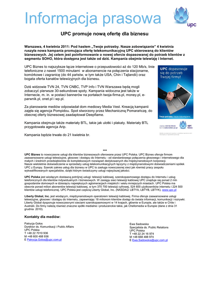 Informacja prasowa UPC promuje nową ofertę dla biznesu Warszawa, 4 kwietnia 2011: Pod hasłem „Twoje potrzeby. Nasze zobowiązanie” 4 kwietnia ruszyła nowa kampania promująca ofertę telekomunikacyjną UPC skierowaną do klientów biznesowych. Jej celem jest poinformowanie o nowej ofercie dopasowanej do potrzeb klientów z segmentu SOHO, która dostępna jest także od dziś. Kampania obejmie telewizję i Internet. UPC Biznes to najszybsze łącze internetowe o przepustowości aż do 120 Mb/s, linie telefoniczne z nawet 1500 minutami w abonamencie na połączenia stacjonarne, komórkowe i zagranicę (do 44 państw, w tym także USA, Chin i Tajlandii) oraz bogata oferta kanałów telewizyjnych dla biznesu. Dziś widzowie TVN 24, TVN CNBC, TVP Info i TVN Warszawa będą mogli zobaczyć pierwsze 30-sekundowe spoty. Kampania widoczna jest także w Internecie, m. in. w postaci bannerów na portalach twoja-firma.pl, money.pl, eparwnik.pl, onet.pl i wp.pl. Za planowanie mediów odpowiadał dom mediowy Media Vest. Kreacją kampanii zajęła się agencja Pompidou. Spot stworzony przez Mechaniczną Pomarańczę, do obecnej oferty biznesowej zaadaptował Deepflame. Kampania obejmuje także materiały BTL, takie jak ulotki i plakaty. Materiały BTL przygotowała agencja Arip. Kampania będzie trwała do 21 kwietnia br. *** UPC Biznes to nowoczesne usługi dla klientów biznesowych oferowane przez UPC Polska. UPC Biznes oferuje firmom zaawansowane usługi telewizyjne, głosowe i dostępu do Internetu - od standardowego połączenia głosowego i internetowego dla małych i średnich przedsiębiorstw do kompleksowych rozwiązań dedykowanych dla międzynarodowych korporacji. Nasze wieloletnie doświadczenie w sprzedaży usług telekomunikacyjnych łączymy z międzynarodowymi doświadczeniami spółek UPC z Europy. Szeroki zakres usług dla biznesu w UPC to zasługa nowoczesnej sieci jak również pracy zespołu wykwalifikowanych specjalistów, dzięki którym świadczymy usługi najwyższej jakości. UPC Polska jest wiodącym dostawcą potrójnej usługi: telewizji kablowej, szerokopasmowego dostępu do Internetu i usług telefonicznych dla klientów indywidualnych i biznesowych. W zasięgu sieci telewizji kablowej UPC znajduje się ponad 2 mln gospodarstw domowych w dziesięciu największych aglomeracjach miejskich i wielu mniejszych miastach. UPC Polska ma obecnie ponad milion abonentów telewizji kablowej, w tym 370 700 telewizji cyfrowej, 524 600 użytkowników internetu i 224 500 klientów usługi telefonicznej. UPC Polska jest częścią Liberty Global, Inc. (NASDAQ: LBTYA, LBTYB, LBTYK). www.upc.pl Liberty Global, Inc. jest wiodącym, międzynarodowym operatorem telewizji kablowej. Firma oferuje zaawansowane usługi telewizyjne, głosowe i dostępu do Internetu, zapewniając 18 milionom klientów dostęp do świata informacji, komunikacji i rozrywki. Liberty Global dysponuje nowoczesnymi sieciami szerokopasmowymi w 14 krajach, głównie w Europie, ale także w Chile i Australii. Do firmy należą również znaczne spółki medialne i producenckie takie, jak Chellomedia w Europie (dane z dnia 31 grudnia 2010). Kontakty dla mediów: Patrycja Gołos Dyrektor ds. Komunikacji i Public Affairs UPC Polska T +48 22 7010 936 M +48 600 488 936 E [email protected] Ewa Sadowska Specjalista ds. Public Relations UPC Polska T +48 22 24 16 974 M +48 668 488 974 E [email protected]