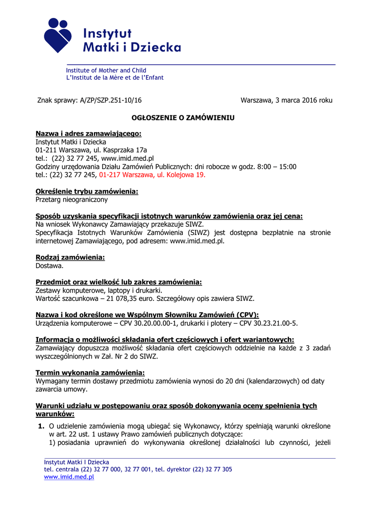 Institute of Mother and Child L’Institut de la Mère et de l’Enfant Znak sprawy: A/ZP/SZP.251-10/16 Warszawa, 3 marca 2016 roku OGŁOSZENIE O ZAMÓWIENIU Nazwa i adres zamawiającego: Instytut Matki i Dziecka 01-211 Warszawa, ul. Kasprzaka 17a tel.: (22) 32 77 245, www.imid.med.pl Godziny urzędowania Działu Zamówień Publicznych: dni robocze w godz. 8:00 – 15:00 tel.: (22) 32 77 245, 01-217 Warszawa, ul. Kolejowa 19. Określenie trybu zamówienia: Przetarg nieograniczony Sposób uzyskania specyfikacji istotnych warunków zamówienia oraz jej cena: Na wniosek Wykonawcy Zamawiający przekazuje SIWZ. Specyfikacja Istotnych Warunków Zamówienia (SIWZ) jest dostępna bezpłatnie na stronie internetowej Zamawiającego, pod adresem: www.imid.med.pl. Rodzaj zamówienia: Dostawa. Przedmiot oraz wielkość lub zakres zamówienia: Zestawy komputerowe, laptopy i drukarki. Wartość szacunkowa – 21 078,35 euro. Szczegółowy opis zawiera SIWZ. Nazwa i kod określone we Wspólnym Słowniku Zamówień (CPV): Urządzenia komputerowe – CPV 30.20.00.00-1, drukarki i plotery – CPV 30.23.21.00-5. Informacja o możliwości składania ofert częściowych i ofert wariantowych: Zamawiający dopuszcza możliwość składania ofert częściowych oddzielnie na każde z 3 zadań wyszczególnionych w Zał. Nr 2 do SIWZ. Termin wykonania zamówienia: Wymagany termin dostawy przedmiotu zamówienia wynosi do 20 dni (kalendarzowych) od daty zawarcia umowy. Warunki udziału w postępowaniu oraz sposób dokonywania oceny spełnienia tych warunków: 1. O udzielenie zamówienia mogą ubiegać się Wykonawcy, którzy spełniają warunki określone w art. 22 ust. 1 ustawy Prawo zamówień publicznych dotyczące: 1) posiadania uprawnień do wykonywania określonej działalności lub czynności, jeżeli Instytut Matki I Dziecka tel. centrala (22) 32 77 000, 32 77 001, tel. dyrektor (22) 32 77 305 www.imid.med.pl przepisy prawa nakładają obowiązek ich posiadania – Zamawiający nie opisuje i nie wyznacza szczegółowego warunku w tym zakresie; 2) posiadania wiedzy i doświadczenia – Zamawiający nie opisuje i nie wyznacza szczegółowego warunku w tym zakresie; 3) dysponowania odpowiednim potencjałem technicznym i osobami zdolnymi do wykonania zamówienia – Zamawiający nie opisuje i nie wyznacza szczegółowego warunku w tym zakresie; 4) sytuacji ekonomicznej i finansowej – Zamawiający nie opisuje i nie wyznacza szczegółowego warunku w tym zakresie. 2. Wykonawca może polegać na wiedzy i doświadczeniu, potencjale technicznym, osobach zdolnych do wykonania zamówienia, zdolnościach finansowych lub ekonomicznych innych podmiotów, niezależnie od charakteru prawnego łączących go z nimi stosunków. Wykonawca w takiej sytuacji zobowiązany jest udowodnić Zamawiającemu, iż będzie dysponował tymi zasobami w trakcie realizacji zamówienia, w szczególności przedstawiając w tym celu pisemne zobowiązanie tych podmiotów do oddania mu do dyspozycji niezbędnych zasobów na potrzeby wykonania zamówienia. Podmiot, który zobowiązał się do udostępnienia zasobów zgodnie z art. 26 ust. 2b ustawy Prawo zamówień publicznych, odpowiada solidarnie z Wykonawcą za szkodę Zamawiającego powstałą wskutek nieudostępnienia tych zasobów, chyba że za nieudostępnienie zasobów nie ponosi winy. Zamawiający dokona oceny spełnienia warunków udziału w postępowaniu wg formuły spełnia/nie spełnia na podstawie złożonych przez wykonawców oświadczeń i dokumentów. Nie spełnienie chociażby jednego z warunków określonych w rozdziale II SIWZ skutkować będzie wykluczeniem Wykonawcy z postępowania. Wykaz wymaganych oświadczeń lub dokumentów jakie mają dostarczyć wykonawcy w celu potwierdzenia spełnienia warunków udziału w postępowaniu oraz niepodlegania wykluczeniu: 1. W celu wykazania spełniania przez Wykonawcę warunków, o których mowa w art. 22 ust. 1 ustawy z dnia 29 stycznia 2004 r. Prawo zamówień publicznych (t. j. Dz. U. z 2013 r., poz. 907 z późn. zm.),Wykonawca składa wraz z ofertą oświadczenie o spełnieniu warunków udziału w postępowaniu, wg Zał. Nr 4 do SIWZ. 2. W celu wykazania, że Wykonawca nie podlega wykluczeniu z postępowania na podstawie art. 24 ustawy z dnia 29 stycznia 2004 r. Prawo zamówień publicznych (t. j. Dz. U. z 2013 r., poz. 907 z późn. zm.) Wykonawca składa wraz z ofertą następujące dokumenty: 1) oświadczenie o braku podstaw do wykluczenia z postępowania, wg Zał. Nr 4a do SIWZ; 2) aktualny odpis z właściwego rejestru lub z centralnej ewidencji i informacji o działalności gospodarczej, w celu wykazania braku podstaw do wykluczenia w oparciu o art. 24 ust. 1 pkt 2 ustawy (wystawionego nie wcześniej niż 6 miesięcy przed upływem terminu składania ofert); 3) oświadczenie w stosunku do osób fizycznych w zakresie art. 24. ust. 1 pkt 2 ustawy Prawo zamówień publicznych, wg Zał. Nr 4b do SIWZ; 4) listę podmiotów należących do tej samej grupy kapitałowej, o której mowa w art. 24 ust. 2 pkt 5 ustawy, tj. w rozumieniu ustawy z dnia 16 lutego 2007 r. o ochronie konkurencji i konsumentów (Dz. U. Nr 50, poz. 331 z późn. zm.) albo informację, o tym, że wykonawca nie należy do grupy kapitałowej, wg Zał. Nr 4 do SIWZ. 3. Jeżeli Wykonawca wykazując spełnienie warunków udziału w postępowaniu, o których mowa w art. 22 ust. 1 ustawy, polega na zasobach innych podmiotów na zasadach określonych w art. 26 ust. 2b ustawy, a podmioty te będą brały udział w realizacji części zamówienia, Zamawiający żąda od Wykonawcy, aby przedstawił w odniesieniu do tych podmiotów dokumenty wymienione w pkt 2 ppkt 1-3. 4. Podmiot zagraniczny. 1) Jeżeli Wykonawca ma siedzibę lub miejsce zamieszkania poza terytorium Rzeczypospolitej Polskiej (oprócz listy podmiotów należących do tej samej grupy kapitałowej Instytut Matki I Dziecka www.imid.med.pl 2 oraz oświadczeń wg Zał. Nr 4-4c do SIWZ), zamiast dokumentów, o kt