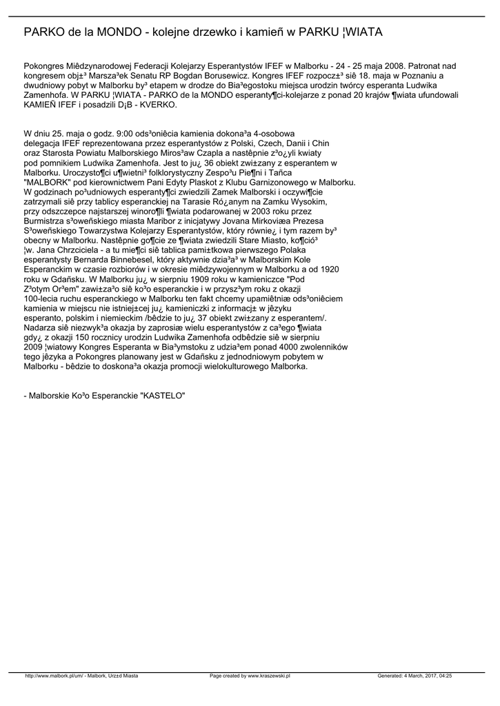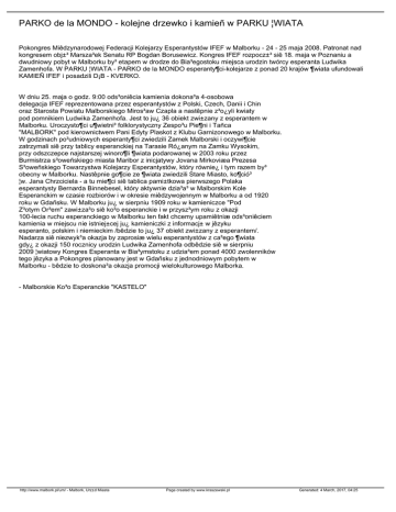 PARKO de la MONDO - kolejne drzewko i kamieñ w PARKU ¦WIATA Pokongres Miêdzynarodowej Federacji Kolejarzy Esperantystów IFEF w Malborku - 24 - 25 maja 2008. Patronat nad kongresem obj±³ Marsza³ek Senatu RP Bogdan Borusewicz. Kongres IFEF rozpocz±³ siê 18. maja w Poznaniu a dwudniowy pobyt w Malborku by³ etapem w drodze do Bia³egostoku miejsca urodzin twórcy esperanta Ludwika Zamenhofa. W PARKU ¦WIATA - PARKO de la MONDO esperanty¶ci-kolejarze z ponad 20 krajów ¶wiata ufundowali KAMIEÑ IFEF i posadzili D¡B - KVERKO. W dniu 25. maja o godz. 9:00 ods³oniêcia kamienia dokona³a 4-osobowa delegacja IFEF reprezentowana przez esperantystów z Polski, Czech, Danii i Chin oraz Starosta Powiatu Malborskiego Miros³aw Czapla a nastêpnie z³o¿yli kwiaty pod pomnikiem Ludwika Zamenhofa. Jest to ju¿ 36 obiekt zwi±zany z esperantem w Malborku. Uroczysto¶ci u¶wietni³ folklorystyczny Zespo³u Pie¶ni i Tañca "MALBORK" pod kierownictwem Pani Edyty Plaskot z Klubu Garnizonowego w Malborku. W godzinach po³udniowych esperanty¶ci zwiedzili Zamek Malborski i oczywi¶cie zatrzymali siê przy tablicy esperanckiej na Tarasie Ró¿anym na Zamku Wysokim, przy odszczepce najstarszej winoro¶li ¶wiata podarowanej w 2003 roku przez Burmistrza s³oweñskiego miasta Maribor z inicjatywy Jovana Mirkoviæa Prezesa S³oweñskiego Towarzystwa Kolejarzy Esperantystów, który równie¿ i tym razem by³ obecny w Malborku. Nastêpnie go¶cie ze ¶wiata zwiedzili Stare Miasto, ko¶ció³ ¦w. Jana Chrzciciela - a tu mie¶ci siê tablica pami±tkowa pierwszego Polaka esperantysty Bernarda Binnebesel, który aktywnie dzia³a³ w Malborskim Kole Esperanckim w czasie rozbiorów i w okresie miêdzywojennym w Malborku a od 1920 roku w Gdañsku. W Malborku ju¿ w sierpniu 1909 roku w kamieniczce "Pod Z³otym Or³em" zawi±za³o siê ko³o esperanckie i w przysz³ym roku z okazji 100-lecia ruchu esperanckiego w Malborku ten fakt chcemy upamiêtniæ ods³oniêciem kamienia w miejscu nie istniej±cej ju¿ kamieniczki z informacj± w jêzyku esperanto, polskim i niemieckim /bêdzie to ju¿ 37 obiekt zwi±zany z esperantem/. Nadarza siê niezwyk³a okazja by zaprosiæ wielu esperantystów z ca³ego ¶wiata gdy¿ z okazji 150 rocznicy urodzin Ludwika Zamenhofa odbêdzie siê w sierpniu 2009 ¦wiatowy Kongres Esperanta w Bia³ymstoku z udzia³em ponad 4000 zwolenników tego jêzyka a Pokongres planowany jest w Gdañsku z jednodniowym pobytem w Malborku - bêdzie to doskona³a okazja promocji wielokulturowego Malborka. - Malborskie Ko³o Esperanckie "KASTELO" http://www.malbork.pl/um/ - Malbork, Urz±d Miasta Page created by www.kraszewski.pl Generated: 4 March, 2017, 04:25
