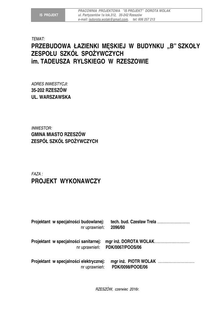 IS PROJEKT PRACOWNIA PROJEKTOWA ”IS PROJEKT” DOROTA WOLAK ul. Partyzantów 1a lok.312, 35-242 Rzeszów e-mail: [email protected], tel: 606 257 213 TEMAT: PRZEBUDOWA ŁAZIENKI MĘSKIEJ W BUDYNKU „B” SZKOŁY ZESPOŁU SZKÓŁ SPOśYWCZYCH im. TADEUSZA RYLSKIEGO W RZESZOWIE ADRES INWESTYCJI: 35-202 RZESZÓW UL. WARSZAWSKA INWESTOR: GMINA MIASTO RZESZÓW ZESPÓŁ SZKÓŁ SPOśYWCZYCH FAZA : PROJEKT WYKONAWCZY Projektant w specjalności budowlanej: nr uprawnień: tech. bud. Czesław Trela ….………………… 2096/60 Projektant w specjalności sanitarnej: mgr inŜ. DOROTA WOLAK……………………… nr uprawnień: PDK/0067/POOS/06 Projektant w specjalności elektrycznej: nr uprawnień: mgr inŜ. PIOTR WOLAK …….………………… PDK/0098/POOE/06 RZESZÓW, czerwiec 2016r. ZAWARTOŚĆ OPRACOWANIA I. CZĘŚĆ ARCHITEKTONICZNA - BUDOWLANA ......................................................................................... 4 1. Podstawa opracowania. ...................................................................................................................................... 4 2. Przeznaczenie i program funkcjonalno – uŜytkowy............................................................................................ 4 3. Konstrukcja przebudowywanego pomieszczenia................................................................................................ 4 4. Projektowane elementy budowlane .................................................................................................................... 5 II. CZĘŚĆ SANITARNA ...................................................................................................................................... 6 5. Podstawa opracowania. ...................................................................................................................................... 6 6. Przedmiot i zakres opracowania ......................................................................................................................... 6 7. Opis stanu istniejącego ....................................................................................................................................... 6 8. Dane ogólne ........................................................................................................................................................ 6 9. Instalacja wody ciepłej i zimnej.......................................................................................................................... 6 5.1. Rurociągi ........................................................................................................................................................ 6 5.2. Armatura ......................................................................................................................................................... 7 5.3. Izolacje rurociągów ........................................................................................................................................ 7 5.4. Próby szczelności i płukanie ........................................................................................................................... 7 10. Wewnętrzna kanalizacja sanitarna. ................................................................................................................... 7 7.1. Przybory sanitarne .......................................................................................................................................... 7 7.2. Piony............................................................................................................................................................... 8 7.3. Poziomy ........................................................................................................................................................... 8 11. Instalacja centralnego ogrzewania .................................................................................................................... 8 8.1. Rurociągi ........................................................................................................................................................ 8 8.2. Grzejniki ......................................................................................................................................................... 8 8.3. Armatura odcinająca , odpowietrzająca ........................................................................................................... 8 8.4. Izolacja termiczna ........................................................................................................................................... 8 8.5. Próby i regulacja instalacji ............................................................................................................................. 9 12. Wentylacja ........................................................................................................................................................ 9 III. CZĘŚĆ ELEKTRYCZNA ............................................................................................................................. 11 1. Przedmiot opracowania .................................................................................................................................... 11 2. Podstawa opracowania ..................................................................................................................................... 11 3. Zakres opracowania .......................................................................................................................................... 11 4. DemontaŜ istniejących instalacji....................................................................................................................... 11 5. Parametry elektryczne ...................................................................................................................................... 11 6. Z