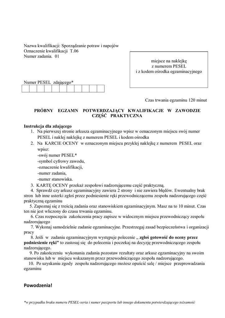 Nazwa kwalifikacji: Sporządzanie potraw i napojów Oznaczenie kwalifikacji T.06 Numer zadania. 01 miejsce na naklejkę z numerem PESEL i z kodem ośrodka egzaminacyjnego Numer PESEL zdającego* Czas trwania egzaminu 120 minut PRÓBNY EGZAMN POTWERDZAJĄCY KWALIFIKACJE W ZAWODZIE CZĘŚĆ PRAKTYCZNA Instrukcja dla zdającego 1. Na pierwszej stronie arkusza egzaminacyjnego wpisz w oznaczonym miejscu swój numer PESEL i naklej naklejkę z numerem PESEL i kodem ośrodka 2. Na KARCIE OCENY w oznaczonym miejscu przyklej naklejkę z numerem PESEL oraz wpisz: -swój numer PESEL* -symbol cyfrowy zawodu, -oznaczenie kwalifikacji, -numer zadania, -numer stanowiska. 3. KARTĘ OCENY przekaż zespołowi nadzorującemu część praktyczną. 4. Sprawdź czy arkusz egzaminacyjny zawiera 2 strony i nie zawiera błędów. Ewentualny brak stron lub inne usterki zgłoś przez podniesienie ręki przewodniczącemu zespołu nadzorującego część praktyczną egzaminu 5. Zapoznaj się z treścią zadania oraz stanowiskiem egzaminacyjnym. Masz na to 10 minut. Czas ten nie jest wliczony do czasu trwania egzaminu. 6. Czas rozpoczęcia zakończenia pracy zapisze w widocznym miejscu przewodniczący zespołu nadzorującego 7. Wykonaj samodzielnie zadanie egzaminacyjne. Przestrzegaj zasad bezpieczeństwa i organizacji pracy 8. Jeśli w zadaniu egzaminacyjnym występuje polecenie „ zgłoś gotowość do oceny przez podniesienie ręki” to zastosuj się do polecenia i poczekaj na decyzję przewodniczącego zespołu nadzorującego. 9. Po zakończeniu wykonania zadania pozostaw rezultaty oraz arkusz egzaminacyjny na swoim stanowisku lub w miejscu wskazanym przez przewodniczącego zespołu nadzorującego. 10. Po uzyskaniu zgody zespołu nadzorującego możesz opuścić salę / miejsce przeprowadzania egzaminu Powodzenia! *w przypadku braku numeru PESEL-seria i numer paszportu lub innego dokumentu potwierdzającego tożsamość Zadanie Wykonaj zgodnie z recepturą dwa zestawy potraw składające się z klusek półfrancuskich z sosem pieczarkowym; surówki z pomidorów, papryki i kiszonego ogórka. Surowce do wykonania zadania masz już odważone i przygotowane na stanowisku. Jaja zostały zdezynfekowane. Sporządź potrawy według podanego sposobu wykonania. Dobierz do potraw zastawę stołową, wyporcjuj potrawy i podaj wyznaczonym miejscu. Podaj do potraw sztućce. Pamiętaj o odpowiedniej wielkości porcji, temperaturze i sposobie podania potraw UWAGA! Zgłoś Przewodniczącemu ZNCP poprzez podniesienie reki gotowość do ekspedycji potraw. Zadanie wykonaj zgodnie z zasadami bezpieczeństwa i higieny pracy, przepisami przeciwpożarowymi i ochrony środowiska. Czas trwania zadania 120min. Normatyw surowcowy Sposób wykonania Kluski półfrancuskie z sosem pieczarkowym kluski półfrancuskie - na 2 porcje mąka pszenna 180 g jaja (60g)1 szt. woda masło/margaryna 100-120 ml 30 g sól sos pieczarkowy na 2 porcje włoszczyzna 80g pieczarki 80g woda ok. 400ml 200 cm3 cebula 20 g olej 30+20 g mąka pszenna 20 g śmietana 40g sól, pieprz do smaku 1. Przeprowadzić obróbkę wstępną surowców. 2. Utrzeć masło na puszystą masę dodając jajko. 3. Dodać pozostałe składniki i wyrobić ciasto. 4. Formować metalową łyżką małe kluski i kłaść na wrzącą osoloną wodę. 5 Ugotować. 6. Gotowe kluski przelać gorącą wodą. 7. Wyporcjować na dwie równe części i polać sosem. 1. Przeprowadzić obróbkę wstępną surowców. 2. Ugotować wywar jarski. 3. Podsmażyć cebulę i pieczarki i połączyć z przecedzonym wywarem 4. Sporządzić zasmażkę II stopnia. 5. Rozprowadzić zasmażkę wywarem i zagotować. podprawić śmietaną, przyprawić do smaku. 6. Podzielić sos na połowę, polać wyporcjowane kluski Surówka z pomidora, papryki i kiszonego ogórka – 2 porcje 1.Przeprowadzić obróbkę wstępną surowców pomidor 100 g 2. Pomidor pokroić w małe cząstki, paprykę w papryka 50g cienkie paski, ogórka w plasterki, cebulę w kostkę. ogórek kiszony 50 g 3. Wymieszać składniki zaprawy i polać surówkę. cebula 30 g 4. Podzielić surówkę na połowę. olej 50 g 5. Wyporcjować, posypać posiekanym szczypiorek 1/4 pęczka szczypiorkiem. sól, cukier, sok z do smaku cytryny Porcja surówki powinna ważyć 100g. Ocenie podlegać będą 4 rezultaty: kluski półfrancuskie – rezultat 1 sos pieczarkowy– rezultat 2 Surówka z pomidora, papryki i kiszonego ogórka – rezultat 3. Dobrana zastawa stołowa, sposób wyporcjowania i ekspedycji potraw – rezultat 4 oraz przebieg procesu produkcji potraw zgodnie technikami wykonania przebieg procesu produkcji potraw zgodnie z zasadami GHP, BHP ARKUSZ OCENIANIA TESTU PRAKTYCZNEGO L.p. 1. 1.1 1.2 1.3 2. 2.1 2.2 2.3 3. 3.1 3.2 3.3 3.4 3.5 Nr zdającego Spełnione kryterium 1 2 3 4 5 Elementy podlegające ocenie / kryteria oceny Rezultat 1. Kluski półfrancuskie 15 Kluski są kształtne i zbliżone pod względem wielkości. Kluski są porowate na przekroju, szkliste, miękkie, nie surowe i nie rozgotowane. Smak klusek – nie za słone, delikatne w smaku 5 5 5 Rezultat 2. Sos pieczarkowy 15 Konsystencja sosu jest zawiesista, nie za gęsta i nie za rzadka Sos jest jednolity, bez grudek z plasterkami pieczarek Sos nie jest za słony, nie za pikantny, bez posmaku przypalenia. Rezultat 3. Surówka z pomidora, papryki i kiszonego ogórka 20 Surówka ma jędrne składniki, nie podpływa nadmiarem soku Surówka ma winny smak, nie jest za słona, nie za słodka i nie za kwaśna Pomidory, papryka nie są pokrojone w zbyt duże kawałki Składniki surówki mają t ak rozdrobnione cząstki, że nie przeszkadzają w jedzeniu Surówka jest posypana posiekanym szczypiorkiem Rezultat 4. Dobrana zastawa stołowa i sposób podania klusek z sosem 4. grzybowym i surówki z pomidora, papryki i kiszonego ogórka 16 4.1 Kluski półfrancuskie z sosem pieczarkowym są podane na dużym talerzu do dania 4.2 4.3 4.4 4.5 4.6 4.7 5 zasadniczego Surówka jest podana na osobnym talerzyku 