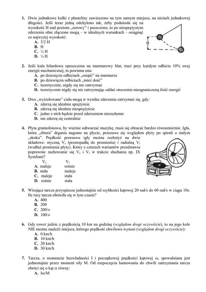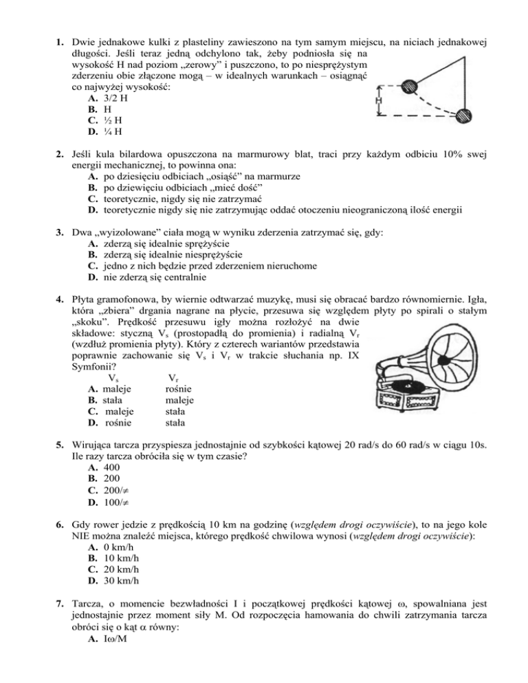 1. Dwie jednakowe kulki z plasteliny zawieszono na tym samym miejscu, na niciach jednakowej długości. Jeśli teraz jedną odchylono tak, ż eby podniosła się na wysokość H nad poziom „zerowy” i puszczono, to po niesprę ż ystym zderzeniu obie złą czone mogą – w idealnych warunkach – osią gną ć co najwyż ej wysokość : A. 3/2 H B. H C. ½ H D. ¼ H 2. Jeśli kula bilardowa opuszczona na marmurowy blat, traci przy każ dym odbiciu 10% swej energii mechanicznej, to powinna ona: A. po dziesię ciu odbiciach „osią ść ” na marmurze B. po dziewię ciu odbiciach „mieć dość ” C. teoretycznie, nigdy się nie zatrzymać D. teoretycznie nigdy się nie zatrzymują c oddać otoczeniu nieograniczoną ilość energii 3. Dwa „wyizolowane” ciała mogą w wyniku zderzenia zatrzymać się , gdy: A. zderzą się idealnie sprę ż yście B. zderzą się idealnie niesprę ż yście C. jedno z nich bę dzie przed zderzeniem nieruchome D. nie zderzą się centralnie 4. Płyta gramofonowa, by wiernie odtwarzać muzykę , musi się obracać bardzo równomiernie. Igła, która „zbiera” drgania nagrane na płycie, przesuwa się wzglę dem płyty po spirali o stałym „skoku”. Prę dkość przesuwu igły moż na rozłoż yć na dwie składowe: styczną Vs (prostopadłą do promienia) i radialną Vr (wzdłuż promienia płyty). Który z czterech wariantów przedstawia poprawnie zachowanie się Vs i Vr w trakcie słuchania np. IX Symfonii? Vr Vs A. maleje rośnie B. stała maleje C. maleje stała D. rośnie stała 5. Wirują ca tarcza przyspiesza jednostajnie od szybkości ką towej 20 rad/s do 60 rad/s w cią gu 10s. Ile razy tarcza obróciła się w tym czasie? A. 400 B. 200 C. 200/π D. 100/π 6. Gdy rower jedzie z prę dkością 10 km na godzinę (względem drogi oczywiś cie), to na jego kole NIE moż na znaleź ć miejsca, którego prę dkość chwilowa wynosi (względem drogi oczywiś cie): A. 0 km/h B. 10 km/h C. 20 km/h D. 30 km/h 7. Tarcza, o momencie bezwładności I i począ tkowej prę dkości ką towej ω, spowalniana jest jednostajnie przez moment siły M. Od rozpoczę cia hamowania do chwili zatrzymania tarcza obróci się o ką t α równy: A. Iω/M B. Iω2/2M C. 3Iω2/2M D. Iω2/M 8. Kostka lodu ześlizguje się bez tarcia wewną trz miski o kształcie czaszy. Zanim kostka osią gnie dno miski, jej prę dkość i przyspieszenie spełnią warunek: prę dkość przyspieszenie A. rośnie rośnie maleje B. rośnie C. maleje rośnie D. maleje maleje 9. Obróć my teraz miskę do góry dnem i pozwólmy np. stalowej kulce toczyć się ze szczytu bez popychania. Który z wymienionych przypadków zaobserwujemy? A. Kulka zjedzie aż do powierzchni stołu nie tracą c kontaktu z miską B. Kulka oderwie się od miski zanim przebę dzie połowę drogi (P) C. Kulka oderwie się od miski po minię ciu „półmetka” D. B lub C w zależ ności od promienia krzywizny miski 10. Przed szczytem wypukłego mostu o kształcie wycinka koła przezorna „drogówka” ustawiła znak drogowy, ograniczają cy szybkość do 60 km/h. Policzyła bowiem, ż e samochód mają c taką szybkość w szczytowym punkcie mostu straciłby kontakt z powierzchnią jezdni. Jeśli nawet rachunek był poprawny to: A. należ ałoby uwzglę dnić cię ż ar samochodu B. szybkości 60 km/h nie moż na by osią gną ć , gdyż już wcześniej samochód straciłby kontakt z jezdnią C. bez wzglę du na prę dkość samochód moż e oderwać się od jezdni dopiero po przejechaniu szczytowego punktu D. miałoby to sens tylko na moście jednokierunkowym (Wschód-Zachód) 11. Na koń cu cienkiego prę ta umieszczono kulę ołowianą . Drugi koniec przytwierdzono do osi (O) tak, aby prę t z kula mógł obracać się w płaszczyź nie pionowej. Kulę uniesiono prawie nad oś obrotu i zwolniono. W chwili przejścia przez punkt P wypadkowe przyspieszenie kuli bę dzie: A. równe przyspieszeniu ziemskiemu (g) B. skierowane ukosem w prawo w dół C. skierowane wzdłuż prę ta ku osi obrotu D. skierowane wzdłuż prę ta od osi obrotu 12. Jeśli zrobimy kółko z drutu, to jego najwię kszy moment bezwładności wzglę dem osi przechodzą cej przez środek masy wynosi I. W przypadku uż ycia tylko połowy długości drutu, otrzymamy kółko, którego najwię kszy moment bezwładności bę dzie wynosił: A. I/16 B. I/8 C. I/4 D. I/2 13. Trzy rą czki trzymają trzy obiekty na jednakowej wysokości: Raczka S trzyma nieco od ściany odchyloną deseczkę do której przywią zano cegłę ; Rą czka P – trzyma tak samo odchyloną deseczkę ale bez cegły; Rą czka R – trzyma samą cegłę . Trzy rą czki na komendę : raz, dwa i ostatnie trzy, puszczają to co trzymały. W jakiej z podanych niż ej kolejności opuszczone obiekty uderzą w podłogę ? A. Wszystkie uderzą razem B. Najpierw cegła, potem obie deski razem C. Pierwsza uderzy cegła ( R), potem deseczka (P), a na koń cu deska z cegłą (S) D. Obiekty spadną w kolejności alfabetycznej (P, R, S) 14. Kiedy Fizek zobaczył „pę tlę śmierci” pomyślał „ryzyk – Fizek” i chciał sprawdzić na własnej skórze, z jakiej co najmniej wysokości H należ y zaczą ć zjeż dż ać , by bezpiecznie przejechać na deskorolce najwyż szy punkt pę tli o promieniu R. W szpitalu policzył, ż e bez tarcia ta minimalna wysokość musi wynosić : A. 5 R B. 3 R C. 2,5 R D. 2 R A z tarciem oczywiś cie więcej. 15. Wróć my do pę tli. Jeśli udało się Fizkowi przejść przez najwyż szy punkt pę tli, to jego cię ż ar (nacisk na szynę ) w najniż szym punkcie pę tli musiał być co najmniej: A. 6 x wię kszy niż zwykle B. 2 x wię kszy niż zwykle C. taki sam jakby Fizek się nie poruszał D. 9,81 N 16. Nastę pną próbę uparty Fizek przeszedł bez trudności. Który z czterech rysunków najlepiej przedstawia cyrkowca w „szczytowej” pozycji? 17. Zasada zachowania momentu pę du ma wyraź ne zastosowanie w wielu sytuacjach. W jednej z podan