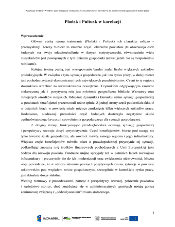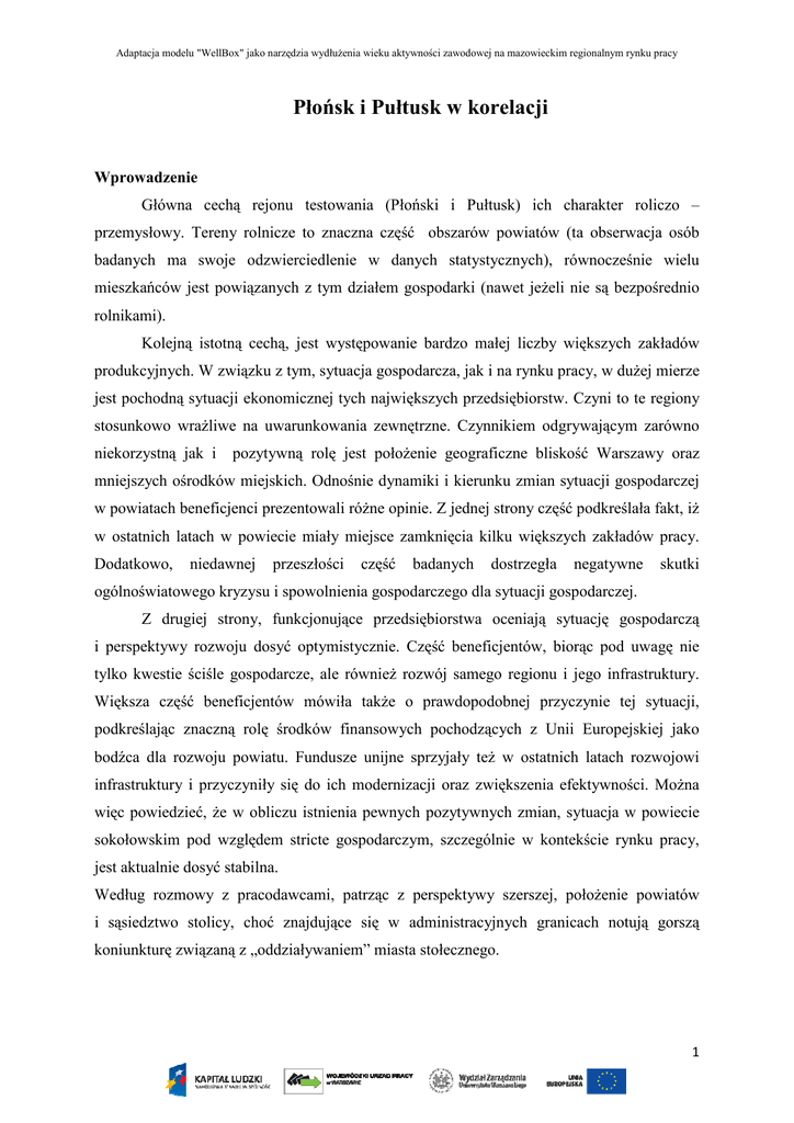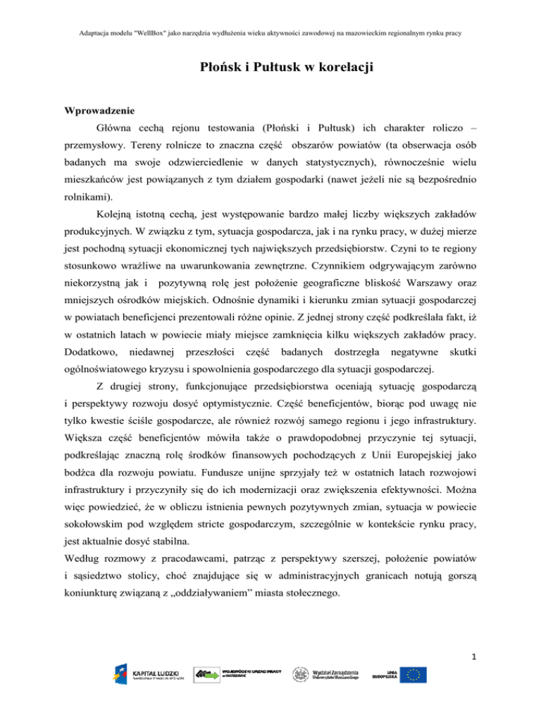 Adaptacja modelu "WellBox" jako narzędzia wydłużenia wieku aktywności zawodowej na mazowieckim regionalnym rynku pracy Płońsk i Pułtusk w korelacji Wprowadzenie Główna cechą rejonu testowania (Płoński i Pułtusk) ich charakter roliczo – przemysłowy. Tereny rolnicze to znaczna część obszarów powiatów (ta obserwacja osób badanych ma swoje odzwierciedlenie w danych statystycznych), równocześnie wielu mieszkańców jest powiązanych z tym działem gospodarki (nawet jeżeli nie są bezpośrednio rolnikami). Kolejną istotną cechą, jest występowanie bardzo małej liczby większych zakładów produkcyjnych. W związku z tym, sytuacja gospodarcza, jak i na rynku pracy, w dużej mierze jest pochodną sytuacji ekonomicznej tych największych przedsiębiorstw. Czyni to te regiony stosunkowo wrażliwe na uwarunkowania zewnętrzne. Czynnikiem odgrywającym zarówno niekorzystną jak i pozytywną rolę jest położenie geograficzne bliskość Warszawy oraz mniejszych ośrodków miejskich. Odnośnie dynamiki i kierunku zmian sytuacji gospodarczej w powiatach beneficjenci prezentowali różne opinie. Z jednej strony część podkreślała fakt, iż w ostatnich latach w powiecie miały miejsce zamknięcia kilku większych zakładów pracy. Dodatkowo, niedawnej przeszłości część badanych dostrzegła negatywne skutki ogólnoświatowego kryzysu i spowolnienia gospodarczego dla sytuacji gospodarczej. Z drugiej strony, funkcjonujące przedsiębiorstwa oceniają sytuację gospodarczą i perspektywy rozwoju dosyć optymistycznie. Część beneficjentów, biorąc pod uwagę nie tylko kwestie ściśle gospodarcze, ale również rozwój samego regionu i jego infrastruktury. Większa część beneficjentów mówiła także o prawdopodobnej przyczynie tej sytuacji, podkreślając znaczną rolę środków finansowych pochodzących z Unii Europejskiej jako bodźca dla rozwoju powiatu. Fundusze unijne sprzyjały też w ostatnich latach rozwojowi infrastruktury i przyczyniły się do ich modernizacji oraz zwiększenia efektywności. Można więc powiedzieć, że w obliczu istnienia pewnych pozytywnych zmian, sytuacja w powiecie sokołowskim pod względem stricte gospodarczym, szczególnie w kontekście rynku pracy, jest aktualnie dosyć stabilna. Według rozmowy z pracodawcami, patrząc z perspektywy szerszej, położenie powiatów i sąsiedztwo stolicy, choć znajdujące się w administracyjnych granicach notują gorszą koniunkturę związaną z „oddziaływaniem” miasta stołecznego. 1 Adaptacja modelu "WellBox" jako narzędzia wydłużenia wieku aktywności zawodowej na mazowieckim regionalnym rynku pracy Według przedstawicieli PUP stan gospodarki w omawianych powiatach, można określić jako stabilny gospodarczo i społecznie. Obszary testowania charakteryzują się znacznym stopniem podobieństwa a podstawę rozwoju stanowi sektor MSP, który generuje znaczącą liczbę miejsc pracy. W tym sensie, sytuacja ta jest podobna jak na terenach położonych w pobliżu Warszawy. Szanse rozwoju Beneficjenci jak i przedstawiciele służb zatrudnienia upatrują szanse rozwoju w przyciągnięciu kolejnych inwestycji i rozbudowie firm obecnie już funkcjonujących. Widoczny jest też tręd na rozwój kapitału ludzkiego pod względem jego aktywności gospodarczej, kreatywności i innowacyjności, głównie młodych, jeżeli będzie kierunkowana np. na zakładanie nowych firm i rozwój lokalnej przedsiębiorczości, może silnie przyczynić się do rozwoju regionów. Zagrożenia Wśród zagrożeń, jakie można zaobserwować dla rozwoju testowanych regionów wskazano na dosyć silne uzależnienie kondycji gospodarczej powiatu od kilku zakładów produkcyjnych, co w sytuacji pogorszenia koniunktury, np. w branży spożywczej i przetwórczej mogłoby się odbić bardzo niekorzystnie na sytuacji gospodarczej całego powiatu i na jego rynku pracy. Spośród innych zagrożeń warto zwrócić uwagę na fakt, że ograniczenie środków w ramach funduszy unijnych może też niekorzystnie wpłynąć na perspektywy rozwojowe, gdyż to one kreują stosunkowo stabilną sytuację gospodarczą. Branże Zgodnie z opisaną wcześniej diagnozą znaczną część działalności gospodarczej tworzy sektor rolny oraz MSP. Opierając się na wypowiedziach można powiedzieć, że sektory te nie są bardzo nowoczesne ale rozwijające się. Stabilna sytuacja tych branż (a przynajmniej jej części) jest w pewnym zakresie spowodowana akcesją Polski do Unii Europejskiej i koniecznością dostosowania się do unijnych wymagań i standardów w zakresie wielkości, specjalizacji i rentowności gospodarstw rolnych. Młodzi ludzie zakładają własną działalność gospodarczą, korzystają z unijnych dotacji i w ten sposób stają się przedsiębiorcami i pracodawcami. Należy przy tym jednak pamiętać, że w przypadku terenów wiejskich 2 Adaptacja modelu "WellBox" jako narzędzia wydłużenia wieku aktywności zawodowej na mazowieckim regionalnym rynku pracy i rolniczych mamy też do czynienia z gospodarstwami nierentownymi, a co za tym idzie, z nasileniem zjawiska biedy i innych problemów społecznych. Lokalny rynek pracy Opierając się na zebranych informacjach , liczba chętnych do pracy przewyższa aktualnie zapotrzebowanie ze strony pracodawców – podaż jest większa od popytu. W przypadku popytu na pracę zjawiskiem zachodzącym jest sezonowa zmienność zapotrzebowania na pracowników w rytmie rocznym. Tendencja ta, znajduje swe odzwierciedlenie nie tylko w danych statystycznych respondentów. Zjawisko sezonowości jest o tyle istotne i silne, że dotyczy wielu branż (usługowych) od rolnictwa przez przemysł budowlany i sektor MSP. W szczytowym monecie sezonowego wzrostu popytu na pracę, kiedy kumulują się tendencje z tak wielu branż, w opinii części badanych można mówić o względnym nasyceniu rynku pracy – większość osób realnie chcących pracować jest w stanie znaleźć pracę. Sytuac