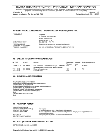 KARTA CHARAKTERYSTYKI PREPARATU NIEBEZPIECZNEGO (podstawa: Rozporządzenie Ministra Zdrowia z dnia 3 lipca 2002 r. W sprawie karty charakterystyki substancji niebezpiecznej i preparatu niebezpiecznego (Dz.U. 2002 Nr 140, poz. 1171 ze zmianami Dz.U. 2005 Nr 2, poz.8)) Wydanie: III Nazwa produktu: śel do wc WC PIK Strona 1 z 5 Data aktualizacji: 06.11.2008 01– IDENTYFIKACJA PREPARATU I IDENTYFIKACJA PRZEDSIĘBIORSTWA PRODUCENT Enigma S.J. ul. Królowej Marysieńki 44 96-316 Międzyborów tel/fax 046 855 37 76 śEL DO WC - WC PIK NAZWA PRODUKTU PRZEZNACZENIE ZALECANE STOSOWANIE TELEFON ALARMOWY Stosować do czyszczenia urządzeń sanitarnych. 998 LUB NAJBLIśSZA TERENOWA JEDNOSTKA PSP 02 – SKŁAD I INFORMACJA O SKŁADNIKACH Nr CAS 3088-31-1 7664-38-2 7647-14-5 Nr WE 221-416-0 231-633-2 - Nazwa Zawartość Klasyfik Rodzaj zagroŜenia [% mas.] acja Sól sodowa siarczanowanego adduktu <5% Xi R 36/38 tlenku etylenu do alkoholu tłuszczowego Kwas ortofosforowy <5% C R 34 Chlorek sodu <5% - 03 – IDENTYFIKACJA ZAGROśEŃ NAJWAśNIEJSZE ZAGROśENIA Preparat nie jest klasyfikowany jako niebezpieczny . ZAGROśENIA DLA ZDROWIA W bezpośrednim kontakcie moŜe działać draŜniąco na oczy ZAGROśENIA DLA ŚRODOWISKA Preparat stanowi zagroŜenia dla środowiska ZAGROśENIA FIZYCZNE I CHEMICZNE Brak ZAGROśENIA SPECYFICZNE Brak 04 – PIERWSZA POMOC WSKAZÓWKI OGÓLNE KONTAKT PRZEZ INHALACJĘ KONTAKT ZE SKÓRA KONTAKT Z OCZAMI POŁKNIĘCIE OCHRONA RATOWNIKÓW Nie dotyczy W razie kontaktu ze skórą płukać duŜą ilością wody. Płukać natychmiast obficie i starannie wodą. W razie utrzymywania się podraŜnienia konsultować z okulistą. Nie wywoływać wymiotów. Konsultować z lekarzem. 05 – POSTĘPOWANIE W PRZYPADKU POśARU ODPOWIEDNIE ŚRODKI GAŚNICZE - Enigma S.J. ul. Królowej Marysieńki 44, 96-316 Międzyborów KARTA CHARAKTERYSTYKI PREPARATU (podstawa: Rozporządzenie Ministra Zdrowia z dnia 3 lipca 2002 r. W sprawie karty charakterystyki substancji niebezpiecznej i preparatu niebezpiecznego (Dz.U. 2002 Nr 140, poz. 1171 ze zmianami Dz.U. 2005 Nr 2, poz.8)) Wydanie: III Nazwa produktu: śel do wc WC PIK NIEODPOWIEDNIE ŚRODKI GAŚNICZE ZAGROśENIA SPECYFICZNE METODY SPECYFICZNE SPRZĘT OCHRONNY STRAZAKÓW Strona 2 z 5 Data aktualizacji: 06.11.2008 Nie dotyczy – Preparat nie jest substancją palną Nie dotyczy Nie dotyczy 06 – POSTĘPOWANIE W PRZYPADKU NIEZAMIERZONEGO UWOLNIENIA DO ŚRODOWISKA OCHRONA OSOBISTA Zminimalizować moŜliwość kontaktu preparatu ze skórą i oczami. Stosować rękawice ochronne i okulary w szczelnej obudowie OCHRONA ŚRODOWISKA W przypadku wydostania się duŜych ilości preparatu do środowiska osoby przebywające w obrębie skaŜenia naleŜy ewakuować. Unikać przedostania się produktu do gleby, kanalizacji, wód gruntowych i powierzchniowych poprzez zastosowanie odpowiednich barier. W przypadku zanieczyszczenia środowiska powiadomić kompetentne władze. METODY OCZYSZCZANIA Odzyskiwanie Neutralizacja Produkt umieścić w oznakowanym pojemniku . Rozpuścić w duŜej ilości wody 07 – POSTĘPOWANIE Z SUBSTANCJĄ I JEJ MAGAZYNOWANIE OBCHODZENIE SIĘ Z PRODUKTEM Środki techniczne/Środki ostroŜności Zalecenia bezpieczeństwa MAGAZYNOWANIE Środki techniczne/ składowanie Produkty niekompatybilne MATERIAŁY NA OPAKOWANIA Zalecane Niezalecane Sposób przechowywania i obsługi stosowny dla środków myjących Przechowywać pojemniki szczelnie zamknięte w temperaturze od 50C do 400C Chronić przed dziećmi Produkt ma odczyn kwaśny i naleŜy go przechowywać z dala od produktów zasadowych 08 – KONTROLA NARAśENIA I ŚRODKI OCHRONY INDYWIDUALNEJ ZABEZPIECZENIA OGÓLNE POZIOMY NARAśENIA Wartości graniczne naraŜenia INDYWIDUALNE WYPOSAśENIE OCHRONNE Brak Brak - Enigma S.J. ul. Królowej Marysieńki 44, 96-316 Międzyborów KARTA CHARAKTERYSTYKI PREPARATU (podstawa: Rozporządzenie Ministra Zdrowia z dnia 3 lipca 2002 r. W sprawie karty charakterystyki substancji niebezpiecznej i preparatu niebezpiecznego (Dz.U. 2002 Nr 140, poz. 1171 ze zmianami Dz.U. 2005 Nr 2, poz.8)) Wydanie: III Nazwa produktu: śel do wc WC PIK Ochrona układu oddechowego (EN 143, 141) Ochrona rąk (EN 374) 1 – 4 godziny Ochrona oczu i twarzy (EN 166) Ochrona skóry i ciała (EN 467) Specyficzne zasady higieny Informacje dla pracodawców Strona 3 z 5 Data aktualizacji: 06.11.2008 Nie jest wymagana przy normalnym stosowaniu zgodnie z przeznaczeniem Stosować rękawice ochronne Stosować okulary ochronne Stosować ubranie robocze Unikać zanieczyszczenia skóry i oczu Zalecenie dotyczące procedury monitoringu zawartości składników niebezpiecznych w powietrzu – metodyka pomiarów: − Rozporządzenie Ministra Zdrowia i Opieki Społecznej z dnia 9 lipca 1996r. W sprawie badań i pomiarów czynników szkodliwych dla zdrowia w środowisku pracy (Dz.U. Nr 86/1996, poz. 394, ze zmianami Dz.U. Nr 21/2003, poz.180) − PN-89/Z-01001/06. Ochrona czystości powietrza. Nazwy, określenia i jednostki. Terminologia dotycząca badań jakości powietrza na stanowiskach pracy − PN Z-04008-7:2002. Ochrona czystości powietrza. Pobieranie próbek. Zasady pobierania próbek powietrza w środowisku pracy i interpretacja wyników. − PN-EN-689:2002 Powietrze na stanowiskach pracy- wytyczne oceny naraŜenia inhalacyjnego na czynniki chemiczne przez porównanie z wartościami dopuszczalnymi i strategia pomiarowa. Uwaga: Gdy stęŜenie substancji jest ustalone i znane, doboru środków ochrony indywidualnej naleŜy dokonywać z uwzględnieniem stęŜenia substancji występującego na danym stanowisku pracy, czasu ekspozycji oraz czynności wykonywanych przez pracownika. W sytuacji awaryjnej, jeŜeli stęŜenie substancji na stanowisku pracy nie jest znane, stosować środki ochrony indywidualnej o najwyŜszej zalecanej klasie ochrony. Pracodawca jest obowiązany zapewnić, aby środki ochrony indywidualnej oraz odzieŜ i obuwie robocze posiadały właściwości ochronne i uŜytkowe ora