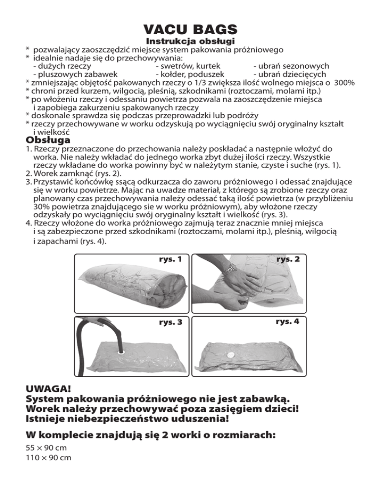VACU BAGS Instrukcja obsługi * pozwalający zaoszczędzić miejsce system pakowania próżniowego * idealnie nadaje się do przechowywania: - dużych rzeczy - swetrów, kurtek - ubrań sezonowych - pluszowych zabawek - kołder, poduszek - ubrań dziecięcych * zmniejszając objętość pakowanych rzeczy o 1/3 zwiększa ilość wolnego miejsca o 300% * chroni przed kurzem, wilgocią, pleśnią, szkodnikami (roztoczami, molami itp.) * po włożeniu rzeczy i odessaniu powietrza pozwala na zaoszczędzenie miejsca i zapobiega zakurzeniu spakowanych rzeczy * doskonale sprawdza się podczas przeprowadzki lub podróży * rzeczy przechowywane w worku odzyskują po wyciągnięciu swój oryginalny kształt i wielkość Obsługa 1. Rzeczy przeznaczone do przechowania należy poskładać a następnie włożyć do worka. Nie należy wkładać do jednego worka zbyt dużej ilości rzeczy. Wszystkie rzeczy wkładane do worka powinny być w należytym stanie, czyste i suche (rys. 1). 2. Worek zamknąć (rys. 2). 3. Przystawić końcówkę ssącą odkurzacza do zaworu próżniowego i odessać znajdujące się w worku powietrze. Mając na uwadze materiał, z którego są zrobione rzeczy oraz planowany czas przechowywania należy odessać taką ilość powietrza (w przybliżeniu 30% powietrza znajdującego sie w worku próżniowym), aby włożone rzeczy odzyskały po wyciągnięciu swój oryginalny kształt i wielkość (rys. 3). 4. Rzeczy włożone do worka próżniowego zajmują teraz znacznie mniej miejsca i są zabezpieczone przed szkodnikami (roztoczami, molami itp.), pleśnią, wilgocią i zapachami (rys. 4). rys. 1 rys. 2 rys. 3 rys. 4 UWAGA! System pakowania próżniowego nie jest zabawką. Worek należy przechowywać poza zasięgiem dzieci! Istnieje niebezpieczeństwo uduszenia! W komplecie znajdują się 2 worki o rozmiarach: 55 × 90 cm 110 × 90 cm
