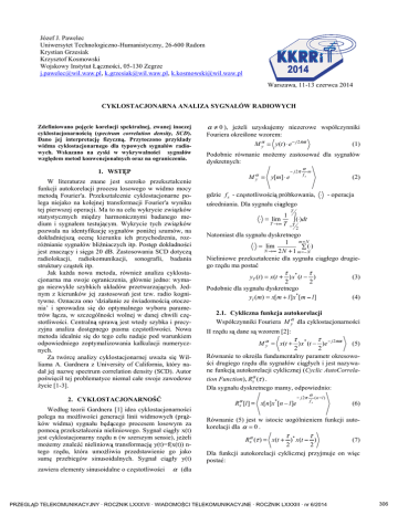 Józef J. Pawelec Uniwersytet Technologiczno-Humanistyczny, 26-600 Radom Krystian Grzesiak Krzysztof Kosmowski Wojskowy Instytut Ł czno ci, 05-130 Zegrze [email protected], [email protected], [email protected] Warszawa, 11-13 czerwca 2014 CYKLOSTACJONARNA ANALIZA SYGNAŁÓW RADIOWYCH Zdefiniowano poj cie korelacji spektralnej, zwanej inaczej cyklostacjonarno ci (spectrum correlation density, SCD). Dano jej interpretacj fizyczn . Przytoczono przykłady widma cyklostacjonarnego dla typowych sygnałów radiowych. Wskazano na zyski w wykrywalno ci sygnałów wzgl dem metod konwencjonalnych oraz na ograniczenia. 0 ), je eli uzyskujemy niezerowe współczynniki Fouriera okre lone wzorem: My j2 y (t ) e j2 2. CYKLOSTACJONARNO Według teorii Gardnera [1] idea cyklostacjonarno ci polega na mo liwo ci generacji linii widmowych (pr ków widma) sygnału b d cego procesem losowym za pomoc przekształcenia nieliniowego. Sygnał ci gły x(t) jest cyklostacjonarny rz du n (w szerszym sensie), je eli mo emy znale nieliniow transformacj y(t)=f(x(t)) ntego rz du, która umo liwia przedstawienie go jako sum przebiegów sinusoidalnych. Sygnał ci gły y(t) zawiera elementy sinusoidalne o cz stotliwo ci (1) Podobnie równanie mo emy zastosowa dla sygnałów dyskretnych: 1. WST P W literaturze znane jest szeroko przekształcenie funkcji autokorelacji procesu losowego w widmo mocy metod Fourier'a. Przekształcenie cyklostacjonarne polega niejako na kolejnej transformacji Fourier'a wyniku tej pierwszej operacji. Ma to na celu wykrycie zwi zków statystycznych mi dzy harmonicznymi badanego medium i sygnałem testuj cym. Wykrycie tych zwi zków pozwala na identyfikacj sygnałów poni ej szumów, na dokładniejsz ocen kierunku ich przychodzenia, rozró nianie sygnałów bli niaczych itp. Post p dokładno ci jest znacz cy i si ga 20 dB. Zastosowania SCD dotycz radiolokacji, radiokomunikacji, sonografii, badania struktury cz stek itp. Jak ka da nowa metoda, równie analiza cyklostacjonarna ma swoje ograniczenia, głównie jedno: wymaga niezwykle szybkich układów przetwarzaj cych. Jednym z kierunków jej zastosowa jest tzw. radio kognitywne. Oznacza ono ‘działanie ze wiadomo ci otoczenia’ i sprowadza si do optymalnego wyboru parametrów ł cza, w szczególno ci wolnej w danej chwili cz stotliwo ci. Centraln spraw jest wtedy szybka i precyzyjna analiza dost pnego pasma cz stotliwo ci. Nowa metoda idealnie si do tego celu nadaje pod warunkiem odpowiedniego zoptymalizowania kalkulacji numerycznych. Za twórc analizy cyklostacjonarnej uwa a si Williama A. Gardnera z University of California, który nadał jej nazw spectrum correlation density (SCD). Autor po wi cił tej problematyce niemal całe swoje zawodowe ycie [1-3]. t My y[m] e fs m (2) gdzie f s - cz stotliwo ci próbkowania, - operacja u redniania. Dla sygnału ci głego 1 lim T T T 2 ( )dt T 2 Natomiast dla sygnału dyskretnego m N 1 lim () N 2N 1 m N Nieliniowe przekształcenie dla sygnału ci głego drugiego rz du ma posta ) x* (t ) 2 2 Podobnie dla sygnału dyskretnego yl (m) x[m l ]x* [m l ] y (t ) x(t (3) (4) 2.1. Cykliczna funkcja autokorelacji Współczynniki Fouriera M y dla cyklostacjonarno ci II rz du s dane s wzorem [2]: ) x * (t )e j 2 t (5) 2 2 Równanie to okre la fundamentalny parametr okresowoci drugiego rz du dla sygnałów ci głych i jest nazywane funkcj autokorelacji cyklicznej (Cyclic AutoCorrelation Function), Rx ( ) . Dla sygnału dyskretnego mamy, odpowiednio: My Rx [l ] x (t x[n]x*[n l ]e j2 fs (n l ) (6) Równanie (5) jest w istocie uogólnieniem funkcji autokorelacji dla 0. )* x(t ) (7) 2 2 Dla funkcji autokorelacji cyklicznej przyjmuje on wi c posta : Rx ( ) x(t (dla PRZEGL D TELEKOMUNIKACYJNY · ROCZNIK LXXXVII · WIADOMO CI TELEKOMUNIKACYJNE · ROCZNIK LXXXIII · nr 6/2014 306 )* x(t 2 Przekształcaj c (7) uzyskujemy Rx ( ) Rx ( ) [ x(t 2 x (t j2 )e (t Je eli przyjmiemy, e: u (t ) 2 ) 2 j2 )e t (8) exp( ] [ x(t 2 )e j2 (t 2 ) j2 t j2 t (t ) BPF (10) przesuni tych w dziedzinie cz stotliwo ci o go R x [l ] ) jest ró na od zera dla niezerowych warto ci . Cz stotliwo okre lana jest mianem cz stotliwoci cyklicznej, natomiast dyskretny zbiór cz stotliwo ci cyklicznych dla których Rx ( ) 0 ( Rx [l ] 0 ) jest nazywany widmem cyklicznym. Je eli sygnał jest cyklostacjonarny to widmo cykliczne zawiera harmoniczne na cz stotliwo ci cyklicznej (i jej wielokrotno ciach). Je eli gdzie sygnał ma wiele podstawowych cz stotliwo ci cyklicznych, widmo cykliczne zawiera harmoniczne dla ka dej z tych cz stotliwo ci, a taki sygnał okre lany jest jako policyklostacjonarny. 2.2. Widmo g sto ci korelacji Analiza sygnału w dziedzinie czasu jest mało efektywna. W badaniach wykorzystuje si z reguły g sto korelacji widmowej (Spectral Correlation Density), która jest transformat Fouriera funkcji ACF i pozwala na lokalizacj w dziedzinie cz stotliwo ci warto korelacji mi dzy przesuni tymi elementami widma sygnału x(t). SCD dana jest wzorem dla sygnałów ci głych [3]: d j t) Rys. 1. Idea wyznaczania g sto ci widma cyklicznego SCD gdzie transformata Fouriera x(u) T 2 XT ( f ) . Sy- 2 gnał wykazuje cechy cyklostacjonarne II rz du, je eli funkcja autokorelacji Rx ( ) (lub dla sygnału dyskretne- j2 f x ] (9) v (t ) x (t ) e (11) Wtedy wyra enie (8) mo e by interpretowane jako korelacja dwóch sygnałów równych co do warto ci, lecz Rx ( )e S x (t ) exp( Sx ( f ) t) BPF * x(t )e j j 2 fu x (u )e du (16) T 2 Znane s dwie metody wyznaczania widma cyklicznego. Pierwsza oparta jest wygładzaniu wyników w dziedzinie czasu, druga – w dziedzinie cz stotliwo ci. Cz ciej stosuje si pierwsz metod ze wzgl du na mo liwo optymalizacji estymat Sx ( f ) S xTW (t , f ) 1 t t t t 2 t t 2 S xT (u, f )du W (17) t jest czasem obserwacji, a TW długo ci okna FFT 1 S xT (u, f ) X (u , f ) X T*W (u, f ) (18) W TW TW 2 2 t X T (u, f ) TW 2 x(u )e W j 2 fu du (19) T t W 2 Ilustracj estymacji w dziedzinie czasu dano na rys. 2. x(t ) (12) t a dla dyskretnych Sx ( f ) Rx [