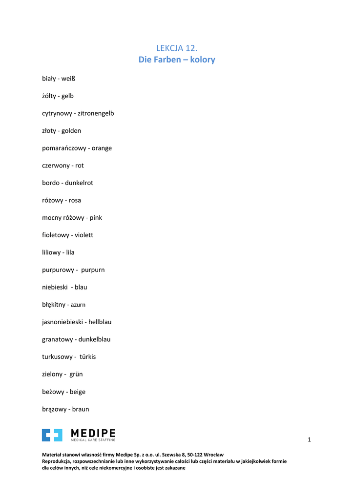 LEKCJA 12. Die Farben – kolory biały - weiß żółty - gelb cytrynowy - zitronengelb złoty - golden pomarańczowy - orange czerwony - rot bordo - dunkelrot różowy - rosa mocny różowy - pink fioletowy - violett liliowy - lila purpurowy - purpurn niebieski - blau błękitny - azurn jasnoniebieski - hellblau granatowy - dunkelblau turkusowy - türkis zielony - grün beżowy - beige brązowy - braun 1 Materiał stanowi własność firmy Medipe Sp. z o.o. ul. Szewska 8, 50-122 Wrocław Reprodukcja, rozpowszechnianie lub inne wykorzystywanie całości lub części materiału w jakiejkolwiek formie dla celów innych, niż cele niekomercyjne i osobiste jest zakazane szary - grau srebrny - silbern czarny - schwarz biało-czarny - weiß-schwarz ciemny - dunkel jaskrawy - grell jasny - hell kolorowy - bunt seledynowy - seladongrün kremowy - cremefarben miodowy - honiggelb błyszczący - leuchtend karmazynowy - karmesinrot stalowy - stahlblau weißrot - biało- czerwony bursztynowy - bersteinfarben miedziany - kupferfarben patelowy - pastelfarben perłowy – perlweiß popielaty - aschgrau oliwkowy – oliv matowy - matt 2 Materiał stanowi własność firmy Medipe Sp. z o.o. ul. Szewska 8, 50-122 Wrocław Reprodukcja, rozpowszechnianie lub inne wykorzystywanie całości lub części materiału w jakiejkolwiek formie dla celów innych, niż cele niekomercyjne i osobiste jest zakazane Czas na przysłowia: Liebe macht blind - Miłość czyni ślepym. 3 Materiał stanowi własność firmy Medipe Sp. z o.o. ul. Szewska 8, 50-122 Wrocław Reprodukcja, rozpowszechnianie lub inne wykorzystywanie całości lub części materiału w jakiejkolwiek formie dla celów innych, niż cele niekomercyjne i osobiste jest zakazane