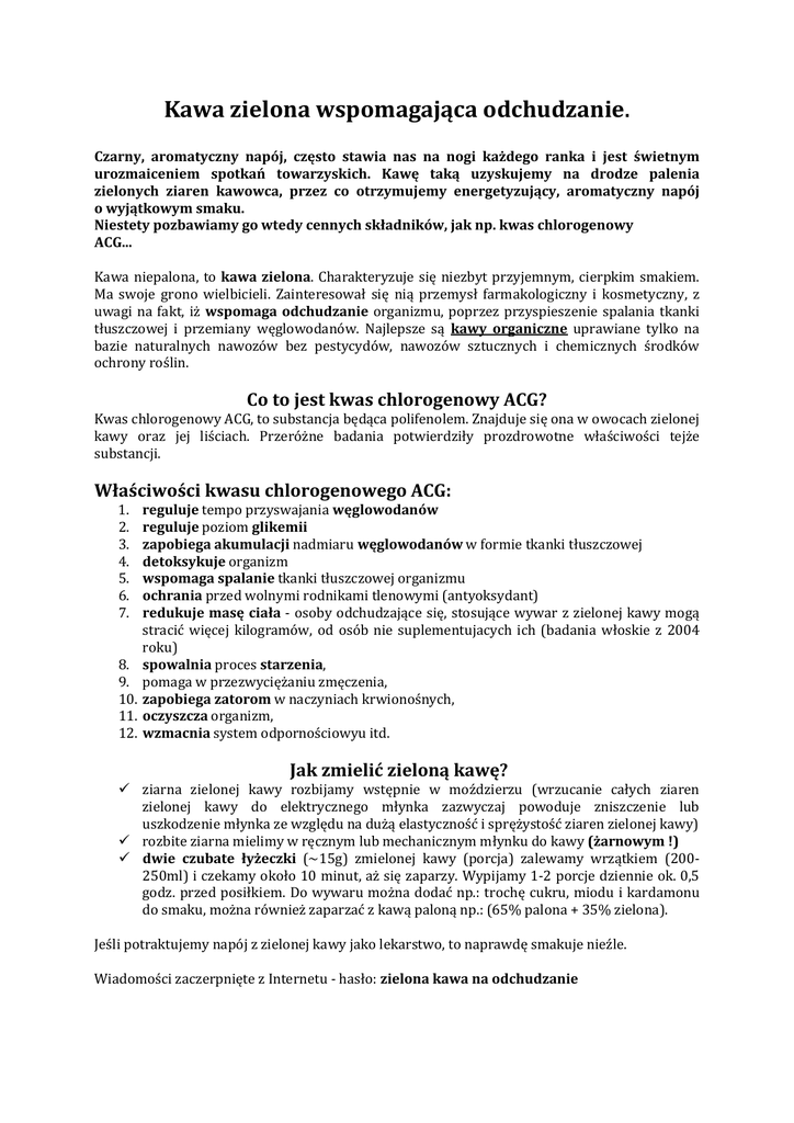 Kawa zielona wspomagająca odchudzanie. Czarny, aromatyczny napój, często stawia nas na nogi każdego ranka i jest świetnym urozmaiceniem spotkań towarzyskich. Kawę taką uzyskujemy na drodze palenia zielonych ziaren kawowca, przez co otrzymujemy energetyzujący, aromatyczny napój o wyjątkowym smaku. Niestety pozbawiamy go wtedy cennych składników, jak np. kwas chlorogenowy ACG... Kawa niepalona, to kawa zielona. Charakteryzuje się niezbyt przyjemnym, cierpkim smakiem. Ma swoje grono wielbicieli. Zainteresował się nią przemysł farmakologiczny i kosmetyczny, z uwagi na fakt, iż wspomaga odchudzanie organizmu, poprzez przyspieszenie spalania tkanki tłuszczowej i przemiany węglowodanów. Najlepsze są kawy organiczne uprawiane tylko na bazie naturalnych nawozów bez pestycydów, nawozów sztucznych i chemicznych środków ochrony roślin. Co to jest kwas chlorogenowy ACG? Kwas chlorogenowy ACG, to substancja będąca polifenolem. Znajduje się ona w owocach zielonej kawy oraz jej liściach. Przeróżne badania potwierdziły prozdrowotne właściwości tejże substancji. Właściwości kwasu chlorogenowego ACG: 1. 2. 3. 4. 5. 6. 7. 8. 9. 10. 11. 12. reguluje tempo przyswajania węglowodanów reguluje poziom glikemii zapobiega akumulacji nadmiaru węglowodanów w formie tkanki tłuszczowej detoksykuje organizm wspomaga spalanie tkanki tłuszczowej organizmu ochrania przed wolnymi rodnikami tlenowymi (antyoksydant) redukuje masę ciała - osoby odchudzające się, stosujące wywar z zielonej kawy mogą stracić więcej kilogramów, od osób nie suplementujacych ich (badania włoskie z 2004 roku) spowalnia proces starzenia, pomaga w przezwyciężaniu zmęczenia, zapobiega zatorom w naczyniach krwionośnych, oczyszcza organizm, wzmacnia system odpornościowyu itd. Jak zmielić zieloną kawę? ziarna zielonej kawy rozbijamy wstępnie w moździerzu (wrzucanie całych ziaren zielonej kawy do elektrycznego młynka zazwyczaj powoduje zniszczenie lub uszkodzenie młynka ze względu na dużą elastyczność i sprężystość ziaren zielonej kawy) rozbite ziarna mielimy w ręcznym lub mechanicznym młynku do kawy (żarnowym !) dwie czubate łyżeczki (~15g) zmielonej kawy (porcja) zalewamy wrzątkiem (200250ml) i czekamy około 10 minut, aż się zaparzy. Wypijamy 1-2 porcje dziennie ok. 0,5 godz. przed posiłkiem. Do wywaru można dodać np.: trochę cukru, miodu i kardamonu do smaku, można również zaparzać z kawą paloną np.: (65% palona + 35% zielona). Jeśli potraktujemy napój z zielonej kawy jako lekarstwo, to naprawdę smakuje nieźle. Wiadomości zaczerpnięte z Internetu - hasło: zielona kawa na odchudzanie