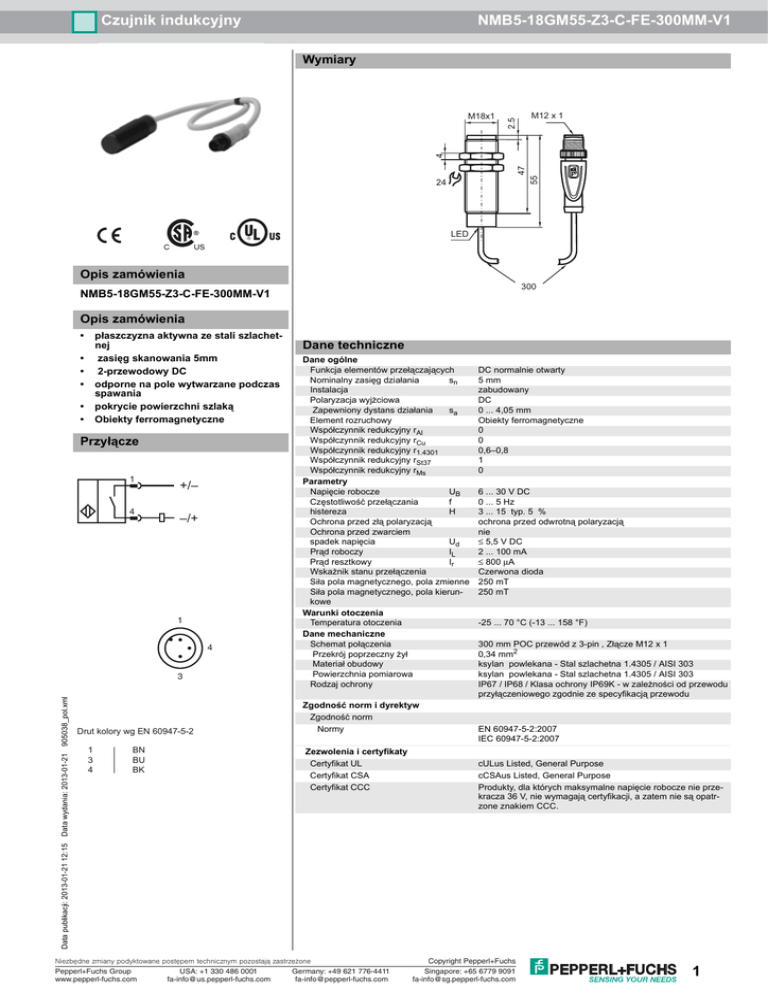Czujnik indukcyjny NMB5-18GM55-Z3-C-FE-300MM-V1 Wymiary 2.5 M12 x 1 55 47 4 M18x1 24 LED Opis zamówienia 300 NMB5-18GM55-Z3-C-FE-300MM-V1 Opis zamówienia • płaszczyzna aktywna ze stali szlachetnej zasięg skanowania 5mm 2-przewodowy DC odporne na pole wytwarzane podczas spawania pokrycie powierzchni szlaką Obiekty ferromagnetyczne • • • • • Przyłącze 1 4 +/– –/+ 1 4 Drut kolory wg EN 60947-5-2 1 3 4 BN BU BK Dane ogólne Funkcja elementów przełączających Nominalny zasięg działania sn Instalacja Polaryzacja wyjżciowa Zapewniony dystans działania sa Element rozruchowy Współczynnik redukcyjny rAl Współczynnik redukcyjny rCu Współczynnik redukcyjny r1.4301 Współczynnik redukcyjny rSt37 Współczynnik redukcyjny rMs Parametry Napięcie robocze UB Częstotliwość przełączania f histereza H Ochrona przed złą polaryzacją Ochrona przed zwarciem spadek napięcia Ud Prąd roboczy IL Prąd resztkowy Ir Wskażnik stanu przełączenia Siła pola magnetycznego, pola zmienne Siła pola magnetycznego, pola kierunkowe Warunki otoczenia Temperatura otoczenia Dane mechaniczne Schemat połączenia Przekrój poprzeczny żył Materiał obudowy Powierzchnia pomiarowa Rodzaj ochrony Zgodność norm i dyrektyw Zgodność norm Normy Zezwolenia i certyfikaty Certyfikat UL Certyfikat CSA Certyfikat CCC DC normalnie otwarty 5 mm zabudowany DC 0 ... 4,05 mm Obiekty ferromagnetyczne 0 0 0,6–0,8 1 0 6 ... 30 V DC 0 ... 5 Hz 3 ... 15 typ. 5 % ochrona przed odwrotną polaryzacją nie ≤ 5,5 V DC 2 ... 100 mA ≤ 800 µA Czerwona dioda 250 mT 250 mT -25 ... 70 °C (-13 ... 158 °F) 300 mm POC przewód z 3-pin , Złącze M12 x 1 0,34 mm2 ksylan powlekana - Stal szlachetna 1.4305 / AISI 303 ksylan powlekana - Stal szlachetna 1.4305 / AISI 303 IP67 / IP68 / Klasa ochrony IP69K - w zależności od przewodu przyłączeniowego zgodnie ze specyfikacją przewodu EN 60947-5-2:2007 IEC 60947-5-2:2007 cULus Listed, General Purpose cCSAus Listed, General Purpose Produkty, dla których maksymalne napięcie robocze nie przekracza 36 V, nie wymagają certyfikacji, a zatem nie są opatrzone znakiem CCC. Data publikacji: 2013-01-21 12:15 Data wydania: 2013-01-21 905038_pol.xml 3 Dane techniczne Niezbêdne zmiany podyktowane postêpem technicznym pozostaj¹ zastrze¿one Pepperl+Fuchs Group USA: +1 330 486 0001 Germany: +49 621 776-4411 www.pepperl-fuchs.com [email protected] [email protected] Copyright Pepperl+Fuchs Singapore: +65 6779 9091 [email protected] 1