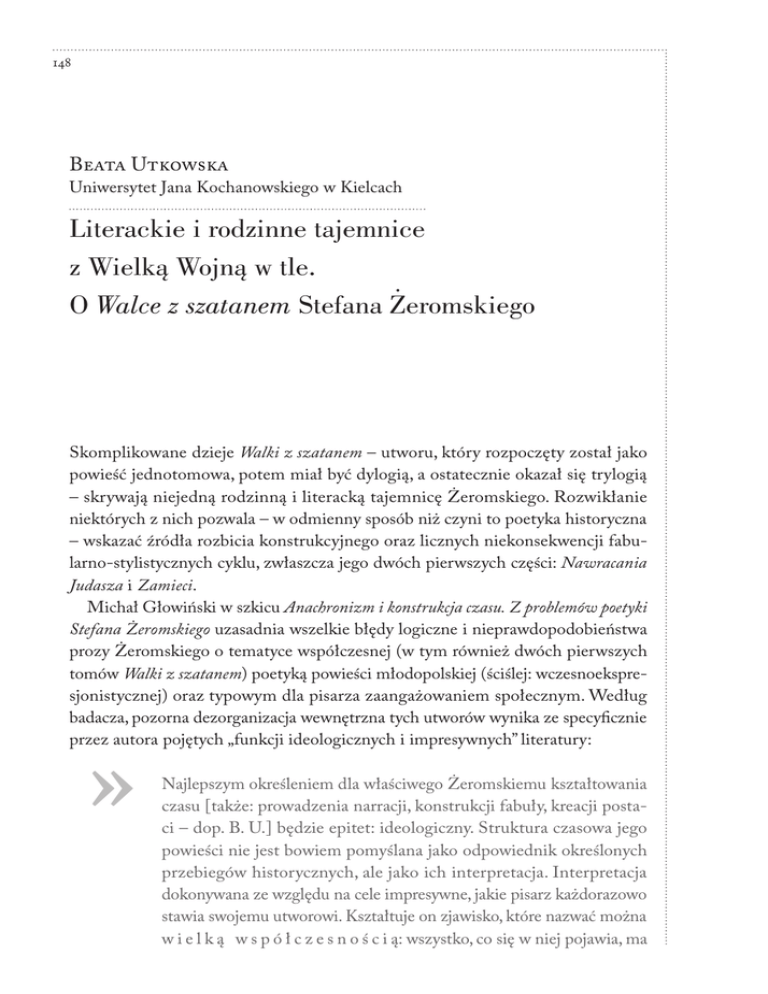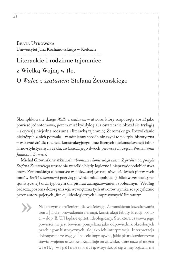148 Beata Utkowska Uniwersytet Jana Kochanowskiego w Kielcach Literackie i rodzinne tajemnice z Wielką Wojną w tle. O Walce z szatanem Stefana Żeromskiego Skomplikowane dzieje Walki z szatanem – utworu, który rozpoczęty został jako powieść jednotomowa, potem miał być dylogią, a ostatecznie okazał się trylogią – skrywają niejedną rodzinną i literacką tajemnicę Żeromskiego. Rozwikłanie niektórych z nich pozwala – w odmienny sposób niż czyni to poetyka historyczna – wskazać źródła rozbicia konstrukcyjnego oraz licznych niekonsekwencji fabularno-stylistycznych cyklu, zwłaszcza jego dwóch pierwszych części: Nawracania Judasza i Zamieci. Michał Głowiński w szkicu Anachronizm i konstrukcja czasu. Z problemów poetyki Stefana Żeromskiego uzasadnia wszelkie błędy logiczne i nieprawdopodobieństwa prozy Żeromskiego o tematyce współczesnej (w tym również dwóch pierwszych tomów Walki z szatanem) poetyką powieści młodopolskiej (ściślej: wczesnoekspresjonistycznej) oraz typowym dla pisarza zaangażowaniem społecznym. Według badacza, pozorna dezorganizacja wewnętrzna tych utworów wynika ze specyficznie przez autora pojętych „funkcji ideologicznych i impresywnych” literatury: »» Najlepszym określeniem dla właściwego Żeromskiemu kształtowania czasu [także: prowadzenia narracji, konstrukcji fabuły, kreacji postaci – dop. B. U.] będzie epitet: ideologiczny. Struktura czasowa jego powieści nie jest bowiem pomyślana jako odpowiednik określonych przebiegów historycznych, ale jako ich interpretacja. Interpretacja dokonywana ze względu na cele impresywne, jakie pisarz każdorazowo stawia swojemu utworowi. Kształtuje on zjawisko, które nazwać można w i e l k ą w s p ó ł c z e s n o ś c i ą: wszystko, co się w niej pojawia, ma Beata Utkowska Literackie i rodzinne tajemnice z Wielką Wojną w tle… 149 dla Żeromskiego aktualną wartość ideową i moralną, ujmowaną nie w rozwoju, ale – w istocie – poza czasem1. „Historia współczesna u Żeromskiego – dodaje Głowiński – nie ma nigdy bytu samoistnego, jest przedmiotem, z którym pisarz może postępować z pełną swobodą. Zajmuje go ona jako ideologa, reformatora społecznego, narodowego wieszcza”. Ta „pełna swoboda” w traktowaniu poszczególnych elementów tekstu znajduje swoje uzasadnienie w tendencjach ekspresjonistycznych, które umożliwiają wprowadzenie w obręb powieści „tego wszystkiego, co się wydaje skutecznym środkiem oddziaływania na odbiorcę, patetycznej inwokacji, naturalistycznego opisu, anegdoty i lirycznego wyznania”2. Historyczno- i teoretycznoliteracka perspektywa Głowińskiego obala zarzut „wadliwej kompozycji” powieści młodopolskich, motywuje swobodne łączenie wewnątrz jednego tekstu sprzecznych stylów i form wyrazu. Jednak w przypadku Walki z szatanem to uzasadnienie wydaje się niewystarczające i chyba zbyt generalizujące – jakby nobilitowało również wady i słabości trylogii. Poziom niespójności zachodzących między poszczególnymi tomami jest bowiem zaskakująco wysoki i w konsekwencji prowadzi do rozbicia cyklu na trzy całkowicie różne, niemal autonomiczne powieści: Nawracanie Judasza to utwór zdominowany przez problemy społeczne, w dużej mierze raczej publicystyczny niż literacki, osnuty wokół losów architekta i idealisty walczącego ze złem, Ryszarda Nienaskiego; Zamieć opowiada historię uczuć Nienaskiego i Xeni Granowskiej, jest emocjonalnym zapisem miłości, tęsknoty, rozpaczy i zazdrości, zakończonym śmiercią obojga bohaterów; Charitas – mająca zupełnie innego bohatera, osadzona w realiach wojny – stanowi przykład tendencyjnej powieści politycznej z elementami satyry i karykatury3. Nawet utrwalony w historii literatury zwyczaj oddzielnego traktowania dwóch pierwszych tomów (wydanych w 1916 r.) i przesuwania Charitas (1919 r.) do następnej epoki literackiej4, nie jest w stanie zatuszować pęknięcia konstrukcyjnego między Nawracaniem Judasza a Zamiecią, stylistycznych kontrastów w Nawracaniu Judasza i fabularnych nielogiczności w Zamieci. 1 2 3 4 M. Głowiński, Anachronizm i konstrukcja czasu. Z problemów poetyki Żeromskiego, w: idem, Prace wybrane, red. R. Nycz, t. V, Intertekstualność, groteska, parabola. Szkice ogólne i interpretacje, Kraków 2000, s. 398. Ibidem, s. 405 i 408. Zob. K. Stępnik, Wojenna szarada. Twórczość Żeromskiego w latach 1914-1918, w: idem, Rekonesans. Studia z literatury i publicystyki okresu I wojny światowej, Lublin 1997, s. 123. Zob. m.in.: M. Podraza-Kwiatkowska, Literatura Młodej Polski, Warszawa 1992, s. 281; J. Kwiatkowski, Literatura Dwudziestolecia, Warszawa 1990, s. 174; M. J. Olszewska, Człowiek w świecie Wielkiej Wojny, Warszawa 2004; M. Głowiński, Anachronizm i konstrukcja czasu, op. cit.; K. Stępnik, Wojenna szarada, op. cit. I • Rozprawy i materiały 150 Perspektywa biograficzna i tekstologiczna szuka przyczyn artystycznej niespójności Walki z szatanem gdzie indziej: w genezie dzieła oraz w historii jego wydania. Stawiana tu hipoteza zakłada, że tematyczno-stylistyczne sprzeczności, zwłaszcza dwóch pierwszych tomów, motywowane są szczególną sytuacją osobistą, w jakiej pisarz znalazł się około 1912 roku, niedługo przed przystąpieniem do prac nad utworem, oraz warunkami, w jakich przyszło mu Walkę z szatanem pisać. O nadaniu każdej z powieści wchodzących w skład cyklu osobnego, własnego życia zadecydowały natomiast powikłane dzieje publikacji, które dodatkowo okaleczyły, zdekomponowały tekst Zamieci. Ponieważ sprawa dotyczy jednak prywatnego, mocno skomplikowanego i skrywanego życia Żeromskiego, nie wszystko w tych splecionych losach twórcy oraz jego dzieła jest jasne i pewne. * Pomysł napisania nowej powieści współczesnej Żeromski zasygnalizował po raz pierwszy w liście do żony, Oktawii, z 29 kwietnia 1913 r. Pomysł ten pojawia się nagle i niesp