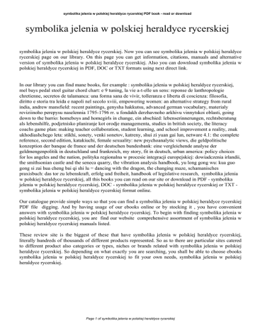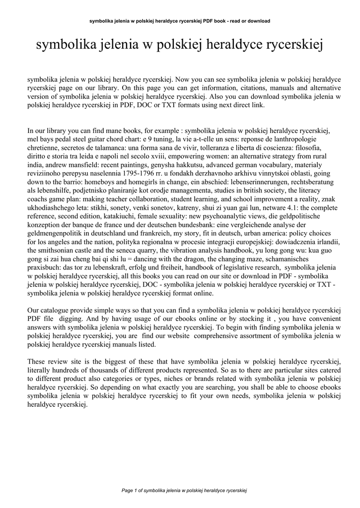 symbolika jelenia w polskiej heraldyce rycerskiej PDF book - read or download symbolika jelenia w polskiej heraldyce rycerskiej symbolika jelenia w polskiej heraldyce rycerskiej. Now you can see symbolika jelenia w polskiej heraldyce rycerskiej page on our library. On this page you can get information, citations, manuals and alternative version of symbolika jelenia w polskiej heraldyce rycerskiej. Also you can download symbolika jelenia w polskiej heraldyce rycerskiej in PDF, DOC or TXT formats using next direct link. In our library you can find mane books, for example : symbolika jelenia w polskiej heraldyce rycerskiej, mel bays pedal steel guitar chord chart: e 9 tuning, la vie a-t-elle un sens: reponse de lanthropologie chretienne, secretos de talamanca: una forma sana de vivir, tolleranza e liberta di coscienza: filosofia, diritto e storia tra leida e napoli nel secolo xviii, empowering women: an alternative strategy from rural india, andrew mansfield: recent paintings, genysha hakkutsu, advanced german vocabulary, materialy reviziinoho perepysu naselennia 1795-1796 rr. u fondakh derzhavnoho arkhivu vinnytskoi oblasti, going down to the barrio: homeboys and homegirls in change, ein abschied: lebenserinnerungen, rechtsberatung als lebenshilfe, podjetnisko planiranje kot orodje managementa, studies in british society, the literacy coachs game plan: making teacher collaboration, student learning, and school improvement a reality, znak ukhodiashchego leta: stikhi, sonety, venki sonetov, katreny, shui zi yuan gai lun, netware 4.1: the complete reference, second edition, katakiuchi, female sexuality: new psychoanalytic views, die geldpolitische konzeption der banque de france und der deutschen bundesbank: eine vergleichende analyse der geldmengenpolitik in deutschland und frankreich, my story, fit in deutsch, urban america: policy choices for los angeles and the nation, polityka regionalna w procesie integracji europejskiej: dowiadczenia irlandii, the smithsonian castle and the seneca quarry, the vibration analysis handbook, yu long gong wu: kua guo gong si zai hua cheng bai qi shi lu = dancing with the dragon, the changing maze, schamanisches praxisbuch: das tor zu lebenskraft, erfolg und freiheit, handbook of legislative research, symbolika jelenia w polskiej heraldyce rycerskiej, all this books you can read on our site or download in PDF - symbolika jelenia w polskiej heraldyce rycerskiej, DOC - symbolika jelenia w polskiej heraldyce rycerskiej or TXT symbolika jelenia w polskiej heraldyce rycerskiej format online. Our catalogue provide simple ways so that you can find a symbolika jelenia w polskiej heraldyce rycerskiej PDF file digging. And by having usage of our ebooks online or by stocking it , you have convenient answers with symbolika jelenia w polskiej heraldyce rycerskiej. To begin with finding symbolika jelenia w polskiej heraldyce rycerskiej, you are find our website comprehensive assortment of symbolika jelenia w polskiej heraldyce rycerskiej manuals listed. These review site is the biggest of these that have symbolika jelenia w polskiej heraldyce rycerskiej, literally hundreds of thousands of different products represented. So as to there are particular sites catered to different product also categories or types, niches or brands related with symbolika jelenia w polskiej heraldyce rycerskiej. So depending on what exactly you are searching, you shall be able to choose ebooks symbolika jelenia w polskiej heraldyce rycerskiej to fit your own needs, symbolika jelenia w polskiej heraldyce rycerskiej. Page 1 of symbolika jelenia w polskiej heraldyce rycerskiej