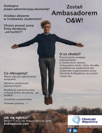 Studiujesz prawo/administrację/ekonomię? Działasz aktywnie w środowisku studenckim? Chcesz poznać pracę firmy doradczej „od kuchni”? Zostań Ambasadorem O&W! O co chodzi? Co oferujemy? Płatny staż po zakończeniu programu; Poszukujemy swojego reprezentanta w studenckim świecie, ambasadora marki, który chciałby współtworzyć wydarzenia dla studentów organizowane przez Olesiński & Wspólnicy na uczelni i poza nią. Udział w szkoleniach wewnętrznych; Możliwość poznania pracy w dużej firmie doradczej „od środka”; Certyfikat uczestnictwa; Firmowe gadżety ;-) Jak się zgłosić? Wyślij CV oraz list motywacyjny na adres [email protected] Więcej na olesinski.com/kariera