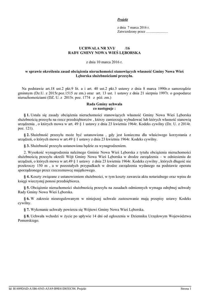 Projekt z dnia 7 marca 2016 r. Zatwierdzony przez ......................... UCHWAŁA NR XVI/ /16 RADY GMINY NOWA WIEŚ LĘBORSKA z dnia 10 marca 2016 r. w sprawie określenia zasad obciążenia nieruchomości stanowiących własność Gminy Nowa Wieś Lęborska służebnościami przesyłu. Na podstawie art.18 ust.2 pkt.9 lit. a i art. 40 ust.2 pkt.3 ustawy z dnia 8 marca 1990r.o samorządzie gminnym (Dz.U. z 2015r.poz.1515 ze zm.) oraz art. 13 ust. 1 ustawy z dnia 21 sierpnia 1997r. o gospodarce nieruchomościami (DZ. U. z 2015r. poz. 1774 z póź. zm.) Rada Gminy uchwala co następuje : § 1. Ustala się zasady obciążenia nieruchomości stanowiących własność Gminy Nowa Wieś Lęborska służebnością przesyłu na rzecz przedsiębiorców , którzy zamierzają wybudować lub których własność stanowią urządzenia , o których mowa w art. 49 § 1 ustawy z dnia 23 kwietnia 1964r. Kodeks cywilny (Dz. U. z 2014r. poz. 121). § 2. Służebność przesyłu może być ustanowiona , gdy jest konieczna dla właściwego korzystania z urządzeń, o których mowa w art.49 § 1 ustawy z dnia 23 kwietnia 1964r. Kodeks cywilny. § 3. Służebność przesyłu ustanowiona będzie za wynagrodzeniem. 2. Wysokość wynagrodzenia należnego Gminie Nowa Wieś Lęborska z tytułu obciążenia nieruchomości służebnością przesyłu określi Wójt Gminy Nowa Wieś Lęborska w drodze zarządzenia – w odniesieniu do urządzeń, o których mowa w art.49 § 1 ustawy z dnia 23 kwietnia 1964r. Kodeks cywilny , których długość nie przekroczy 150 m , a w pozostałych przypadkach w drodze zarządzenia wydanego na podstawie operatu sporządzonego przez rzeczoznawcę majątkowego. § 4. Koszty związane z ustanowieniem służebności, w tym koszty zawarcia aktu notarialnego oraz wpisu do księgi wieczystej ponosi przedsiębiorca. § 5. Obciążenie nieruchomości służebnością przesyłu na zasadach odmiennych wymaga odrębnej uchwały Rady Gminy Nowa Wieś Lęborska. § 6. W zakresie nieuregulowanym w niniejszej uchwale zastosowanie mają przepisy ustawy Kodeks cywilny. § 7. Wykonanie uchwały powierza się Wójtowi Gminy Nowa Wieś Lęborska. § 8. Uchwała wchodzi w życie po upływie 14 dni od ogłoszenia w Dzienniku Urzędowym Województwa Pomorskiego. Id: B1489DAD-A1B6-4543-A5A9-B9E61D03EC04. Projekt Strona 1
