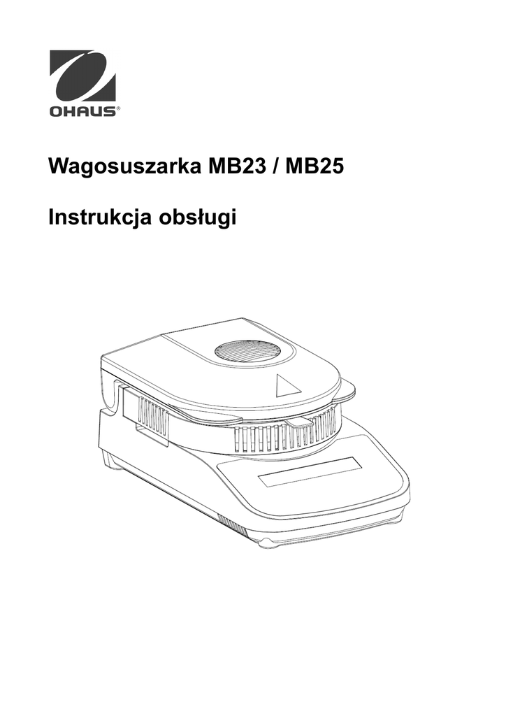 Wagosuszarka MB23 / MB25 Instrukcja obsługi Ohaus Corporation, 19A Chapin Road, P.O. Box 2033, Pine Brook, New Jersey, 07058, USA Declaration of conformity We, Ohaus Corporation, declare under our sole responsibility that the balance models listed below marked with “CE” – are in conformity with the directives and standards mentioned. Declaración de Conformidad Nosotros, Ohaus Corporation, declaramos bajo responsabilidad exclusiva que los modelos de balanzas indicados a continuación – con el distintivo "CE" – son conformes con las directivas y normas citadas. Déclaration de conformité Nous, Ohaus Corporation, déclarons sous notre seule responsabilité, que les types de balance cités ci-dessous – munis de la mention "CE" – sont conformes aux directives et aux normes mentionnées ci-après. Konformitätserklärung Wir, die Ohaus Corporation, erklären in alleiniger Verantwortung, dass die untenstehenden Waagentypen – gekennzeichnet mit "CE" – mit den genannten Richtlinien und Normen übereinstimmen. Dichiarazione di conformità Noi, Ohaus Corporation, dichiariamo sotto nostra unica responsabilità che i tipi di bilance specificati di seguito – contrassegnati con la marcatura “CE” – sono conformi alle direttive e norme citate. Model/Type Modelo/Typo Modèle/Type Modell/Typ Modello/Tipo MB23 Series Scales Bascula Serie MB23 Balance Série MB23 MB23 Serie Waage Bilancia Serie MB23 EC Marking Marcado CE Marquage CE EC-Markierung Marcature CE EC Directive Directiva CE Directive CE EC Richtlinie Direttiva CE Applicable Standards Normas aplicables Normes applicables Geltende Standards Norme applicabili 2006/95/EC Low Voltage Baja tensión Basse tension Niederspannung Bassa tensione EN 61010-1:2001 EN 61010-2-010:2003 2004/108/EC Electromagnetic Compatibility Compatibilidad electromagnética Compatibilité électromagnétique Elektromagnetische Verträglichkeit Compatibilità elettromagnetica EN 61326-1:2006 Last two digits of the year in which the CE marking was affixed: Las dos últimas cifras del año de colocación del marcado "CE": Les deux derniers chiffres de l'année d'apposition du marquage "CE": Die beiden letzten Ziffern des Jahres, in dem die "CE" -Kennzeichnung angebracht wurde: Le ultime due cifre dell'anno in cui è stata apposta la marcatura "CE": 08 Issued: September 2008 Pine Brook, NJ USA Ted Xia President Ohaus Corporation Pine Brook, NJ USA Markus Baerlocher General Manager Ohaus Europe Greifensee, Switzerland 08A Ohaus Corporation, 19A Chapin Road, P.O. Box 2033, Pine Brook, New Jersey, 07058, USA Declaration of conformity We, Ohaus Corporation, declare under our sole responsibility that the balance models listed below marked with “CE” – are in conformity with the directives and standards mentioned. Declaración de Conformidad Nosotros, Ohaus Corporation, declaramos bajo responsabilidad exclusiva que los modelos de balanzas indicados a continuación – con el distintivo "CE" – son conformes con las directivas y normas citadas. Déclaration de conformité Nous, Ohaus Corporation, déclarons sous notre seule responsabilité, que les types de balance cités ci-dessous – munis de la mention "CE" – sont conformes aux directives et aux normes mentionnées ci-après. Konformitätserklärung Wir, die Ohaus Corporation, erklären in alleiniger Verantwortung, dass die untenstehenden Waagentypen – gekennzeichnet mit "CE" – mit den genannten Richtlinien und Normen übereinstimmen. Dichiarazione di conformità Noi, Ohaus Corporation, dichiariamo sotto nostra unica responsabilità che i tipi di bilance specificati di seguito – contrassegnati con la marcatura “CE” – sono conformi alle direttive e norme citate. Model/Type Modelo/Typo Modèle/Type Modell/Typ Modello/Tipo MB25 Series Scales Bascula Serie MB25 Balance Série MB25 MB25 Serie Waage Bilancia Serie MB25 EC Marking Marcado CE Marquage CE EC-Markierung Marcature CE EC Directive Directiva CE Directive CE EC Richtlinie Direttiva CE Applicable Standards Normas aplicables Normes applicables Geltende Standards Norme applicabili 2006/95/EC Low Voltage Baja tensión Basse tension Niederspannung Bassa tensione EN 61010-1:2001 EN 61010-2-010:2003 2004/108/EC Electromagnetic Compatibility Compatibilidad electromagnética Compatibilité électromagnétique Elektromagnetische Verträglichkeit Compatibilità elettromagnetica EN 61326-1:2006 Last two digits of the year in which the CE marking was affixed: Las dos últimas cifras del año de colocación del marcado "CE": Les deux derniers chiffres de l'année d'apposition du marquage "CE": Die beiden letzten Ziffern des Jahres, in dem die "CE" -Kennzeichnung angebracht wurde: Le ultime due cifre dell'anno in cui è stata apposta la marcatura "CE": 08 Issued: September 2008 Pine Brook, NJ USA Ted Xia President Ohaus Corporation Pine Brook, NJ USA Markus Baerlocher General Manager Ohaus Europe Greifensee, Switzerland 08A 1. Wstęp Instrukcje bezpieczeństwa W celu zapewnienia bezpiecznej i niezawodnej pracy wagosuszarki, prosimy przestrzegać następujących instrukcji bezpieczeństwa: Wagosuszarki należy używać wyłącznie do oznaczania zawartości wilgoci w próbkach. Wykorzystanie urządzenia w innym celu może spowodować zagrożenie dla personelu i zniszczenie urządzenia; Jeżeli wagosuszarka wykorzystywana jest w inny sposób niż opisany w niniejszej instrukcji obsługi, wbudowane zabezpieczenia wagosuszarki mogą zostać uszkodzone; Przed podłączeniem wagosuszarki należy sprawdzić, czy napięcie podane na tabliczce znamionowej oraz typ wtyczki pasuje do lokalnej sieci zasilającej; Wagosuszarka jest dostarczana z trójżyłowym kablem zasilającym z bolcem uziemiającym. Zabrania się celowego odłączania przewodu uziemiającego; Nie należy ustawiać wagosuszarki w sposób utrudniający odłączenie kabla zasilającego z gniazdka zasilania; Upewnić się, że kabel zasilający nie stanowi przeszkody dla ruchu osób i nie jest 