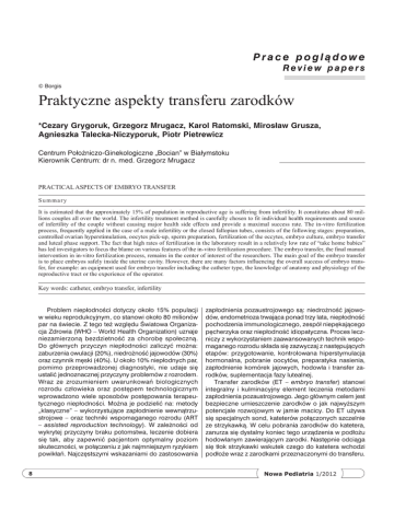 Prace poglądowe Review papers © Borgis Praktyczne aspekty transferu zarodków *Cezary Grygoruk, Grzegorz Mrugacz, Karol Ratomski, Mirosław Grusza, Agnieszka Talecka-Niczyporuk, Piotr Pietrewicz Centrum Położniczo−Ginekologiczne „Bocian” w Białymstoku Kierownik Centrum: dr n. med. Grzegorz Mrugacz Practical aspects of embryo transfer Summary It is estimated that the approximately 15% of population in reproductive age is suffering from infertility. It constitutes about 80 millions couples all over the world. The infertility treatment method is carefully chosen to fit individual health requirements and source of infertility of the couple without causing major health side effects and provide a maximal success rate. The in-vitro fertilization process, frequently applied in the case of a male infertility or the closed fallopian tubes, consists of the following stages: preparation, controlled ovarian hyperstimulation, oocytes pick-up, sperm preparation, fertilization of the occytes, embryo culture, embryo transfer and luteal phase support. The fact that high rates of fertilization in the laboratory result in a relatively low rate of “take home babies” has led investigators to focus the blame on various features of the in-vitro fertilization procedure. The embryo transfer, the final manual intervention in in-vitro fertilization process, remains in the center of interest of the researchers. The main goal of the embryo transfer is to place embryos safely inside the uterine cavity. However, there are many factors influencing the overall success of embryo transfer, for example: an equipment used for embryo transfer including the catheter type, the knowledge of anatomy and physiology of the reproductive tract or the experience of the operator. Key words: catheter, embryo transfer, infertility Problem niepłodności dotyczy około 15% populacji w wieku reprodukcyjnym, co stanowi około 80 milionów par na świecie. Z tego też względu Światowa Organizacja Zdrowia (WHO – World Health Organization) uznaje niezamierzoną bezdzietność za chorobę społeczną. Do głównych przyczyn niepłodności zaliczyć można: zaburzenia owulacji (20%), niedrożność jajowodów (30%) oraz czynnik męski (40%). U około 10% niepłodnych par, pomimo przeprowadzonej diagnostyki, nie udaje się ustalić jednoznacznej przyczyny problemów z rozrodem. Wraz ze zrozumieniem uwarunkowań biologicznych rozrodu człowieka oraz postępem technologicznym wprowadzono wiele sposobów postępowania terapeutycznego niepłodności. Można je podzielić na: metody „klasyczne” – wykorzystujące zapłodnienie wewnątrzustrojowe – oraz techniki wspomaganego rozrodu (ART – assisted reproduction technology). W zależności od wykrytej przyczyny braku potomstwa, leczenie dobiera się tak, aby zapewnić pacjentom optymalny poziom skuteczności, w połączeniu z jak najmniejszym ryzykiem powikłań. Najczęstszymi wskazaniami do zastosowania 8 zapłodnienia pozaustrojowego są: niedrożność jajowodów, endometrioza trwająca ponad trzy lata, niepłodność pochodzenia immunologicznego, zespół niepękającego pęcherzyka oraz niepłodność idiopatyczna. Proces leczniczy z wykorzystaniem zaawansowanych technik wspomaganego rozrodu składa się zazwyczaj z następujących etapów: przygotowanie, kontrolowana hiperstymulacja hormonalna, pobranie oocytów, preparatyka nasienia, zapłodnienie komórek jajowych, hodowla i transfer zarodków, suplementacja fazy lutealnej. Transfer zarodków (ET – embryo transfer) stanowi integralny i kulminacyjny element leczenia metodami zapłodnienia pozaustrojowego. Jego głównym celem jest bezpieczne umieszczenie zarodków o jak najwyższym potencjale rozwojowym w jamie macicy. Do ET używa się specjalnych sond, kateterów połączonych szczelnie ze strzykawką. W celu pobrania zarodków do katetera, zanurza się dystalny koniec tego urządzenia w podłożu hodowlanym zawierającym zarodki. Następnie odciąga się tłok strzykawki wskutek czego do katetera wchodzi podłoże wraz z zarodkami przeznaczonymi do transferu. Nowa Pediatria 1/2012 Praktyczne aspekty transferu zarodków Przygotowany w taki sposób kateter wprowadza się do jamy macicy przez kanał szyjki macicy. Następnie w wyniku naciśnięcia tłoka strzykawki zostaje wytworzone ciśnienie w komorze roboczej, które jest przenoszone do wnętrza katatera, na skutek czego dochodzi do wstrzyknięcia transferowanego podłoża hodowlanego wraz z zarodkami do jamy macicy. Pomimo tego, że uzyskiwane w laboratoriach wskaźniki zapłodnień i rozwoju zarodków są dość wysokie, to jednak ostateczne wyniki kliniczne rozumiane w postaci ciąż klinicznych oraz „zdrowego dziecka zabranego do domu” są nadal niezadawalające (1). Skłoniło to wielu badaczy do poszukiwania przyczyn takiego stanu rzeczy. Spośród wielu czynników mogących mieć wpływ na powodzenie transferu najczęściej zwraca się uwagę na czynniki związane z anatomią i fizjologią układu rozrodczego oraz na aspekty techniczne ET. Łatwość wykonania transferu ma zasadniczy wpływ na ostateczny wynik leczenia. Z obserwacji klinicznych wynika, że prawdopodobieństwo uzyskania ciąży jest znamiennie większe w przypadku transferu łatwego niż trudnego, tzn. przebiegającego z komplikacjami (2). W badaniu obejmującym 4807 transferów wykazano, że wskaźnik ciąż był 1,7 razy wyższy w grupie transferów łatwych niż trudnych (3). Pojęcie transferu trudnego jest dość subiektywne, niemniej wiąże się z użyciem dodatkowego instrumentarium, dyskomfortem pacjentki, wydłużeniem czasu procedury. Jednym z możliwych mechanizmów odpowiedzialnych za słabsze wyniki w przypadku transferu trudnego może być stymulowanie czynności skurczowej macicy (4). W nieciężarnej macicy, spontaniczne skurcze rozchodzą się w kierunku od szyjki macicy do dna macicy z częstością od 1 do 5 skurczów/minutę. Jedynie podczas miesiączki skurcze obi