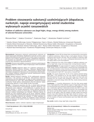 880 Probl Hig Epidemiol 2014, 95(4): 880-888 Problem stosowania substancji uzależniających (dopalacze, narkotyki, napoje energetyzujące) wśród studentów wybranych uczelni rzeszowskich Problem of addictive substance use (legal highs, drugs, energy drinks) among students of selected Rzeszow universities Wacław Kruk 1/, Izabela Cichocka 2/, Karolina Zając 3/, Agnieszka Hubert-Lutecka 4/ Katedra Zdrowia Publicznego, Instytut Pielęgniarstwa i Nauk o Zdrowiu, Wydział Medyczny, Uniwersytet Rzeszowski Katedra Metod Ilościowych w Ekonomii, Wydział Ekonomiczny, Wyższa Szkoła Informatyki i Zarządzania w Rzeszowie 3/ Studenckie Koło Naukowe Zdrowia Publicznego „Salus”, Wyższa Szkoła Informatyki i Zarządzania w Rzeszowie 4/ Wydział Nauk Biomedycznych i Kształcenia Podyplomowego, Uniwersytet Medyczny w Łodzi 1/ 2/ Wprowadzenie. Spożywanie substancji uzależniających właściwie od zawsze towarzyszyło człowiekowi. Współcześnie mamy do czynienia z dużo większą różnorodnością tych substancji niż to miało miejsce w przeszłości. Zawarte są one w lekach, legalnych używkach i nielegalnych narkotykach. Ich zażywanie jest zjawiskiem na tyle powszechnym, że nie zawsze jest oceniane jako zachowanie nieprzystosowawcze. Cel badań. Poznanie skali problemu stosowania substancji uzależniających takich, jak: dopalacze, narkotyki i napoje energetyzujące, wśród rzeszowskich studentów. Materiał i metody. Badaniem objęto 477 studentów studiujących na kierunkach: Zdrowie Publiczne, Turystyka i Rekreacja, Bezpieczeństwo Wewnętrzne, Kosmetologia oraz Prawo i Administracja w Wyższej Szkole Informatyki i Zarządzania w Rzeszowie oraz na Uniwersytecie Rzeszowskim. Jako narzędzie badawcze wykorzystano autorski kwestionariusz ankiety przeprowadzonej w kwietniu 2011 r. Wyniki. Spośród badanych studentów 10,7% zdeklarowało zażywanie dopalaczy, 1,5% zamierza je spróbować. Zdecydowana większość respondentów (83,6%) deklarowała, że nigdy nie brała narkotyków, a ci, którzy przyznali się, że ,,brali”, albo ,,kiedyś próbowali”, najczęściej stosowali marihuanę. Ponad połowa ankietowanych (56,3%) spożywa napoje energetyzujące głównie w czasie dużego wysiłku fizycznego. Wnioski. 1. Pozytywnym zjawiskiem jest fakt, iż młodzi ludzie wykazują się wysoką świadomością uzależniającego działania dopalaczy oraz deklarowane przez większość z nich przekonanie, iż powinny być one w ogóle zakazane. 2. Istnieje statystycznie istotna zależność pomiędzy kierunkiem studiów a opinią na temat tego, czy dopalacze powinny być zakazane. Studenci Kosmetologii oraz Turystyki i Rekreacji częściej niż pozostali nie mieli wyrobionej opinii na ten temat, natomiast studenci Zdrowia Publicznego i Bezpieczeństwa Wewnętrznego częściej niż pozostali uważali, ze dopalacze powinny być zakazane. 3. Osoby studiujące na kierunku Zdrowie Publiczne rzadziej od studentów innych kierunków sięgają po dopalacze, zaś studenci Turystyki i Rekreacji częściej od innych sięgają po narkotyki. Introduction. Human life has always been accompanied by consumption of addictive substances. Today we have a much greater diversity of these substances than we did in the past. They are included in medicines, legal and illegal drugs. Their use is such a widespread phenomenon that it is not always rated as anti-social behavior. Aim. To determine the scale of the problem of addictive substance use, such as legal highs, drugs and energy drinks ‘among Rzeszow students. Material & Method. The study included 477 students of the following fields: Public Health, Tourism and Recreation, Internal Security, Cosmetology and Law and Administration at the University of Information Technology and Management in Rzeszow and Rzeszow University. An original questionnaire survey conducted in April 2011 was used as a research tool. Results. The results showed that 10.7% of the students declared taking legal highs, 1.5% intended to try. The vast majority of the respondents (83.6%) declared that they had never taken drugs and those who had admitted the use usually tried marijuana. More than a half of the respondents consumed energy drinks (56.3%), mainly during extensive physical workout. Conclusions. 1. A positive phenomenon is the fact that young people show a high awareness of the addictive impact of legal highs and mostly are convinced that such substances should be banned altogether. 2. There was a statistically significant relationship between the field of study and opinion on whether legal highs should be banned. The Cosmetology and the Tourism and Recreation students more often did not have their own opinion on the subject, while the students of Public Health and Internal Security more often believed that legal highs should be banned. 3. The students of Public Health less often than other students used legal highs and the students of Tourism and Recreation were more likely than others to use drugs. Key words: students, drugs, legal highs, energy drinks Słowa kluczowe: studenci, narkotyki, dopalacze, napoje energetyzujące © Probl Hig Epidemiol 2014, 95(4): 880-888 www.phie.pl Nadesłano: 10.12.2014 Zakwalifikowano do druku: 20.12.2014 Adres do korespondencji / Address for correspondence Wacław Kruk Katedra Zdrowia Publicznego, Instytut Pielęgniarstwa i Nauk o Zdrowiu, Uniwersytet Rzeszowski al. Mjr. Kopisto 2a, 35-959 Rzeszów tel. 609 625 515, e-mail: [email protected] Kruk W i wsp. Problem stosowania substancji uzależniających (dopalacze, narkotyki, napoje energetyzujące) ... Wstęp Substancje uzależniające to środki naturalne i syntetyczne o właściwościach psychotropowych, wywołujące uzależnienie. Wspólną cechą środków odurzających jest wywoływanie zmian w układzie nerwowym prowadzące do utraty kontroli nad ich używaniem [1]. Problem uzależnienia jest ogromny. Około jed‑ na czwarta populacji dorosłych Europejczyków (co najmniej 85 mln osób