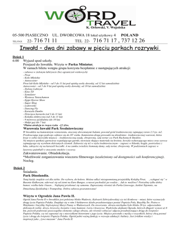 K. Orłowski, V. Wojeńska 05-500 PIASECZNO UL. DWORCOWA 18 lokal użytkowy 4 POLAND 71 11 TEL 22- 716 71 17 , 737 12 26 Inwałd – dwa dni zabawy w pięciu parkach rozrywki TEL/FAX 22- 716 Dzień 1 6:00 Wyjazd spod szkoły. Przejazd do Inwałdu. Wizyta w Parku Miniatur. W ramach biletu wstępu grupa korzysta bezpłatnie z następujących atrakcji: - zabawa w zielonym labiryncie (bez ograniczeń wiekowych) - Pirat - Koło Młyńskie - Autoscooter Pirat lub Koło Młyńskie - od 5 do 11 lat pod opieką osoby dorosłej, od 12 lat samodzielnie Autoscooter - od 5 do 9 lat pod opieką osoby dorosłej, od 10 lat samodzielnie - Zielony Labirynt - Kino 5D - Symulator - Wystawa Tutenchamon - Egipt Horror Show - Super Ślizg - Lodowisko - Dancing Fly - Karuzela Dumbo - Dziecięca karuzela (od 3 do 11 lat) - Kolejka elektryczna (od 3 do 11 lat) - 9 metrowa zjeżdżalnia (do 10 lat) - Małpi gaj (do 7 lat) *Płatna atrakcja to rwąca rzeka -12 zł/os. Warownia Inwałd Park Średniowieczny W Inwałdzie na kamienistym wzniesieniu, otoczony drewnianymi balami, powstał gród średniowieczny zajmujący teren 2,5 tys. m2. Przekraczając jego podwoje cofniesz się do XV wieku. Kamienista droga prowadzi na dziedziniec średniowiecznej warowni, która kryje w sobie niezwykłe miejsca – średniowieczną osadę, zbrojownię, salę tortur czy Park Ruchomych Smoków. Na miejscu spotkasz garncarza wypalającego garnki, niewiasty tkające materiały na krośnie, kowala wykuwającego miecz oraz szewca zajmującego się wyrobem skórzanych ciżemek. Zabawisz się też w stylu średniowiecznym – zagrasz w bilarda, kręgle, postrzelasz z łuku, zakręcisz się na karuzeli beczułki. A na zamku zwiedzisz komnatę damy, salę tortur, zbrojownię. W podziemiach zagrasz w laserowy paintball w otoczeniu smoków i rycerzy. Zakwaterowanie. Obiadokolacja. *Możliwość zorganizowania wieczoru filmowego (uzależniony od dostępności sali konferencyjnej). Nocleg. Dzień 2 Śniadanie. Park Dinolandia. Tutaj każdy znajdzie coś dla siebie. Do wyboru, do koloru. Można odbyć niezapomnianą przejażdżkę Kolejką Pirat, „wykąpać się” w Basenie Kulkowym, oderwać się od ziemi na Euro Bungee, a nawet pochodzić po wodzie… Jak to możliwe? Potrzebny tylko dobry humor, wielka kula i basen… Najlepiej przekonać się samemu. Zapraszamy również do Parku Linowego, Jaskini Tajemnic, na Dmuchaną Zjeżdżalnię i Trampolinę. Dobra zabawa gwarantowana! Wizyta w Ogrodzie Jana Pawła II. Ogród Jana Pawła II w Inwałdzie jest położony blisko Wadowic, Kalwarii Zebrzydowskiej czy też Krakowa – miast, które wyznaczyły drogę życia Papieża Polaka. Znajduje się w nim 3-hektarowe dzieło przedstawiające postać Papieża Pola, Bazylikę Św. Piotra w Watykanie i bazylikę Najświętszej Maryi Panny w Wadowicach. Do stworzenia obrazu niezbędne było blisko 20 tys. odpowiednio dobranych roślin: drzew, krzewów, kwiatów i tony kamieni, żwiru i kruszywa. Wędrówka alejkami Ogrodu, których długość wynosi aż 8 km, pozwoli podziwiać poszczególne elementy całego obrazu, ale również zobaczyć zdjęcia przedstawiające drogę do świętości Papieża Polaka, czy też zapoznać się z niezwykłymi historiami z jego życia. Miejsce powstało z myślą o wszystkich, którzy chcą poznać życie i drogę do świętości Papieża Polaka. Ogród pełni ważną funkcję w rozwoju edukacji i kultury. Jest źródłem wiedzy i inspiracji jako „żywe muzeum” Jana Pawła II. Kucyk Mini ZOO Położony na malowniczych pagórkach, otoczony zagajnikami i płynącą rzeczką tuż u podnóża Beskidu Małego sprawia, że te piękne krajobrazy, różnorodność świata fauny i flory oraz atrakcyjne tereny, gwarantują Ci doskonały wypoczynek, niezależnie od wieku, stanu zdrowia czy kondycji fizycznej oraz dostarczą niezapomnianych wrażeń. Zwiedzanie Mini Zoo to długi spacer po dość urozmaiconym terenie. Można u nas zobaczyć gatunki zwierząt bardziej lub mniej znane – kangury benetta, zebu, dziki, szynszyle, szop pracz czy strusie emu i żurawie koroniaste. Każde zwierze można pokarmić specjalnie do tego przygotowaną karmą. Trzeba przyznać, że mieszkają u nas same głodomory. Obiad. 20.00-21.00 Przyjazd pod szkołę. KOLEJNOŚĆ WIZYTY W PARKACH MOŻE ULEC ZMIANIE! Świadczenia: - transport lux autokarem marki, np. Mercedes, Volvo, Scania, MAN, Neoplan z WC, DVD, barkiem, uchylnymi siedzeniami - zakwaterowanie w hotelu **** w kompleksie Park Inwałd, pokoje z łazienkami - wyżywienie zgodnie z programem - realizacja programu turystycznego - opieka pilota - ubezpieczenie NW 5000 zł - VAT - grupy 30 os. - 2 miejsca gratis dla nauczycieli, od 30 do 45 os. – 3 miejsca gratis dla nauczycieli - bilety wstępu do pięciu parków rozrywki zgodnie z programem. Cena: 350 zł/min. 40 os. - max. 45 os. płacących Standardowy rozmiar naszych autokarów to 49 miejsc (do dyspozycji grupy wraz z opiekunami). Na Państwa życzenie możemy zarezerwować autokary 57-70 miejsc (w tym przypadku prosimy o kontakt z biurem w celu sprawdzenia kalkulacji na ponadstandardowy pojazd i jego dostępności w wybranym przez Państwa terminie). W celu podpisania umowy i rezerwacji konkretnego terminu prosimy o telefon do biura 022 716 71 11 lub 022 716 71 17 lub mail [email protected] Zaliczka konieczna do podpisania umowy: 100 zł/os Ze względu na szczyt sezonu wycieczek szkolnych w miesiącach maj-czerwiec sugerujemy dokonanie rez. wstępnej. Termin, który Państwa interesuje potwierdzamy, po sprawdzeniu dostępności wolnych miejsc w hotelu i zrobieniu rezerwacji wstępnej na czas zebrania zaliczek przez nauczyciela ( najczęściej nie dłużej niż 4 tyg.). Wpłata zaliczki następuje w momencie zawarcia umowy. Dopłata – 45 dni przed terminem wyjazdu. Wyciąg z warunków uczestnictwa imprez turystycznych organizowanych przez B.P. Word Travel (pełna wersja warunków uczestnictwa dostępna jest u nauczyciela organizującego