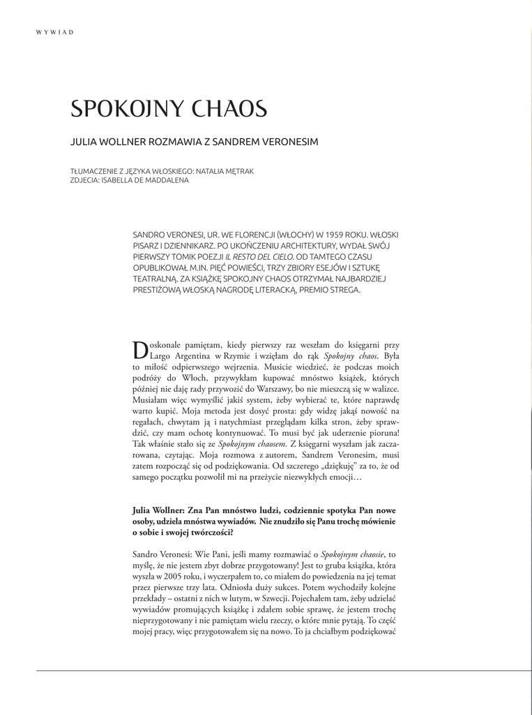 W Y WIAD SPOKOJNY CHAOS JULIA WOLLNER ROZMAWIA Z SANDREM VERONESIM Wywiad Julii Wollner z Sandrem Veronesim TŁUMACZENIE Z JĘZYKA WŁOSKIEGO: NATALIA MĘTRAK ZDJECIA: ISABELLA DE MADDALENA SANDRO VERONESI, UR. WE FLORENCJI (WŁOCHY) W 1959 ROKU. WŁOSKI PISARZ I DZIENNIKARZ. PO UKOŃCZENIU ARCHITEKTURY, WYDAŁ SWÓJ PIERWSZY TOMIK POEZJI IL RESTO DEL CIELO. OD TAMTEGO CZASU Isabella De Maddalena OPUBLIKOWAŁ M.IN. PIĘĆ POWIEŚCI, TRZY ZBIORY ESEJÓW I SZTUKĘ (tłumaczenie z języka włoskiego: Natalia Mętrak - wersja oryginalna: str. 146) TEATRALNĄ. ZA KSIĄŻKĘ SPOKOJNY CHAOS OTRZYMAŁ NAJBARDZIEJ PRESTIŻOWĄ WŁOSKĄ STREGA. Sandro Veronesi, ur. weNAGRODĘ Florencji LITERACKĄ, (Włochy) wPREMIO 1959 roku. Włoski pisarz i dziennikarz. Po ukończeniu architektury, wydał swój pierwszy tomik poezji Il resto del cielo. Od tamtego czasu opublikował m.in. pięć powieści, trzy zbiory esejów i sztukę teatralną. Za książkę Spokojny chaos otrzymał najbardziej prestiżową włoską nagrodę literacką, Premio Strega. oskonale pamiętam, kiedy pierwszy raz weszłam do księgarni przy Largo pamiętam, Argentina kiedy w Rzymie i wzięłam do rąk chaos.Largo Była Doskonale pierwszy raz weszłam do Spokojny księgarni przy to miłość odpierwszego wejrzenia. Musicie wiedzieć, że podczas moich Argentina w Rzymie i wzięłam do rąk Spokojny chaos. Była to miłość od podróży dowejrzenia. Włoch, przywykłam kupować mnóstwo książek, których pierwszego Musicie wiedzieć, że podczas moich podróży do później nie daję rady przywozić do Warszawy, bo nie mieszczą się w walizce. Włoch, przywykłam kupować mnóstwo książek, których później nie daję Musiałam więc do wymyślić jakiś żeby się wybierać te, Musiałam które naprawdę rady przywozić Warszawy, bo system, nie mieszczą w walizce. więc warto kupić. Moja metoda jest dosyć prosta: gdy widzę jakąś nowość na wymyślić jakiś system, żeby wybierać te, które naprawdę warto kupić. Moja regałach, chwytam ją i natychmiast przeglądam kilka stron, żeby sprawmetoda jest dosyć prosta: gdy widzę jakąś nowość na regałach, chwytam dzić, czy mam ochotę kontynuować. To żeby musisprawdzić, być jak uderzenie ją i natychmiast przeglądam kilka stron, czy mam pioruna! ochotę Tak właśnie stało się ze Spokojnym chaosem. Z księgarni wyszłam jak się zaczakontynuować. To musi być jak uderzenie pioruna! Tak właśnie stało ze rowana, czytając. Moja rozmowa z autorem, Sandrem Veronesim, musi Spokojnym chaosem. Z księgarni wyszłam jak zaczarowana, czytając. Moja zatem rozpocząć się odSandrem podziękowania. Od szczerego „dziękuję” za to,siężeod od rozmowa z autorem, Veronesim, musi zatem rozpocząć samego początku pozwolił mi na przeżycie niezwykłych emocji… podziękowania. Od szczerego „dziękuję” za to, że od samego początku pozwolił mi na przeżycie niezwykłych emocji… D Julia Wollner: Zna Pan mnóstwo ludzi, codziennie spotyka Pan nowe osoby, udziela mnóstwa wywiadów. Nie znudziło się Panu trochę mówienie o sobie i swojej twórczości? Sandro Veronesi: Wie Pani, jeśli mamy rozmawiać o Spokojnym chaosie, to myślę, że nie jestem zbyt dobrze przygotowany! Jest to gruba książka, która wyszła w 2005 roku, i wyczerpałem to, co miałem do powiedzenia na jej temat przez pierwsze trzy lata. Odniosła duży sukces. Potem wychodziły kolejne przekłady – ostatni z nich w lutym, w Szwecji. Pojechałem tam, żeby udzielać wywiadów promujących książkę i zdałem sobie sprawę, że jestem trochę nieprzygotowany i nie pamiętam wielu rzeczy, o które mnie pytają. To część mojej pracy, więc przygotowałem się na nowo. To ja chciałbym podziękować LA RIVISTA 67 AUTUNNO '13 PODRÓŻE UWODZENIE 3 1 W Y WIAD Wywiad za możliwość opowiedzenia o tym, co napisałem. Oczywiście lepiej by było, gdybym niczego nie musiał wyjaśniać, gdyby wszystko zawierało się w samej powieści, jednak w takiej sytuacji, przed pierwszym jej wydaniem w kraju, z którym nie miałem jeszcze do czynienia, to ja powinienem podziękować Pani! JW: Przypomniał Pan, że we Włoszech książka ukazała się 8 lat temu. Czy dzisiaj opowiedziałby Pan tę historię inaczej? Czy Spokojny chaos mógłby powstać teraz? SV: Nie sądzę. Z punktu widzenia realizmu historycznego, potrzebne jest społeczno-ekonomiczne tło, na którym rozgrywa się opowieść. Teraz wszystko całkowicie się zmieniło. Tamten czas był okresem wielkich fuzji, które przeprowadzano desperacko, by opóźnić to, co i tak musiało się nieuchronnie zdarzyć. Wtedy umieściłem prywatną historię na tle panoramy społecznoekonomicznej, dotyczącej Włoch, ale też całej Europy, która wciąż, choć już konająca, miała nadzieję, że uda jej się stawić opór przy pomocy finansowych sztuczek. Dzisiaj już wiemy, że te sztuczki okazały się gorsze od zła, któremu chciały zapobiec. Teraz piszę książkę, która jest dalszym ciągiem tej powieści, rozgrywającą się dziesięć lat później. I zauważam, jak bardzo zmieniła się sceneria. Ta sama postać, na tle innej panoramy, jest już inną postacią! Nie tylko ze względu na moje wybory narracyjne, ale właśnie dlatego, że jest jak gąbka: nosi w sobie ślady swoich czasów i staje się zupełnie innym człowiekiem. A zatem odpowiedź na Pani pytanie brzmi „nie”: dzisiaj nie mógłbym napisać tej powieści. Być może moje pozostałe książki są bardziej oderwane od swoich czasów, ale Spokojny chaos mówi o końcu pewnego systemu. Teraz ten moment już minął, system upadł i znajdujemy się w chwili, kiedy brakuje alternatywy. Wtedy istniała jeszcze iluzja; nie do końca uczciwa nadzieja, że uda się wykorzystywać model, który przestał już działać. Bohater Spokojnego chaosu przez całą opowieść, w której przypadkiem także i on pełni pewną funkcję, ma wokół siebie te wielkie fuzje, tę nag