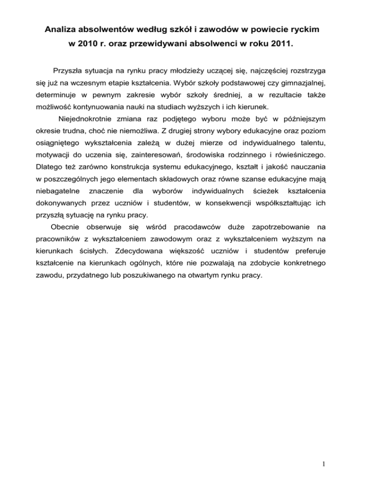 Analiza absolwentów według szkół i zawodów w powiecie ryckim w 2010 r. oraz przewidywani absolwenci w roku 2011. Przyszła sytuacja na rynku pracy młodzieży uczącej się, najczęściej rozstrzyga się już na wczesnym etapie kształcenia. Wybór szkoły podstawowej czy gimnazjalnej, determinuje w pewnym zakresie wybór szkoły średniej, a w rezultacie także możliwość kontynuowania nauki na studiach wyższych i ich kierunek. Niejednokrotnie zmiana raz podjętego wyboru może być w późniejszym okresie trudna, choć nie niemożliwa. Z drugiej strony wybory edukacyjne oraz poziom osiągniętego wykształcenia zależą w dużej mierze od indywidualnego talentu, motywacji do uczenia się, zainteresowań, środowiska rodzinnego i rówieśniczego. Dlatego też zarówno konstrukcja systemu edukacyjnego, kształt i jakość nauczania w poszczególnych jego elementach składowych oraz równe szanse edukacyjne mają niebagatelne znaczenie dla wyborów indywidualnych ścieżek kształcenia dokonywanych przez uczniów i studentów, w konsekwencji współkształtując ich przyszłą sytuację na rynku pracy. Obecnie obserwuje się wśród pracodawców duże zapotrzebowanie na pracowników z wykształceniem zawodowym oraz z wykształceniem wyższym na kierunkach ścisłych. Zdecydowana większość uczniów i studentów preferuje kształcenie na kierunkach ogólnych, które nie pozwalają na zdobycie konkretnego zawodu, przydatnego lub poszukiwanego na otwartym rynku pracy. 1 Absolwenci zarejestrowani w PUP w powiecie ryckim według szkół i zawodów w roku 2010 oraz przewidywani absolwenci w roku 2011. Nazwa szkoły Nazwa zawodu Absolwenci, którzy ukończyli szkołę w roku 2010 Przewidywani absolwenci w roku 2011 10 0 38 26 16 0 0 157 44 19 48 17 26 5 59 0 13 18 0 18 16 27 51 16 16 20 17 57 21 49 13 18 45 0 0 26 46 17 46 60 0 33 33 43 8 16 15 24 29 45 8 0 0 10 0 8 28 29 25 34 20 15 23 0 6 11 11 33 Szkoły policealne Niepubliczna Szkoła Policealna TWP - dla Dorosłych w Kłoczewie Policealne Studium Zawodowe dla Dorosłych Rolnik* Technik administracji* Technik administracji* Technik informatyk* Pierwsze Prywatne Policealne Studium Technik rachunkowości* Zawodowe dla Dorosłych w Rykach Technik handlowiec* Technik ochrony fizycznej osób i mienia* Policealna Szkoła Zawodowa dla Dorosłych Technik informatyk* Dwuletnie Policealne Studium Zawodowe dla Dorosłych Rolnik* Szkoły średnie techniczne (technika, licea zawodowe) Technikum Architektury Krajobrazu Technikum Mechaniczne Technikum Elektryczne Technikum Informatyczne Technikum Mechaniczne Technikum Informatyczne Technikum Uzupełniające Mechaniczne dla Dorosłych Technikum Budowlane Technikum Ekonomiczne Technikum Uzupełniające dla dorosłych na podbudowie zasadniczej szkoły zawodowej Technikum Gastronomiczne Technikum Ekonomiczne Technikum Hotelarskie Technikum Rolnicze Technikum Agrobiznesu Technikum Architektury Krajobrazu Technikum Uzupełniające Rolnicze dla Dorosłych Technik architektury krajobrazu* Technik mechanik* Technik elektryk* Technik informatyk* Technik mechanik* Technik mechanizacji rolnictwa* Technik informatyk* Technik mechanik* Technik pojazdów samochodowych* Technik budownictwa* Technik ekonomista* Technik budownictwa* Kucharz* Technik ekonomista* Technik hotelarstwa* Rolnik* Technik agrobiznesu* Technik architektury krajobrazu* Rolnik* Licea ogólnokształcące II Liceum Profilowane Bez zawodu II Liceum Profilowane Bez zawodu Liceum Ogólnokształcące Bez zawodu Uzupełniające Liceum Ogólnokształcące dla Dorosłych w Dęblinie Bez zawodu Liceum Ogólnokształcące dla Dorosłych w Dęblinie Bez zawodu Liceum Ogólnokształcące dla Dorosłych Bez zawodu 2 Uzupełniające Liceum Ogólnokształcące dla Dorosłych I LICEUM OGÓLNOKSZTAŁCĄCE IM. MARII SKŁODOWSKIEJ-CURIE Liceum Ogólnokształcące 2-letnie uzupełniające liceum ogólnokształcące dla dorosłych III Liceum Ogólnokształcące LICEUM OGÓLNOKSZTAŁCĄCE II Liceum Ogólnokształcące Liceum Ogólnokształcące OGÓLNOKSZTAŁCĄCE LICEUM LOTNICZE Bez zawodu 64 73 Bez zawodu Bez zawodu 122 0 118 26 Bez zawodu Bez zawodu Bez zawodu Bez zawodu Bez zawodu 0 0 137 72 0 9 28 146 65 33 Bez zawodu 49 61 31 16 24 7 32 30 15 28 0 0 0 7 0 0 32 7 24 3 1 0 1 19 1 1 1 0 4 0 0 0 3 1 0 0 Zasadnicze szkoły zawodowe Zasadnicza Szkoła Zawodowa Zasadnicza Szkoła Zawodowa Nr1 Elektromechanik pojazdów samochodowych* Fryzjer* Mechanik pojazdów samochodowych* Mechanik - operator pojazdów i maszyn rolniczych* Zasadnicza Szkoła Zawodowa Murarz* Monter instalacji i urządzeń sanitarnych* Technolog robót wykończeniowych w budownictwie* Stolarz* Kucharz małej gastronomii* Fryzjer* Sprzedawca* Murarz* Lakiernik* Zasadnicza Szkoła Zawodowa Nr 2 Mechanik pojazdów samochodowych* Rzeźnik - wędliniarz* Cukiernik* Piekarz* Opracowano na podstawie tablicy 4.1 z raportu za rok 2010 dla PUP w Rykach. W roku 2010 największa ilość absolwentów ukończyła: licea ogólnokształcące – 45% wszystkich absolwentów, ponadto szkoły średnie techniczne (technika, licea zawodowe) – 32%, - zasadnicze szkoły zawodowe – 12% oraz szkoły policealne dla dorosłych – 11%. Osoby kończące naukę w liceach, to w 100% osoby bez zawodu. Absolwentami techników, były w zdecydowanej większości osoby które uzyskały zawód technik ekonomista, technik hotelarstwa oraz technik informatyk (w sumie ponad 35%). Absolwenci zasadniczych szkół zawodowych uzyskiwali najczęściej zawód: elektromechanik pojazdów samochodowych (20%), murarz (18%), kucharz małej gastronomii (15%) oraz fryzjer (12%). Prognozy na 2011 r. wskazują na bardzo dużą dynamikę wzrostu absolwentów szkół policealnych dla dorosłych (wzrost o 270%), spowodowaną koniecznością lub 3 chęcią uzyskania świadectwa maturalnego przez osoby dorosłe. Największa przewidywana dynamika wzrostu absolwentów szkół policealnych dla dorosłych w roku 2011 dotyczy zawodów: technik administracj