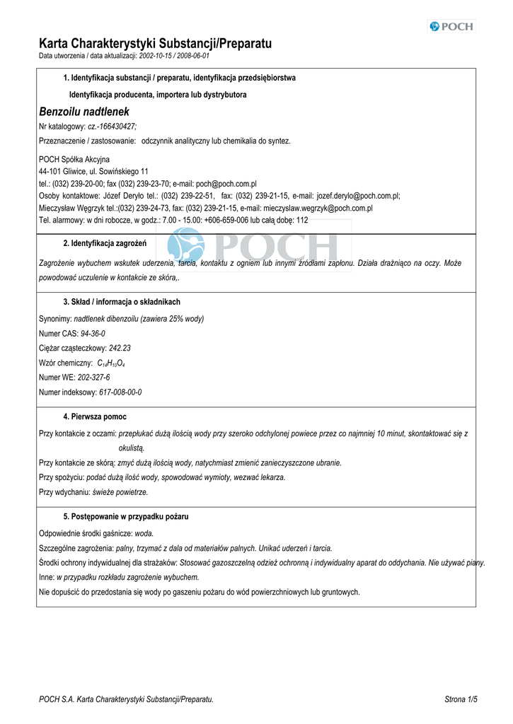 Karta Charakterystyki Substancji/Preparatu Data utworzenia / data aktualizacji: 2002-10-15 / 2008-06-01 1. Identyfikacja substancji / preparatu, identyfikacja przedsiębiorstwa Identyfikacja producenta, importera lub dystrybutora Benzoilu nadtlenek Nr katalogowy: cz.-166430427; Przeznaczenie / zastosowanie: odczynnik analityczny lub chemikalia do syntez. POCH Spółka Akcyjna 44-101 Gliwice, ul. Sowińskiego 11 tel.: (032) 239-20-00; fax (032) 239-23-70; e-mail: [email protected] Osoby kontaktowe: Józef Deryło tel.: (032) 239-22-51, fax: (032) 239-21-15, e-mail: [email protected]; Mieczysław Węgrzyk tel.:(032) 239-24-73, fax: (032) 239-21-15, e-mail: [email protected] Tel. alarmowy: w dni robocze, w godz.: 7.00 - 15.00: +606-659-006 lub całą dobę: 112 2. Identyfikacja zagrożeń Zagrożenie wybuchem wskutek uderzenia, tarcia, kontaktu z ogniem lub innymi źródłami zapłonu. Działa drażniąco na oczy. Może powodować uczulenie w kontakcie ze skóra,. 3. Skład / informacja o składnikach Synonimy: nadtlenek dibenzoilu (zawiera 25% wody) Numer CAS: 94-36-0 Ciężar cząsteczkowy: 242.23 Wzór chemiczny: C14H10O4 Numer WE: 202-327-6 Numer indeksowy: 617-008-00-0 4. Pierwsza pomoc Przy kontakcie z oczami: przepłukać dużą ilością wody przy szeroko odchylonej powiece przez co najmniej 10 minut, skontaktować się z okulistą. Przy kontakcie ze skórą: zmyć dużą ilością wody, natychmiast zmienić zanieczyszczone ubranie. Przy spożyciu: podać dużą ilość wody, spowodować wymioty, wezwać lekarza. Przy wdychaniu: świeże powietrze. 5. Postępowanie w przypadku pożaru Odpowiednie środki gaśnicze: woda. Szczególne zagrożenia: palny, trzymać z dala od materiałów palnych. Unikać uderzeń i tarcia. Środki ochrony indywidualnej dla strażaków: Stosować gazoszczelną odzież ochronną i indywidualny aparat do oddychania. Nie używać piany. Inne: w przypadku rozkładu zagrożenie wybuchem. Nie dopuścić do przedostania się wody po gaszeniu pożaru do wód powierzchniowych lub gruntowych. POCH S.A. Karta Charakterystyki Substancji/Preparatu. Strona 1/5 Benzoilu nadtlenek 6. Postępowanie w przypadku niezamierzonego uwolnienia do środowiska Unikać kontaktu z substancją. Ostrożnie zebrać na sucho. Przekazać do likwidacji. Oczyścić zanieczyszczony teren. Nie dopuścić do dostania się do wód, ścieków i gleby. 7. Postępowanie z substancją / preparatem i jej / jego magazynowanie Obchodzenie się z substancją: Zapewnić skuteczną wymianę powietrza (wentylacja). Postępować zgodnie z zasadami dobrej praktyki przemysłowej oraz ogólnymi zasadami bezpieczeństwa i higieny pracy z substancjami chemicznymi. Stosować środki ochrony osobistej zgodnie z pkt.8. Nie opróżniać do kanalizacji. Unikać długotrwałego lub wielokrotnego kontaktu ze skórą. Magazynowanie: szczelne opakowania, dobrze wentylowane pomieszczenie. W temperaturze pokojowej (zalecane +15 do +25°C). Trzymać osobno lub razem tylko z innymi nadtlenkami organicznymi. Przechowywać z dala od źródeł ognia lub ciepła. Rozporządzenie Ministra Zdrowia z dnia 14 marca 2003 r. w sprawie sposobu oznakowania miejsc, rurociągów oraz pojemników i zbiorników służących do przechowywania lub zawierających substancje niebezpieczne lub preparaty niebezpieczne (Dz.U.03.61.552) 8. Kontrola narażenia i środki ochrony indywidualnej Paramerty kontroli (NDS, NDSCh, NDSP): NDS: 5 mg/m3, NDSCh: 10 mg/m3 Stosować odpowiednią wentylację wywiewną, miejscową i ogólną zapewniającą utrzymanie stężenia produktu w powietrzu poniżej określonych limitów. Zaleca się wyposażenie miejsca pracy w wodny natrysk do płukania oczu oraz prysznic. Środki ochrony indywidualnej powinny być tak zaprojektowane i wykonane aby wykluczały zagrożenie i inne niedogodności w przewidywanych warunkach użytkowania, chroniące przed chemikaliami. Środki ochrony indywidualnej: ochrona dróg oddechowych: konieczna - respirator ochrona oczu: konieczna - okulary ochronne typu gogle ochrona rąk: konieczna - rękawice ochronne odporne na działanie chemikaliów wykonane z gumy nitrylowej lub inne dopuszczone przez producenta rękawic do kontaktu z tym produktem. Czas wytrzymałości materiału określa producent rękawic. ochrona ciała: konieczna - ubranie ochronne środki ochronne i higieny: natychmiast zmienić zanieczyszczone ubranie. Wymyć ręce i twarz po pracy z tą substancją. Stosować krem barierowo-ochronny do skóry. Rozporządzenie Ministra Zdrowia z dnia 30 grudnia 2004 r. w sprawie bezpieczeństwa i higieny pracy związanej z występowaniem w miejscu pracy czynników chemicznych (Dz.U.05.11.86). Rozporządzenie Ministra Pracy i Polityki Społecznej z dnia 30 sierpnia 2007 (Dz. U. nr 161, poz. 1142) POCH S.A. Karta Charakterystyki Substancji/Preparatu. Strona 2/5 Benzoilu nadtlenek 9. Właściwości fizyczne i chemiczne Forma: ciało stałe lepkość dynamiczna: Kolor: biały lepkość kinematyczna: Zapach: gorzkich migdałów Ciśnienie par: brak danych pH: brak danych Gęstość: 0,53 g/cm3 (20°C) Temperatura topnienia: 100 - 105°C z rozkładem Ciężar nasypowy: 500 - 600 kg/m3 Temperatura wrzenia: nie dotyczy Rozpuszczalność: Temperatura samozapłonu: > 380°C w wodzie: prawie nierozpuszczalny Temperatura zapłonu: brak danych w rozpuszczalnikach organicznych: brak danych Granice wybuchowości: brak danych log P(w/o): 3,46 dolna: górna: 10. Stabilność i reaktywność Warunki których należy unikać: temperatury powyżej temperatury topnienia (wybuchowy rozkład). Materiały których należy unikać: alkohole, aminy, inicjatory polimeryzacji, reduktory, alkalia, kwasy organiczne i nieorganiczne. Stabilizowany wodą. Niebezpieczne produkty rozkładu: brak. Następne dane: czuły na uderzenia i tarcie (niebezpieczeństwo wybuchu). 11. Informacje toksykologiczne Informacje toksykologiczne: LD50 (doustnie szczury): 7710 mg/kg. LC50(wdychanie, szczur):> 24,3 mg/l/4h. Pozostałe dane: